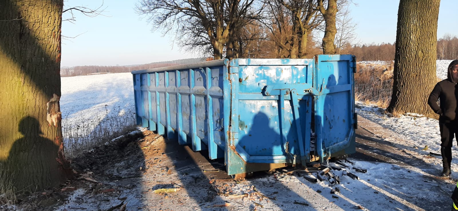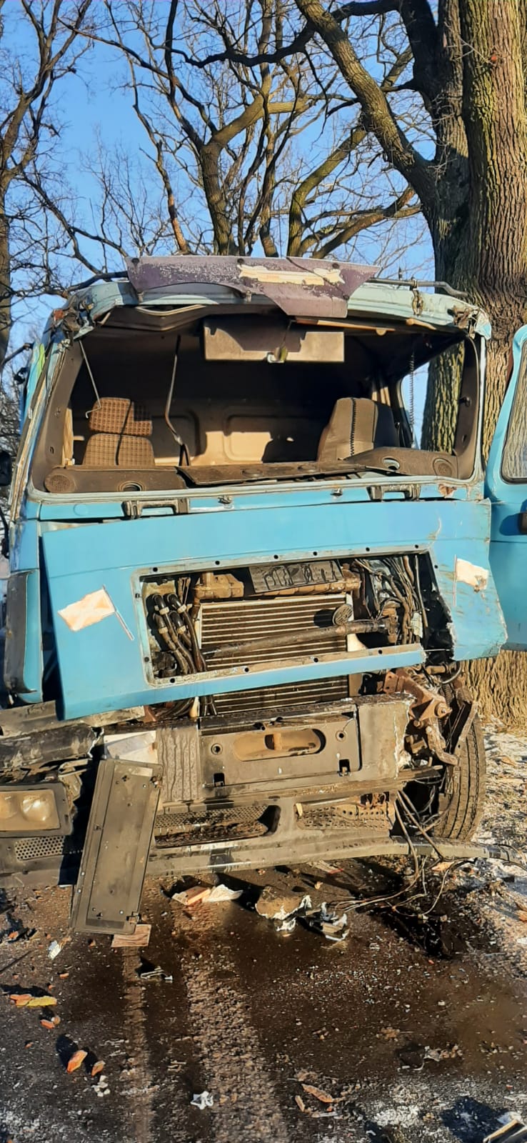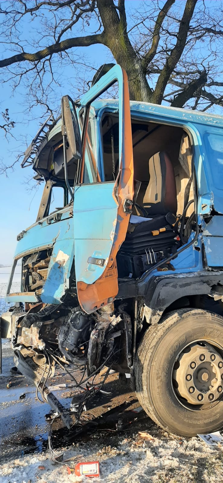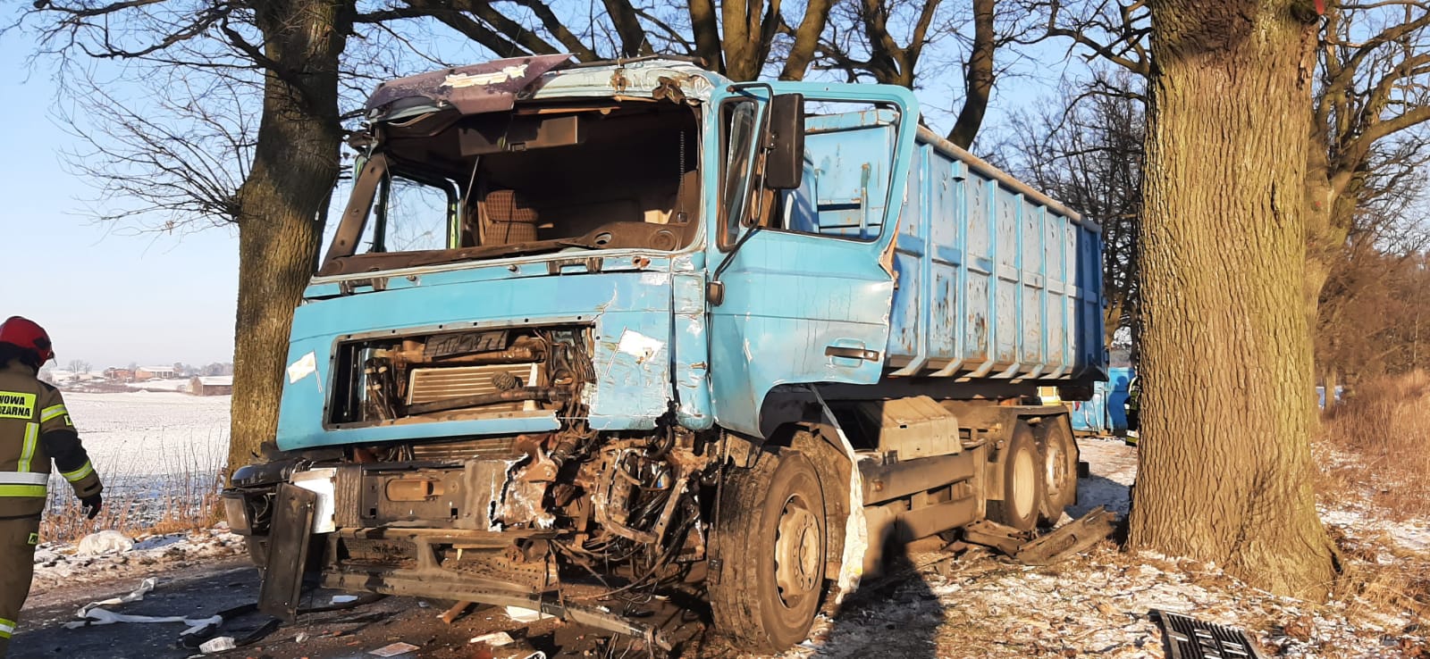 10 stycznia 2022r. o godzinie 9.05 nowomiejscy strażacy odebrali zgłoszenie o wypadku samochodu ciężarowego na drodze powiatowej w Piotrowicach gmina Biskupiec. Wypadek wyglądał poważnie, zniszczona i zdeformowana kabina kierowcy, uwięziony w kabinie kierowca, który nie może jej samodzielnie opuścić, kontener na jezdni blokujący przejazd, to pierwsze ustalenia strażaków przybyłych na miejsce wypadku. Widząc zastaną sytuację strażacy niezwłocznie przystąpili do działania. Przy pomocy narzędzi hydraulicznych najpierw zostały otwarte drzwi kierowcy, które w wyniku uderzenia samochodu w drzewo zostały zablokowane, następnie strażacy używając tych narzędzi uwolnili zakleszczoną w pedałach nogę kierowcy. Przez cały czas działań zakleszczony kierowca otrzymywał od strażaków wsparcie psychiczne. Uwolnionego po kilku minutach kierowcę przekazano przybyłemu na miejsce zdarzenia Zespołowi Ratownictwa Medycznego. Na szczęście kierowca nie odniósł poważnych obrażeń. Po dojeździe kolejnych zastępów straży pożarnej zabezpieczono uszkodzony samochód ciężarowy przed ewentualnym zapaleniem oraz rozlaniem się płynów eksploatacyjnych na jednię i do gruntu, zabezpieczono ładunek na przyczepie samochodu oraz zabezpieczono kontener leżący na środku jezdni, który w wyniku uderzenia wypadł z przyczepy.