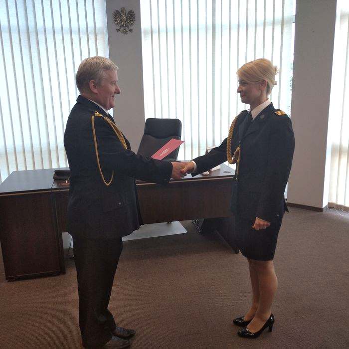 p.o. Komendant Powiatowy PSP bryg. Janusz Leszczewski wręczył akt nadania stopnia oraz świadectwo potwierdzające kwalifikacje w zawodzie absolwentce Szkoły Aspirantów PSP w Poznaniu, jednocześnie gratulując zdobycia tytułu technika pożarnictwa oraz życząc dalszych sukcesów w służbie.