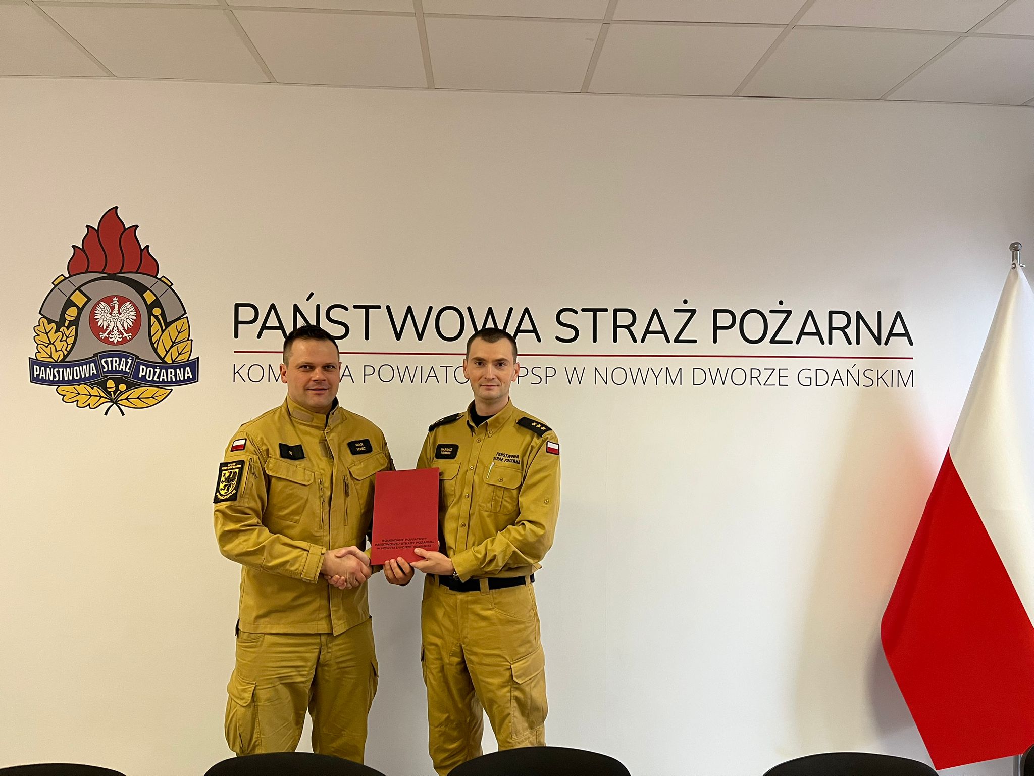 30 stycznia br. na terenie Komendy Powiatowej PSP w Nowym Dworze Gdańskim Komendant Powiatowy kpt. Mariusz Reimus wręczył list gratulacyjny wraz z informacją o przyznaniu nagrody jubileuszowej za 20 lat pracy i służby asp. Karolowi Szwecowi. Gratulujemy oraz życzymy dalszych sukcesów w życiu prywatnym i zawodowym.