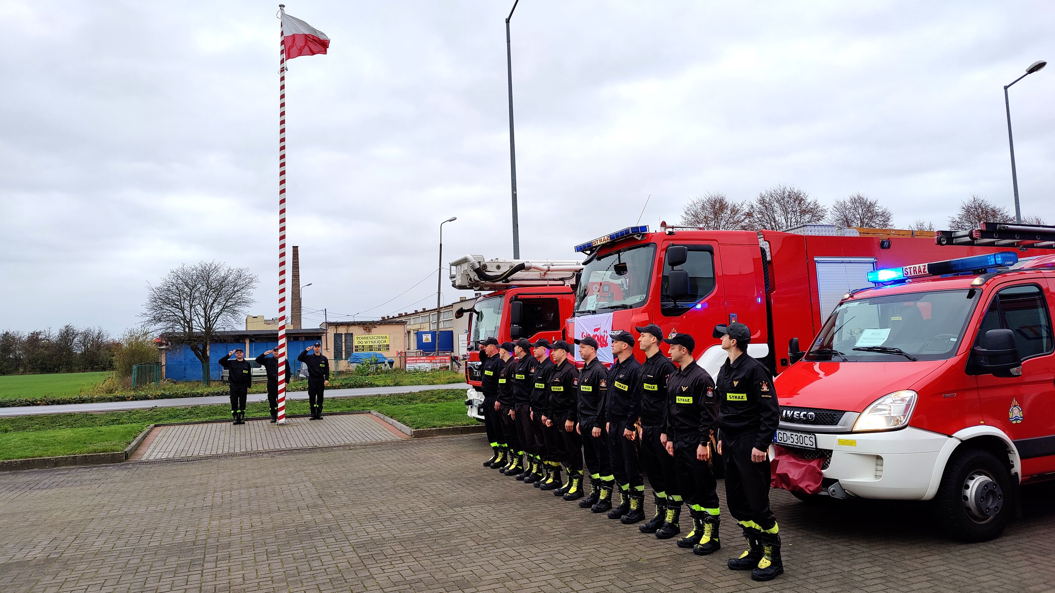 Strażacy z JRG w Nowym Dworze Gdańskim podczas zmiany służby uczcili wciągnięciem flagi na maszt Narodowe Świętę Niepodległości w dniu 11 listopada 2022r.