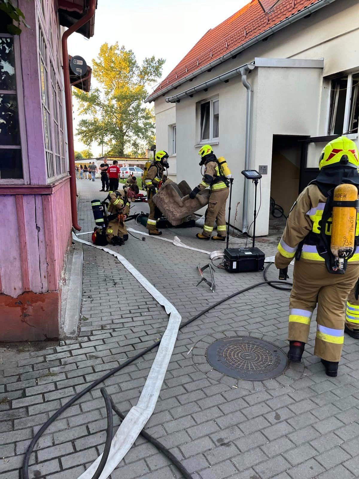 12.08.2024r. o godzinie 19:22 do Stanowiska Kierowania Komendanta Powiatowego PSP w Nowym Dworze Gdańskim wpłynęło zgłoszenie o pożarze budynku mieszkalnego na ulicy Plac Wolności w Nowym Dworze Gdańskim. Na miejsce zadysponowanych zostało łącznie 5 zastępów straży pożarnej. W pomieszczeniu na pierwszym piętrze uwięziona była osoba poszkodowana, która nie miała możliwości opuszczenia budynku o własnych siłach. Działania strażaków polegały na zabezpieczeniu miejsca zdarzenia, ewakuacji osoby poszkodowanej przez okno przy pomocy podnośnika hydraulicznego, rozwinięciu dwóch linii gaśniczych w celu ugaszenia pożaru i oddymieniu pomieszczeń. Osoba poszkodowana została przekazana zespołowi ratownictwa medycznego, a następnie przetransportowana do szpitala.
