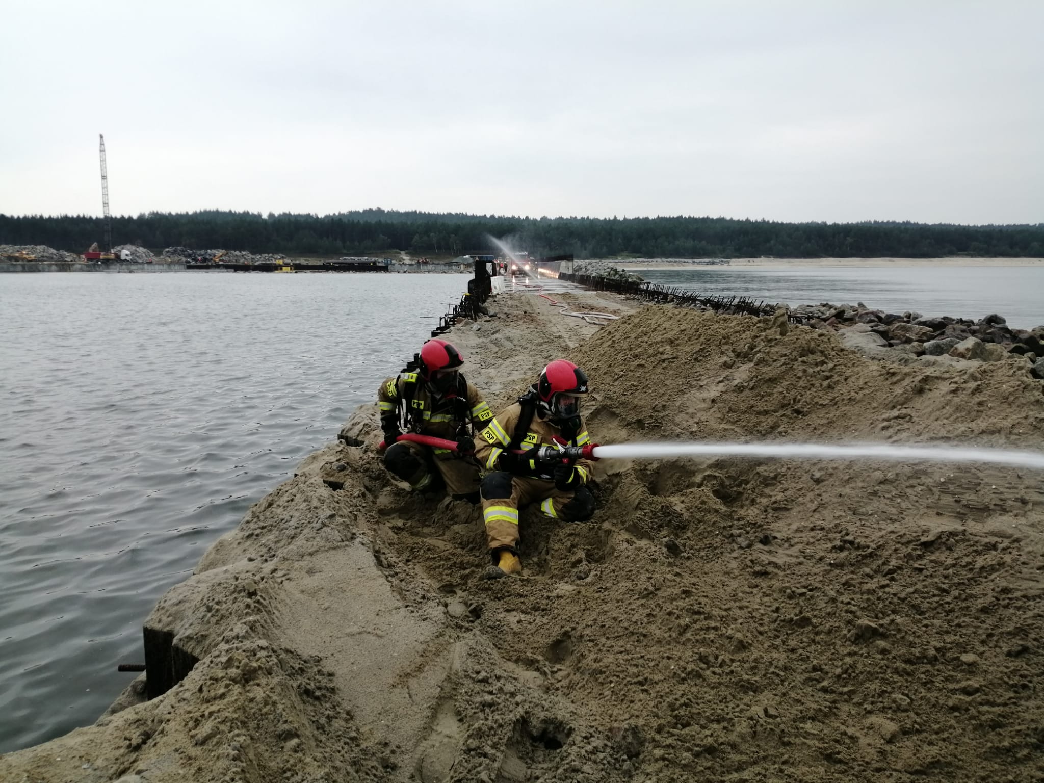 16.09.2021r. o godzinie 8:20 na terenie budowy przekopu Mierzei Wiślanej doszło do zapalenia się przewodów od gazów technicznych (acetylen i tlen), które umieszczone były w wózku transportowym. Zdarzenie miało miejsce na falochronie. Pracownicy wykonujący prace hydrotechniczne opuścili miejsce pożaru przed przybyciem zastępów straży pożarnej. Po dojeździe na miejsce strażacy przystąpili do zabezpieczenia miejsca zdarzenia, wyznaczenia strefy bezpiecznej w odległości około 200 metrów, podania jednego prądu wody w SODO w natarciu na palące się węże co pozwoliło zlokalizować pożar, następnie przystąpiono do schładzania butli i kontrolowania ich temperatury.