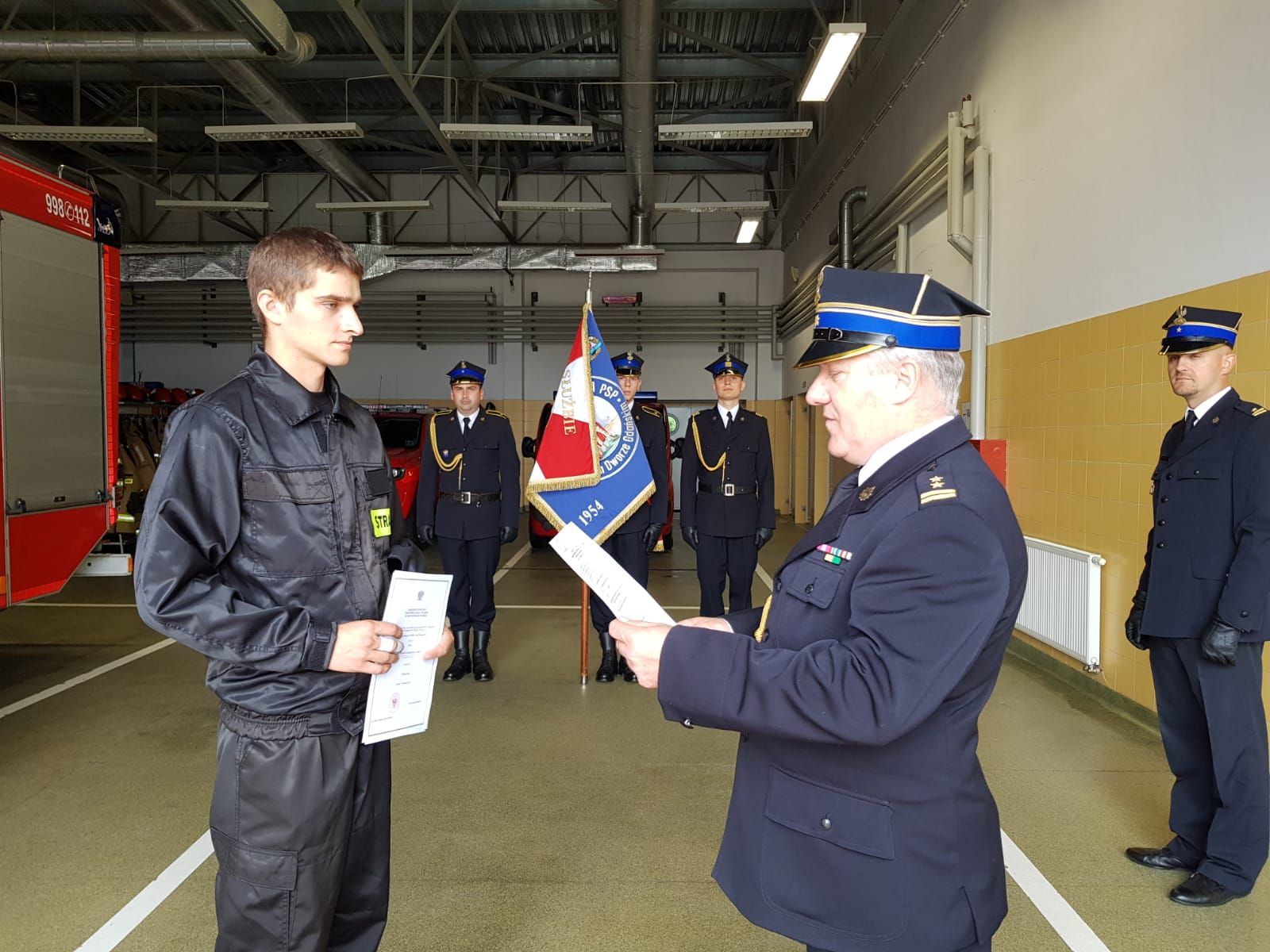 Akt ślubowania wręczył bryg. Janusz Leszczewski Komendant Powiatowy PSP w Nowym Dworze Gdańskim, życząc wielu sukcesów zawodowych wstępującemu w szeregi Państwowej Straży Pożarnej funkcjonariuszowi.