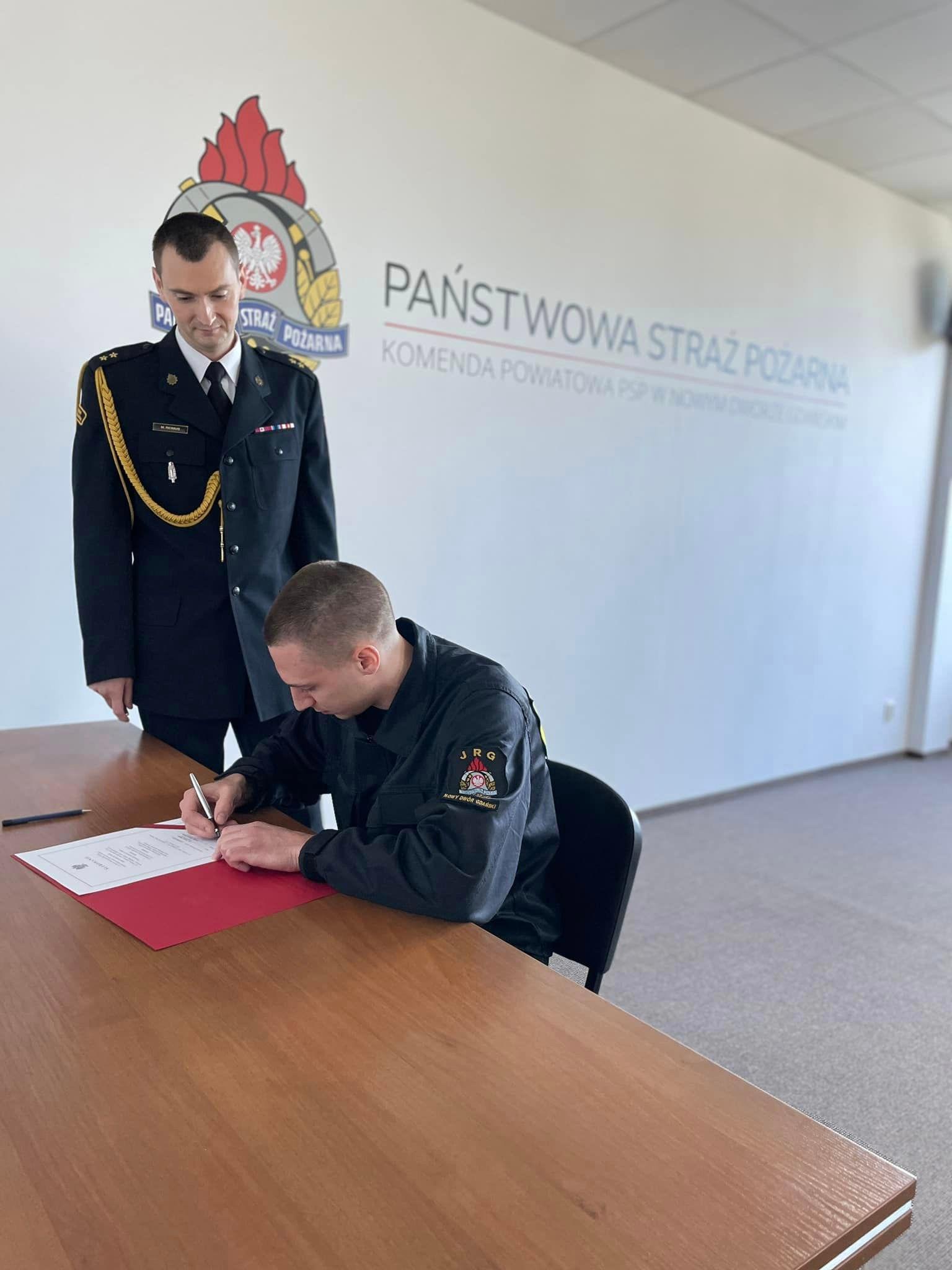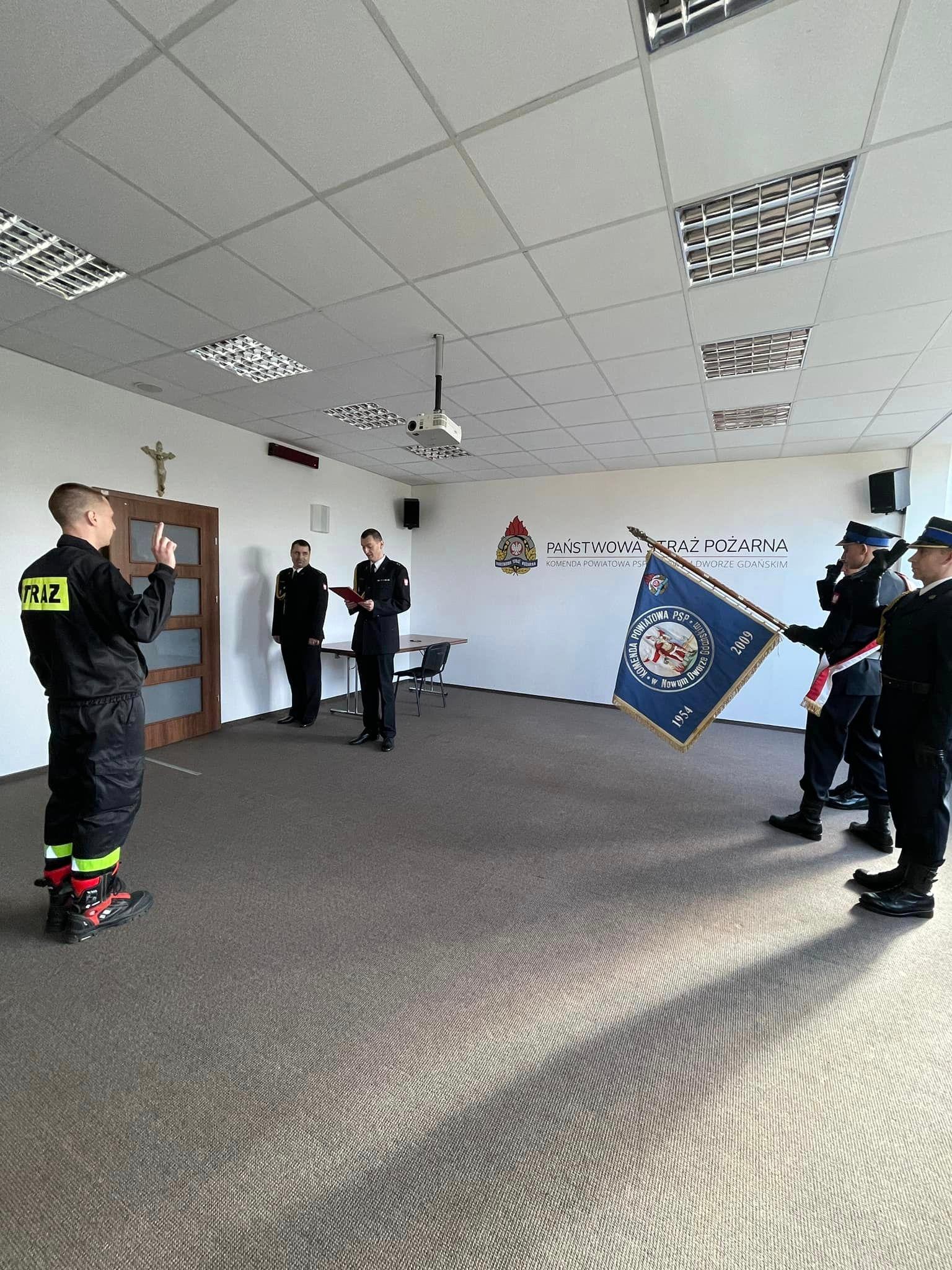 11 kwietnia 2024 roku w siedzibie Komendy Powiatowej PSP w Nowym Dworze Gdańskim odbyła się uroczysta zbiórka, podczas której ślubowanie strażaka Państwowej Straży Pożarnej złożył jeden nowo przyjęty stażysta – str. Tomasz Wójcik. Ślubowanie, zgodnie z przyjętym ceremoniałem, przyjął komendant powiatowy Państwowej Straży Pożarnej w Nowym Dworze Gdańskim mł. kpt. Mariusz Reimus. Złożenie ślubowania jest bardzo doniosłym momentem w życiu każdego strażaka, które włącza go do służby cieszącej się wysokim zaufaniem społecznym.
