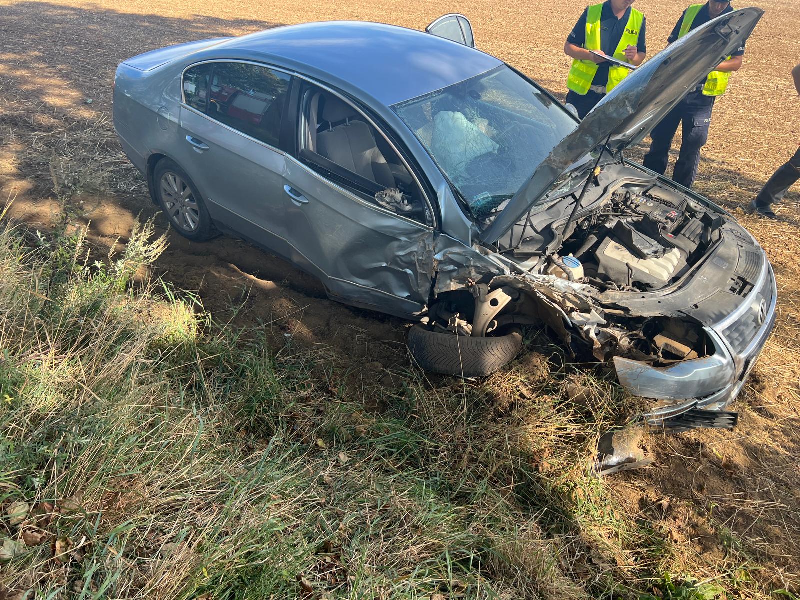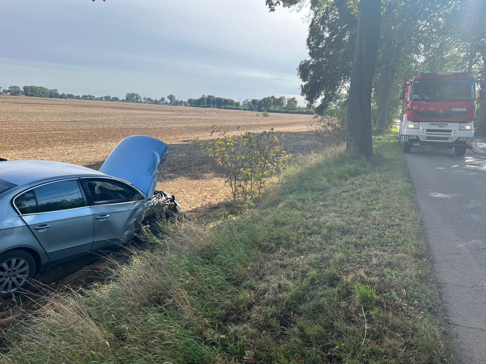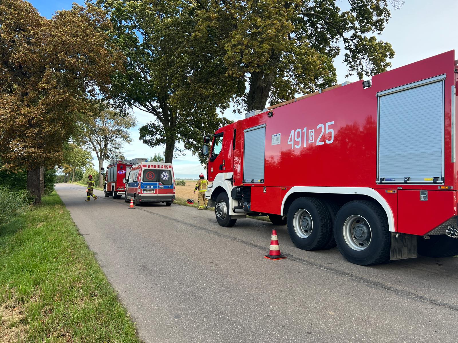 Po dojeździe na miejsce zdarzenie strażacy potwierdzili, że samochód osobowy znajduje się na poboczu drogi (polu) po wcześniejszym uderzeniu w drzewo. Jedna osoba poszkodowana o własnych siłach opuściła pojazd, uskarżała się na ból lewej kończyny górnej. Działania strażaków polegały na zabezpieczeniu miejsca zdarzenie, odłączeniu akumulatora oraz udzieleniu kwalifikowanej pierwszej pomocy osobie poszkodowanej.