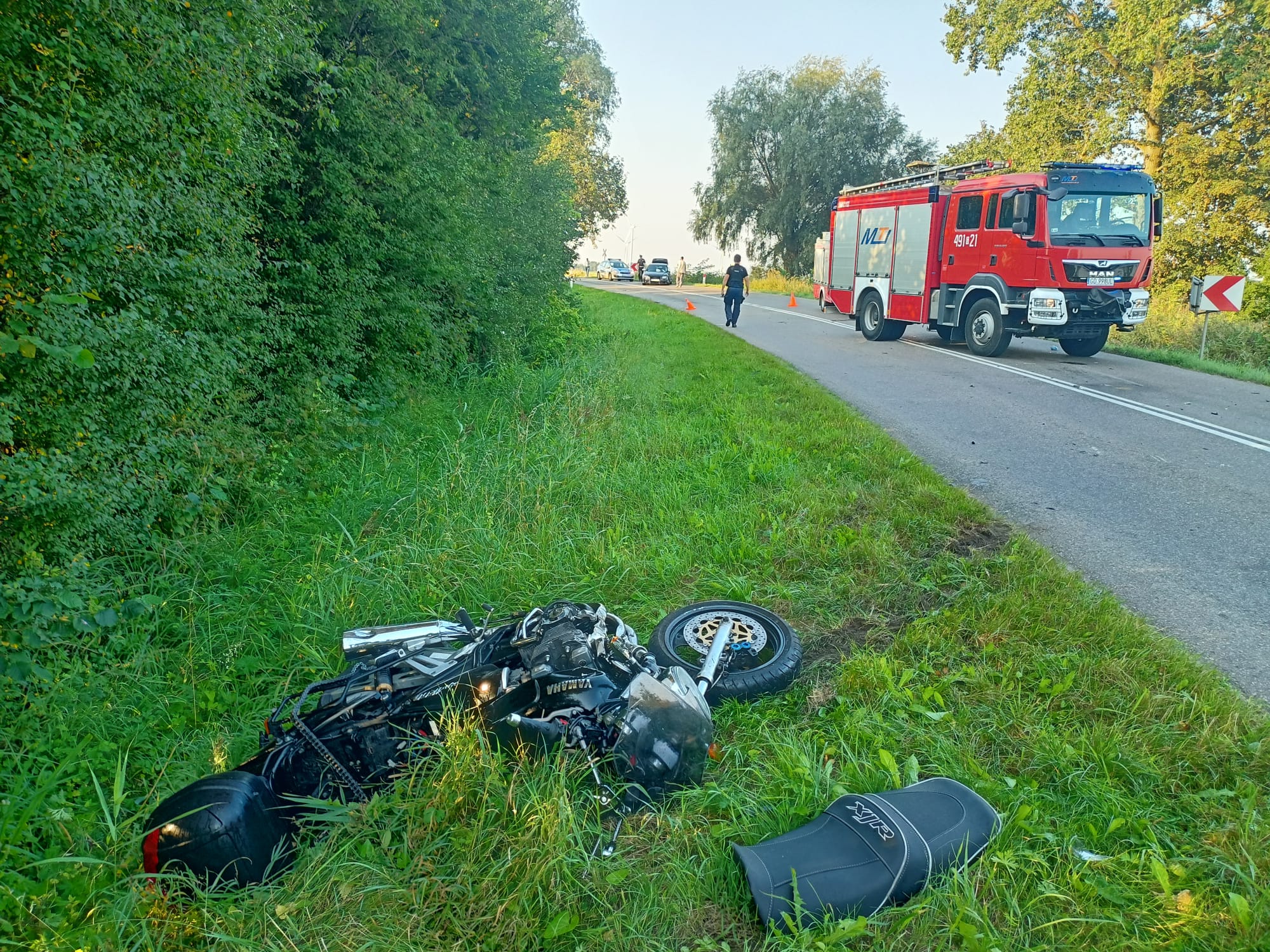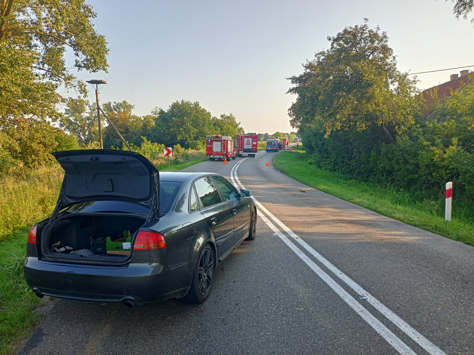 Dzień wcześniej, t.j. 27.08.2022 również w miejscowości Tujsk doszło do zderzenia samochodu osobowego z motocyklem. W wyniku czego motocyklista i jego pasażerka odnieśli obrażenia. W działaniach udział brały 2 zastępy JRG Nowy Dwór Gdański oraz 1 zastęp OSP Tujsk.