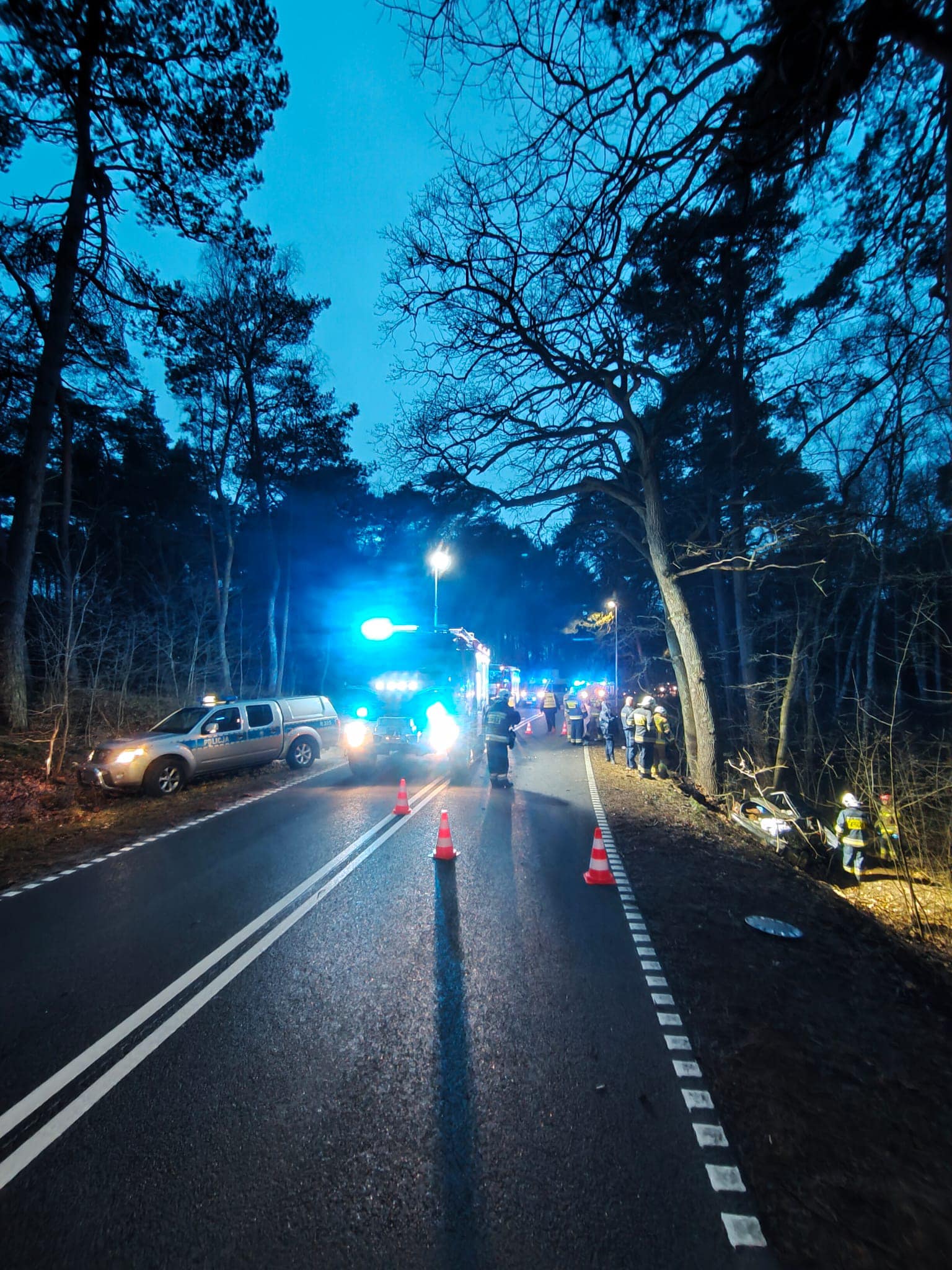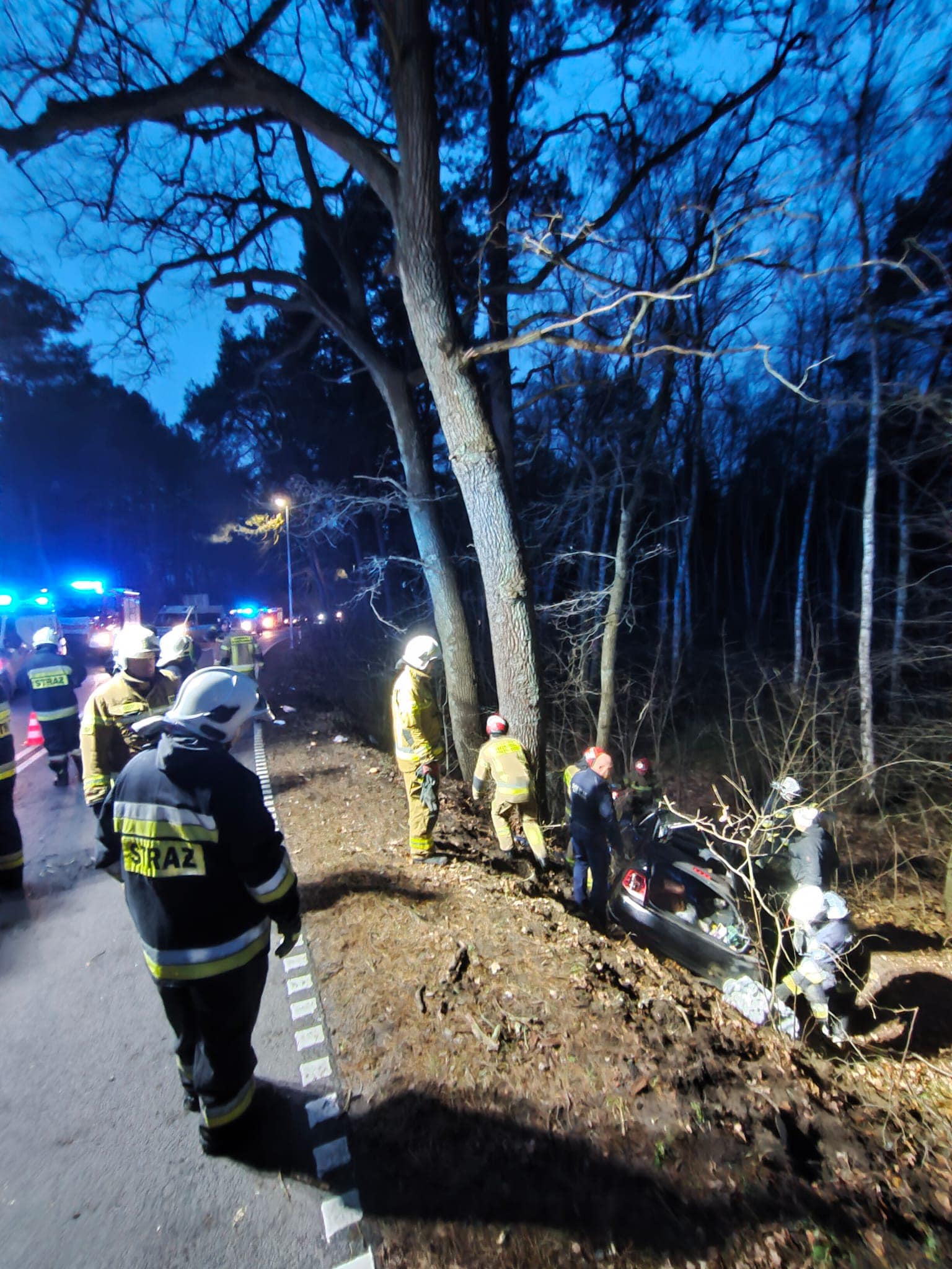 22 grudnia 2024 roku o godzinie 7:21 Dyżurna Stanowiska Kierowania Komendanta Powiatowego PSP w Nowym Dworze Gdańskim otrzymała zgłoszenie o wypadku drogowym z udziałem samochodu osobowego na drodze wojewódzkiej nr 501 na trasie Sztutowo - Kąty Rybackie. W wyniku zdarzenia kierujący samochodem osobowym po uderzeniu w drzewo, wpadł do rowu. Pojazdem podróżowały dwie osoby. Działania strażaków polegały na zabezpieczeniu miejsca zdarzenia, odłączeniu akumulatora w pojeździe, ewakuacji osoby poszkodowanej z pojazdu oraz przekazaniu jej przybyłemu na miejsce zdarzenia ZRM, kierowaniu ruchem drogowym i uprzątnięciu jezdni. Droga w miejscu zdarzenia była całkowicie zablokowana.