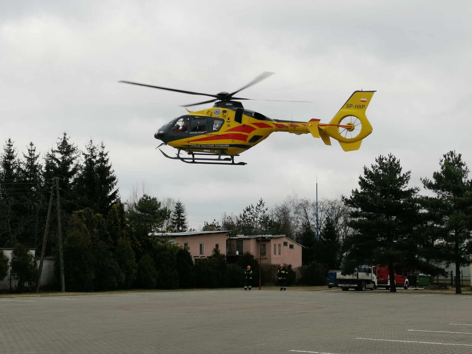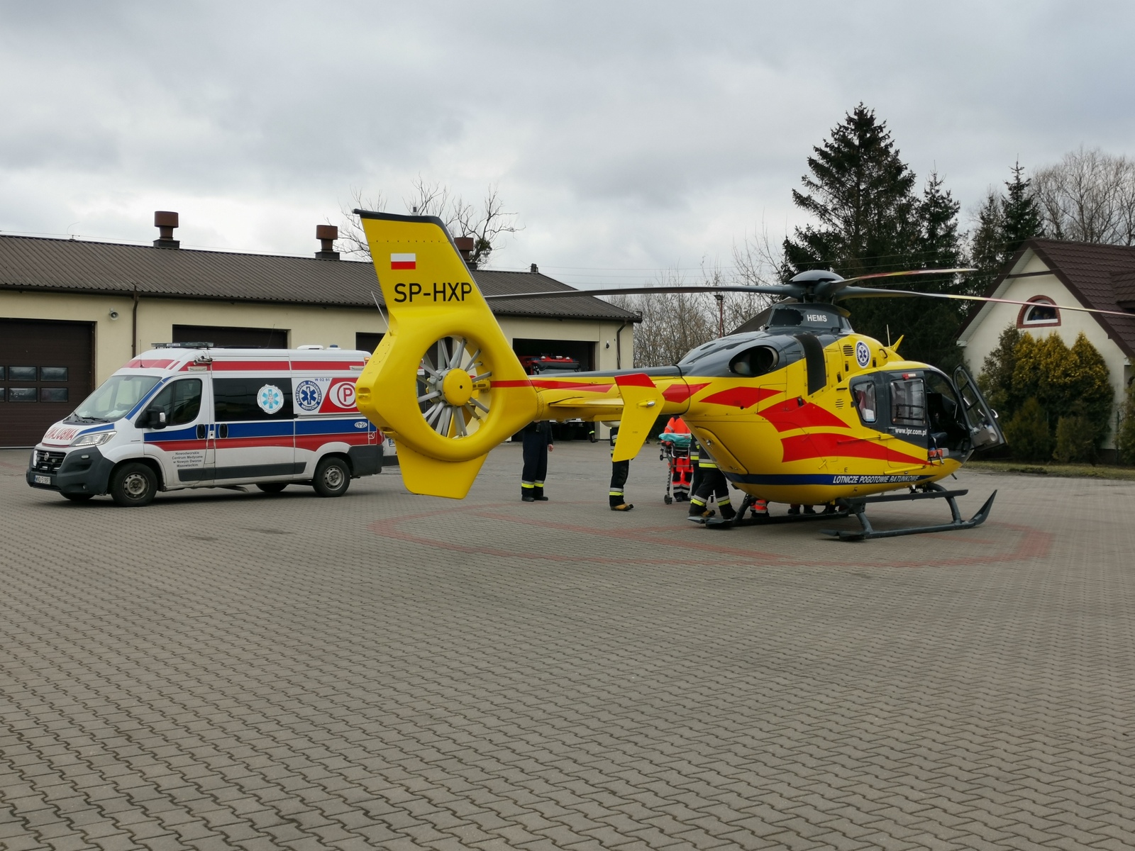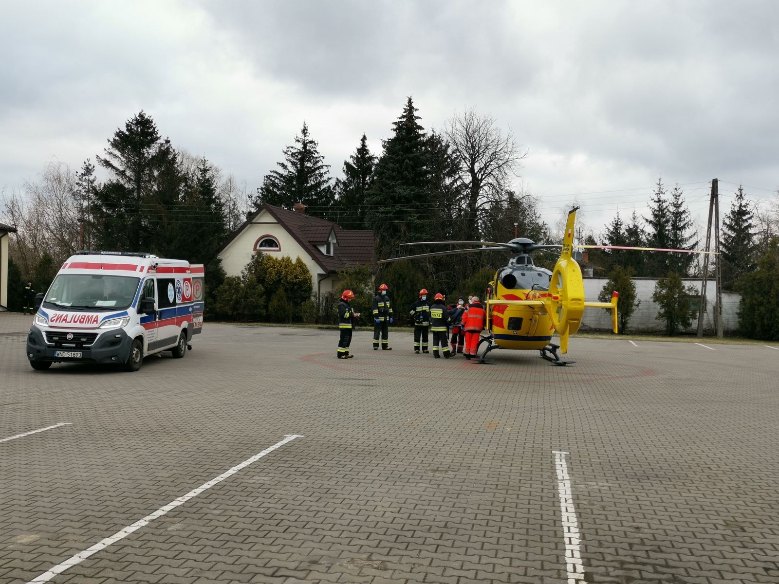 Lądowanie śmigłowca Lotniczego Pogotowia Ratunkowego na placu KP PSP w Nowym Dworze Mazowieckim