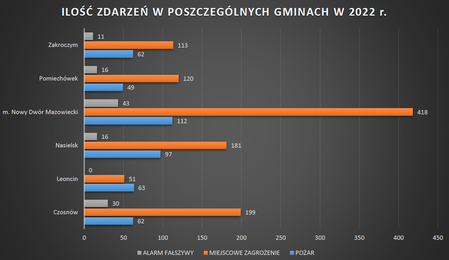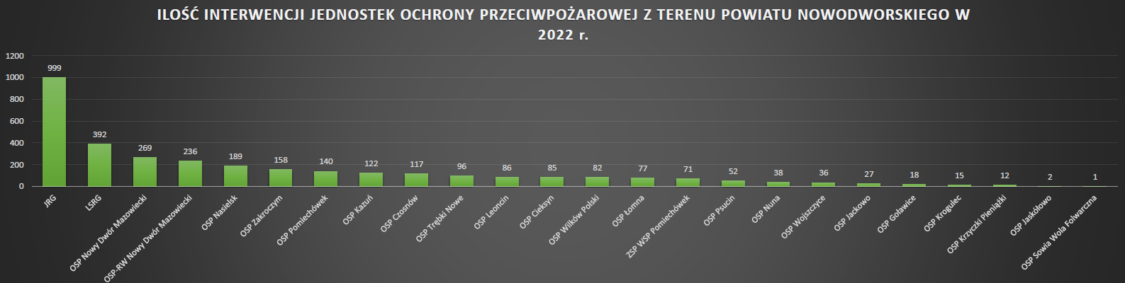Komenda Powiatowa Państwowej Straży Pożarnej w Nowym Dworze Mazowieckim, w roku 2022 odnotowała 1682 zdarzeń, co stanowi nieznaczny wzrost w porównaniu do roku poprzedniego o 38 interwencji.