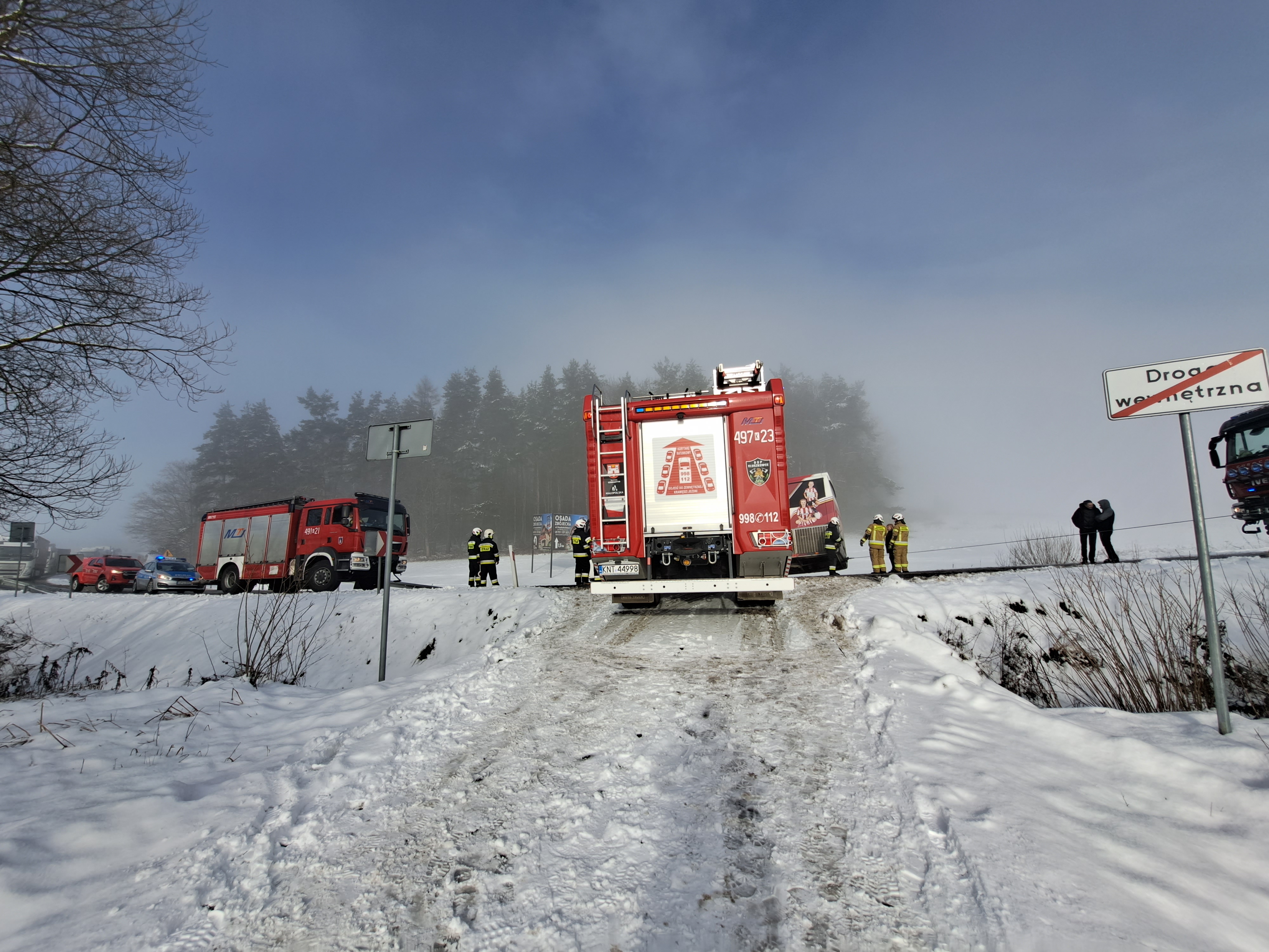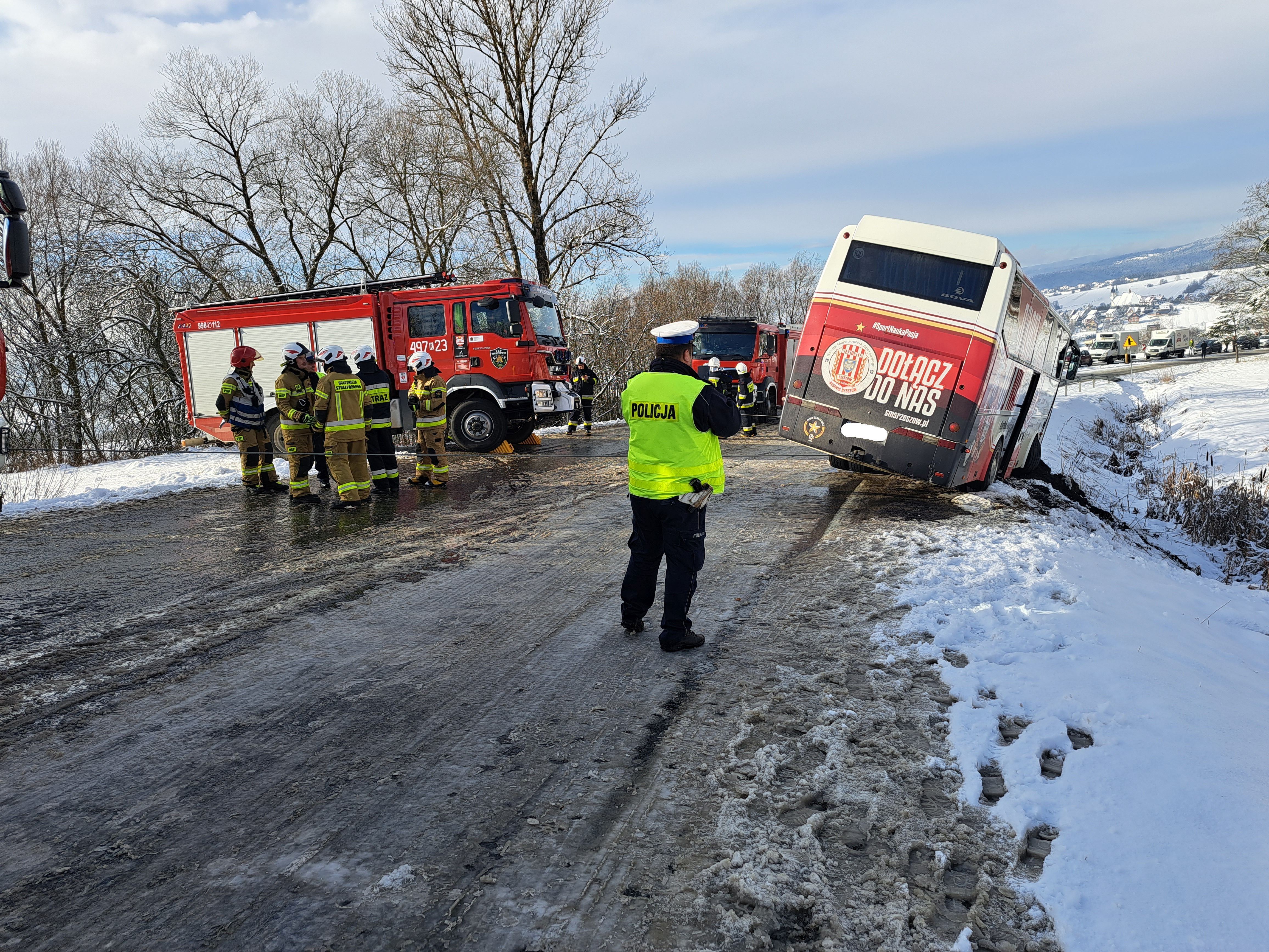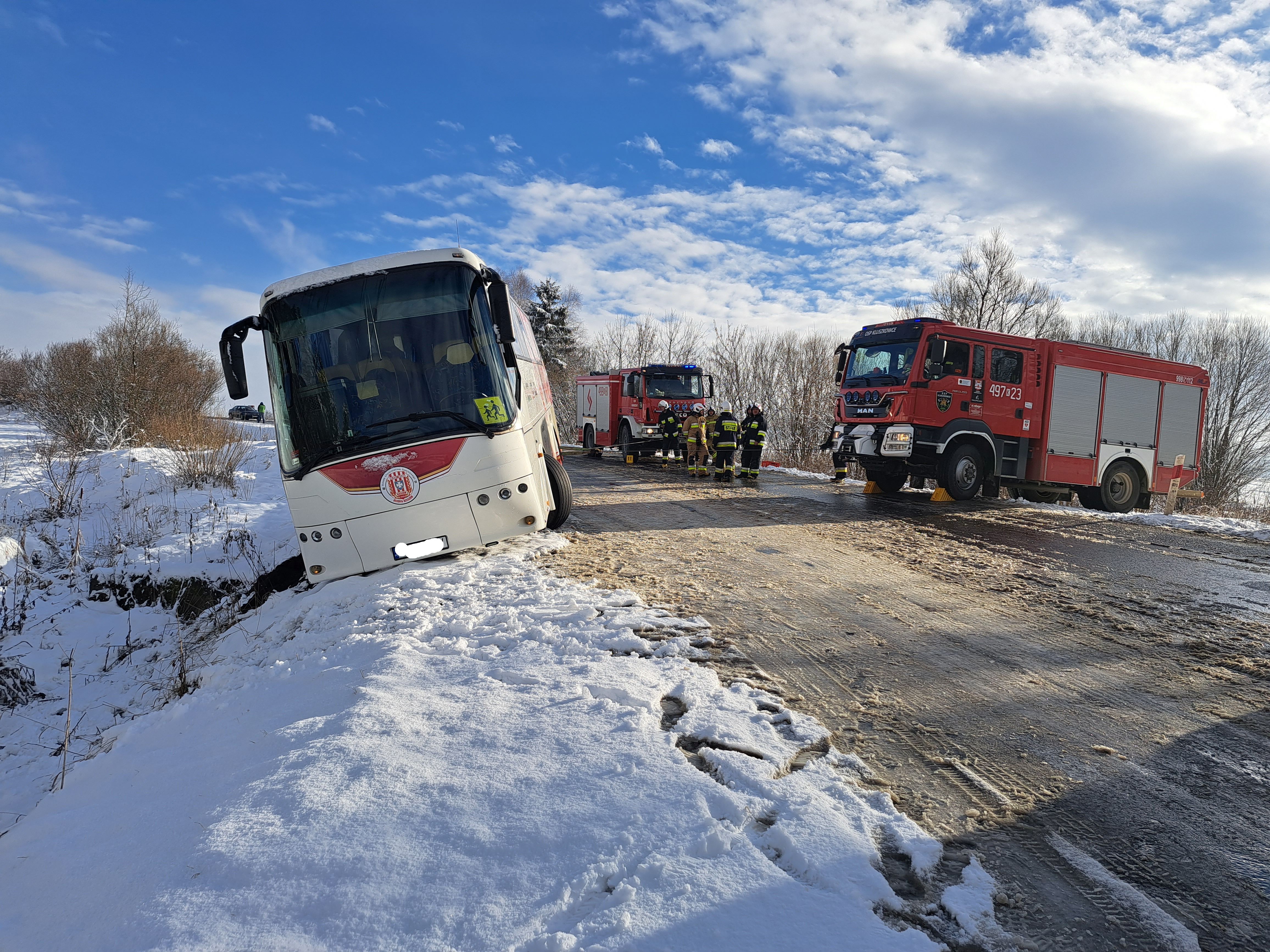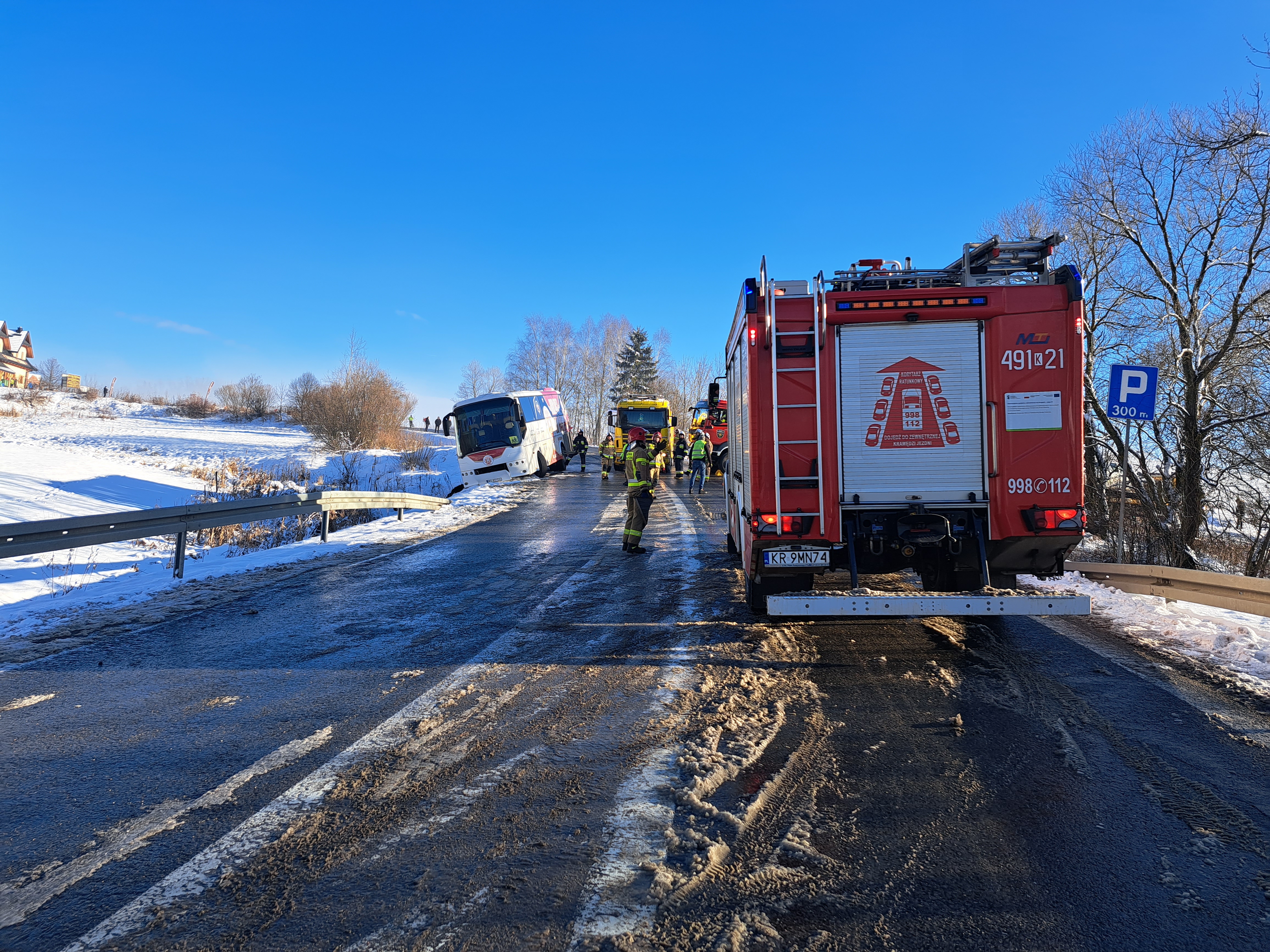 Z powodu nagłego załamania pogody i związanych z tym gwałtownymi opadami śniegu autobus z wycieczką poruszający się w kierunku Nowego Targu na górze "Snozka" w wyniku utraty przyczepności zawisł na krawędzi drogi i groził przewróceniem. Przybyłe na miejsce zastępy straży zabezpieczyły pojazd linami co umożliwiło przeprowadzenie bezpiecznej ewakuacji 21 dzieci wraz z opiekunami. Po przyjeździe na miejsce holownika pomocy drogowej udało się bezpiecznie wyciągnąć pojazd na drogę. Dzieci w tym czasie znalazły schronienie w budynku Zajazdu przy parkingu na górze "Snozka" za co dziękujemy właścicielom.