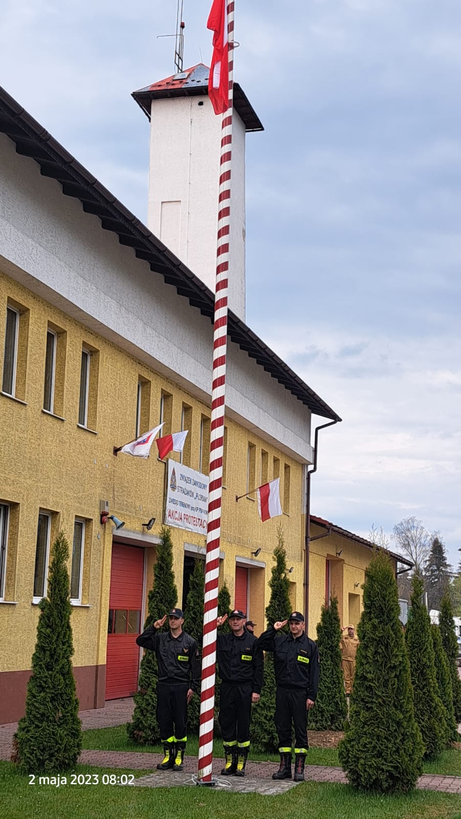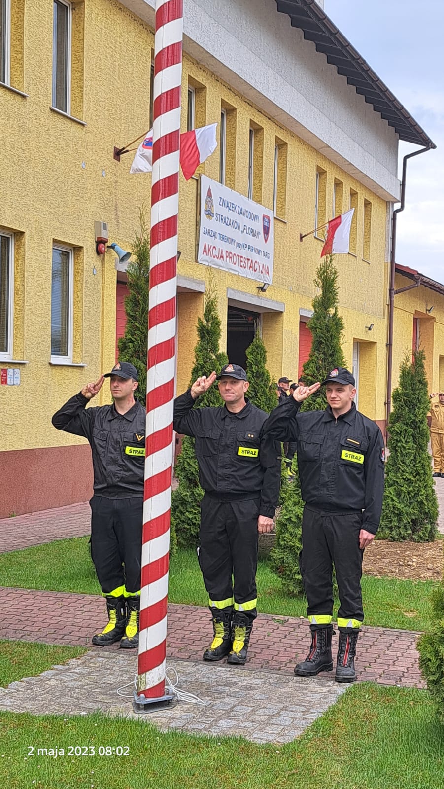 W dniu 02.05.2023 podczas zmiany służby w Jednostkach Ratowniczo Gaśniczych w Nowym Targu i Rabce Zdroju odbyło się uroczyste podniesienie flagi państwowej na maszt.
