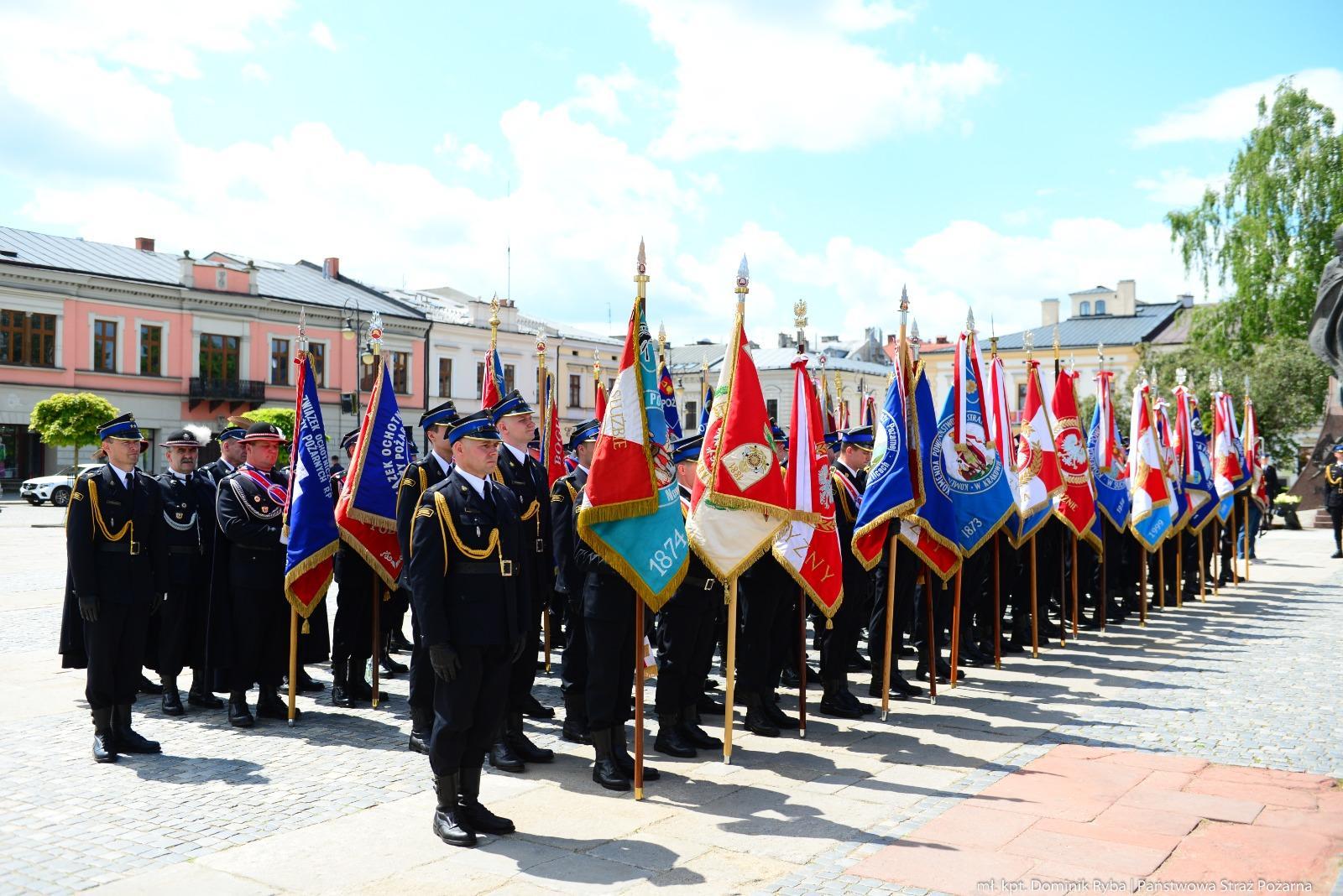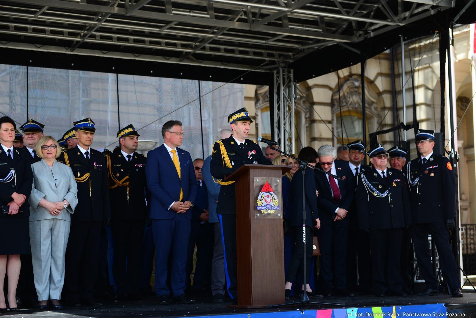 Wspólnie ze strażakami i pracownikami cywilnymi Państwowej Straży Pożarnej oraz druhami Ochotniczych Straży Pożarnych udział w uroczystości wziął komendant główny Państwowej Straży Pożarnej nadbryg. dr inż. Mariusz Feltynowski.