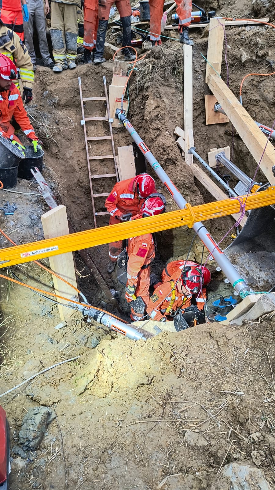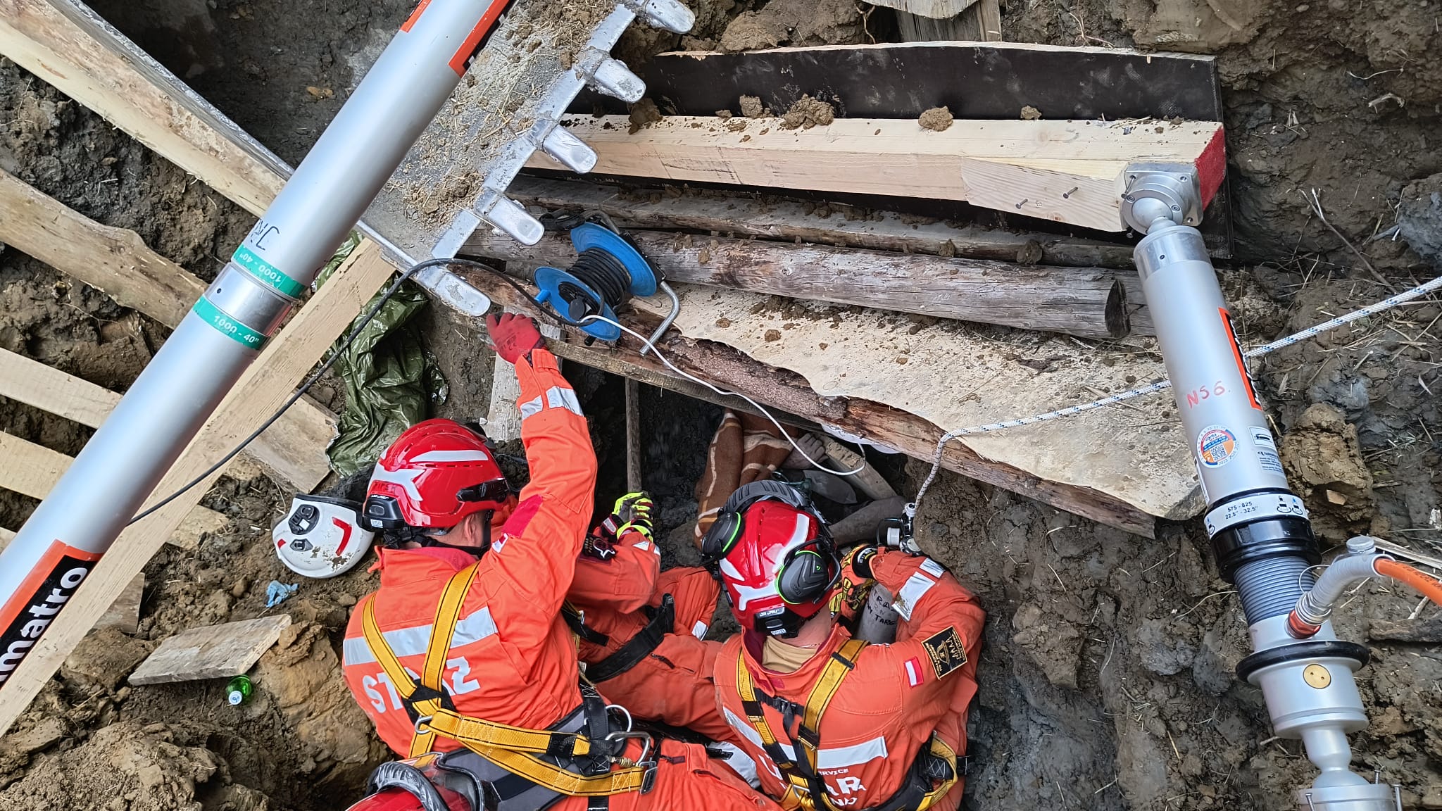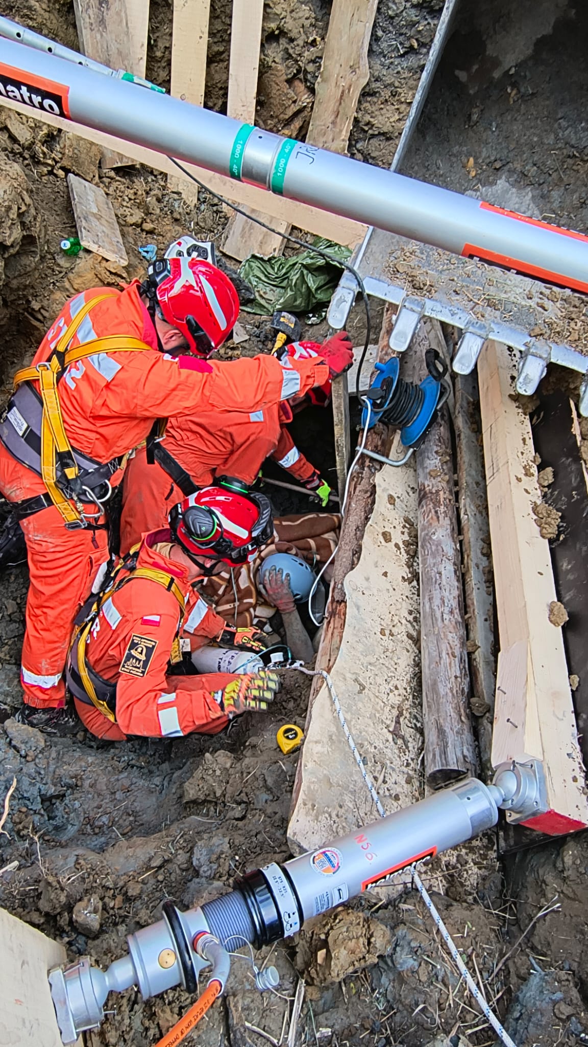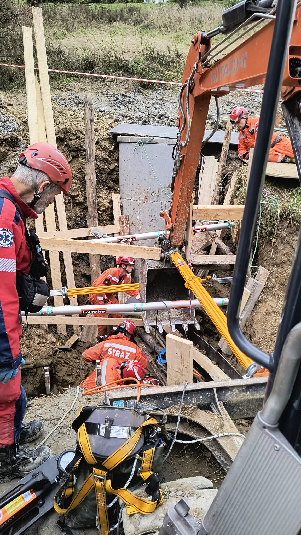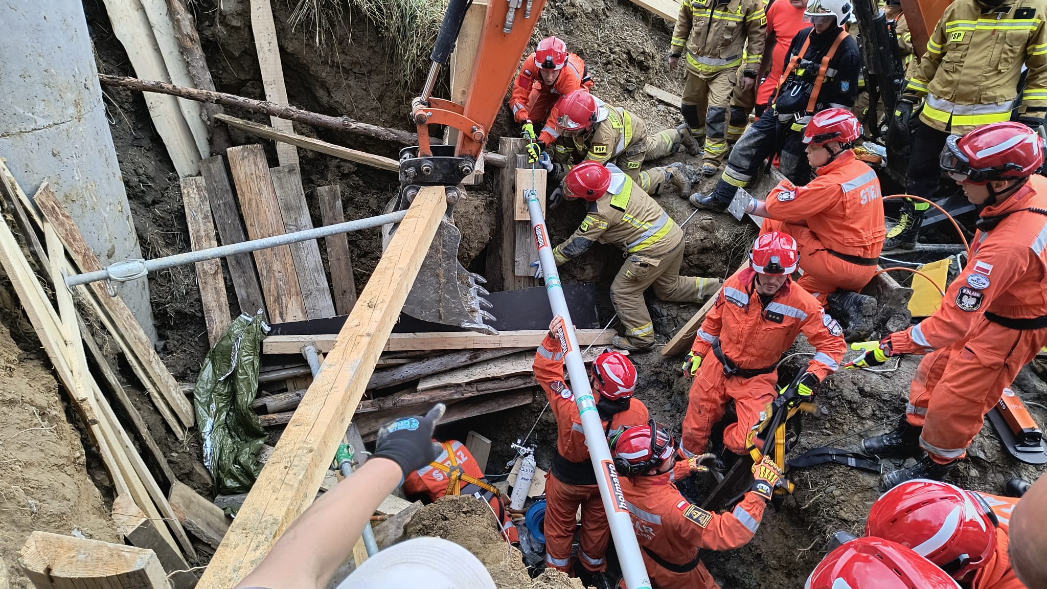 Na szczęście przysypana osoba w trakcie osuwania się ziemi została częściowo zabezpieczona przed dalszym zasypaniem przez pracowników przy pomocy desek. Przybyłe na miejsce jednostki straży pożarnej rozpoczęły w pierwszej kolejności zabezpieczanie osuwiska, przy użyciu drewnianych szalunków i podpór oraz pomocy trzech koparek. W związku z dużym prawdopodobieństwem dalszego osunięcia się gruntu zadysponowana została Specjalistyczna Grupa Poszukiwawczo-Ratownicza z Nowego Sącza, która dodatkowo zabezpieczyła wykop przy pomocy systemu do stabilizacji Holmatro. W trakcie zabezpieczania wykopu przez cały czas trwały pracy mające na celu odkopanie poszkodowanego przy użyciu łopat i saperek. Około godziny 19.20 poszkodowanego wyciągnięto z wykopu. Został on następnie przetransportowany do szpitala w Nowym Targu. W działaniach brało udział pięćdziesięciu strażków oraz czterech ratowników GOPR.