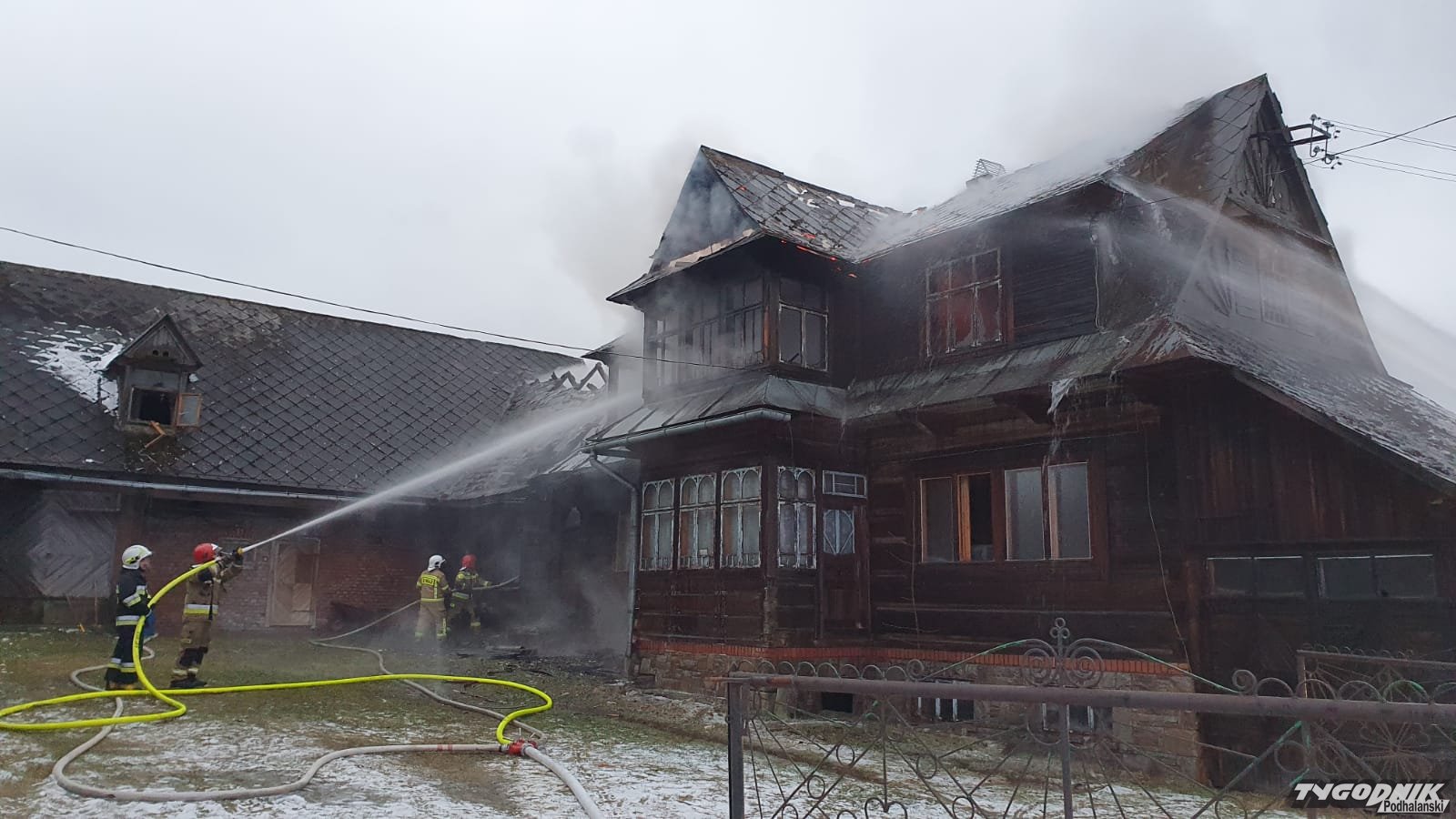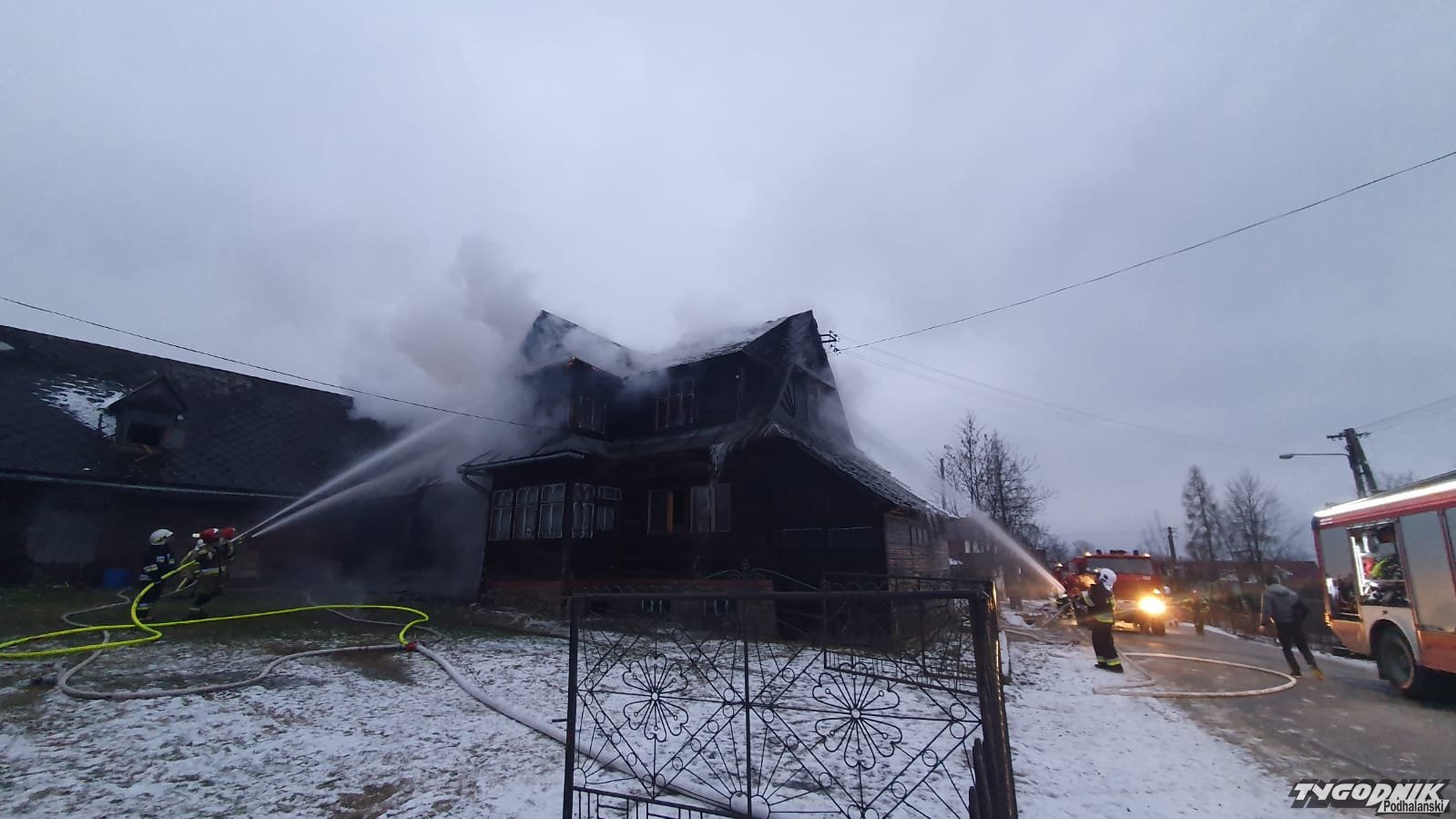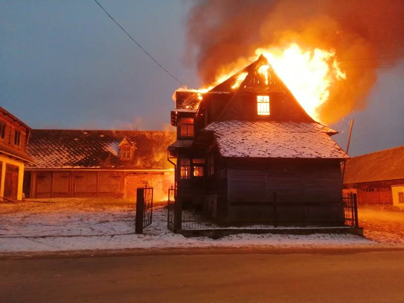 W dniu 12.01.2022 r. około godziny siódmej w miejscowości Czerwienne miał miejsce pożar zabudowania mieszkalno – gospodarczego w kształcie litery L. W momencie przybycia pierwszego zastępu gaśniczego pożarem objęte było całe poddasze budynku mieszkalnego, kuchnia na parterze i zaczynał palić się przylegający budynek gospodarczy. Pożar był otwarty. Mieszkający samotnie właściciel znajdował się na zewnątrz i został przewieziony do szpitala przez ZRM. Działania kolejno przybywających zastępów polegały na podaniu 8 prądów wody w tym 2 do wewnątrz budynku. Odłączono zasilanie energetyczne w miejscowości, zbudowano punkt czerpania wody na potoku Bystry. Ratownicy pracujący wewnątrz budynku zabezpieczeni byli w sprzęt ODO i kamery termowizyjne co spowodowało szybkie przeszukanie budynku. W trakcie działań z pomieszczenia kuchni wyniesiono 2 butle z gazem propan-butan. Po ugaszeniu pożaru dokonano niezbędnych prac rozbiórkowych w celu dotarcia do pojedynczych zarzewi ognia. W działaniach udział brało 15 zastępów PSP i OSP a także 58 ratowników.