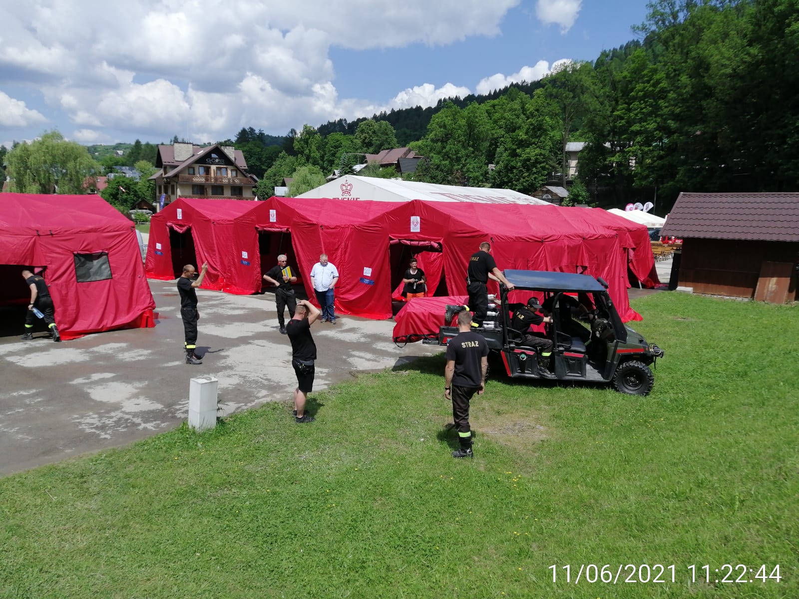11 czerwca br. przy współpracy jednostek Ochotniczych Straży Pożarnych ze: Szczawnicy, Szaflar, Nowego Targu, Tymowej, Laskowej, Kamienicy, Czarnochowic i Kornatki w Szczawnicy, obok Dolnej Stacji Kolei Linowej - Promenada, strażacy Państwowej Straży Pożarnej rozstawiali namioty, które posłużą jako plenerowy punkt szczepień.