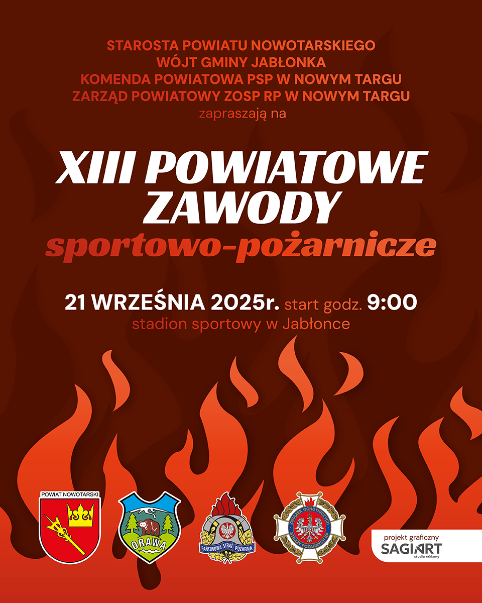 Komenda Powiatowa Państwowej Straży Pożarnej w Nowym Targu serdecznie zaprasza na XIII Powiatowe Zawody Sportowo – Pożarnicze, które odbędą się 21.09.2025 od godz. 9 na stadionie sportowym w Jabłonce.