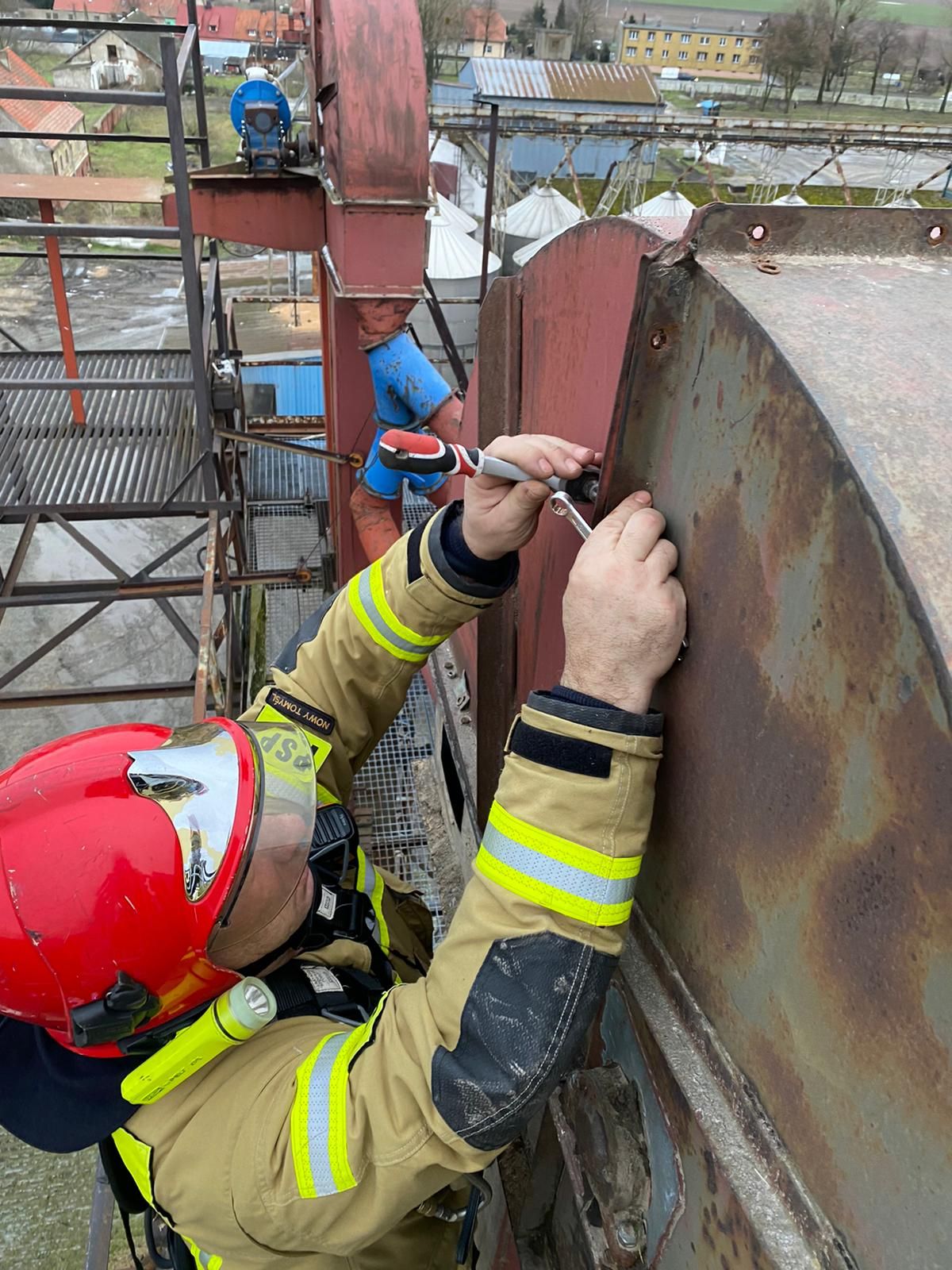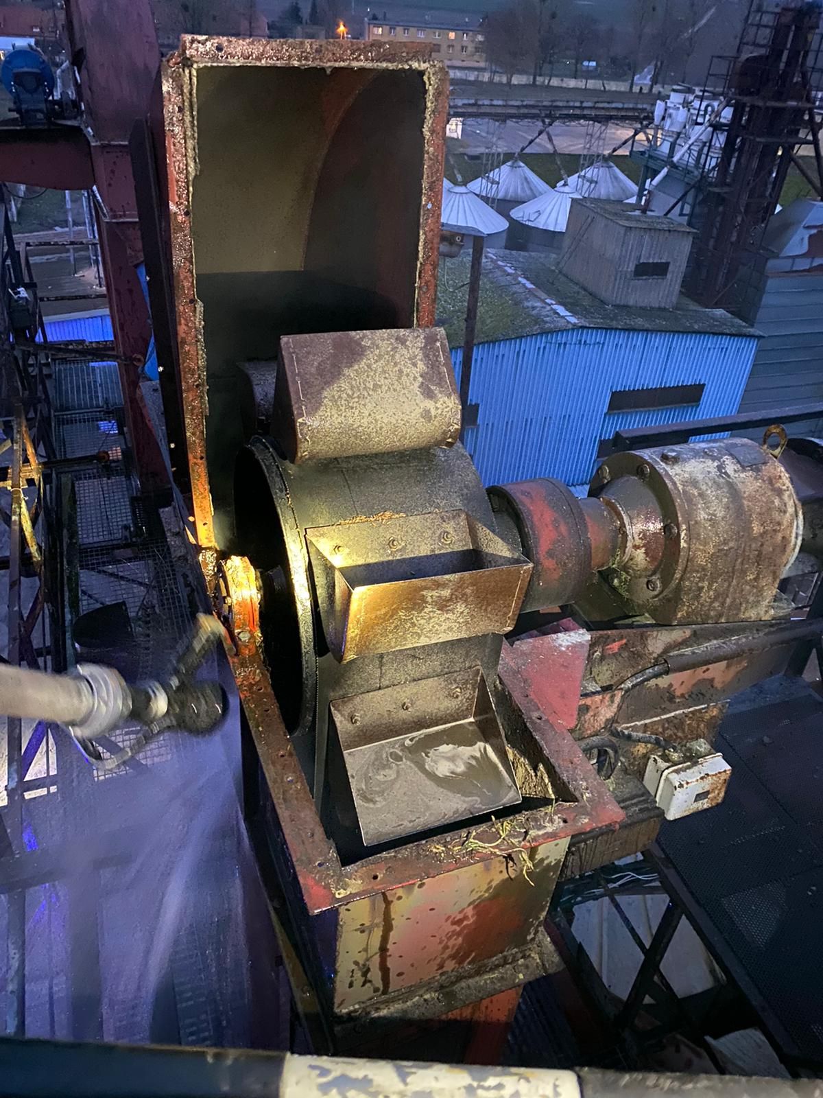 Działania strażaków polegały na zabezpieczeniu miejsca zdarzenia, oświetleniu terenu akcji oraz sprawieniu drabiny mechanicznej SD-30. Górną osłonę przenośnika rozkręcono, a następnie wydobyto zboże z całej objętości przenośnika oraz dogaszono tlący pył znajdujący się w kole pędnym podajnika. Następnie schłodzono wewnętrzną część przenośnika poprzez zalanie go od góry wodą. Całość przenośnika sprawdzono kamerą termowizyjną, która nie wykazała innych zagrożeń.