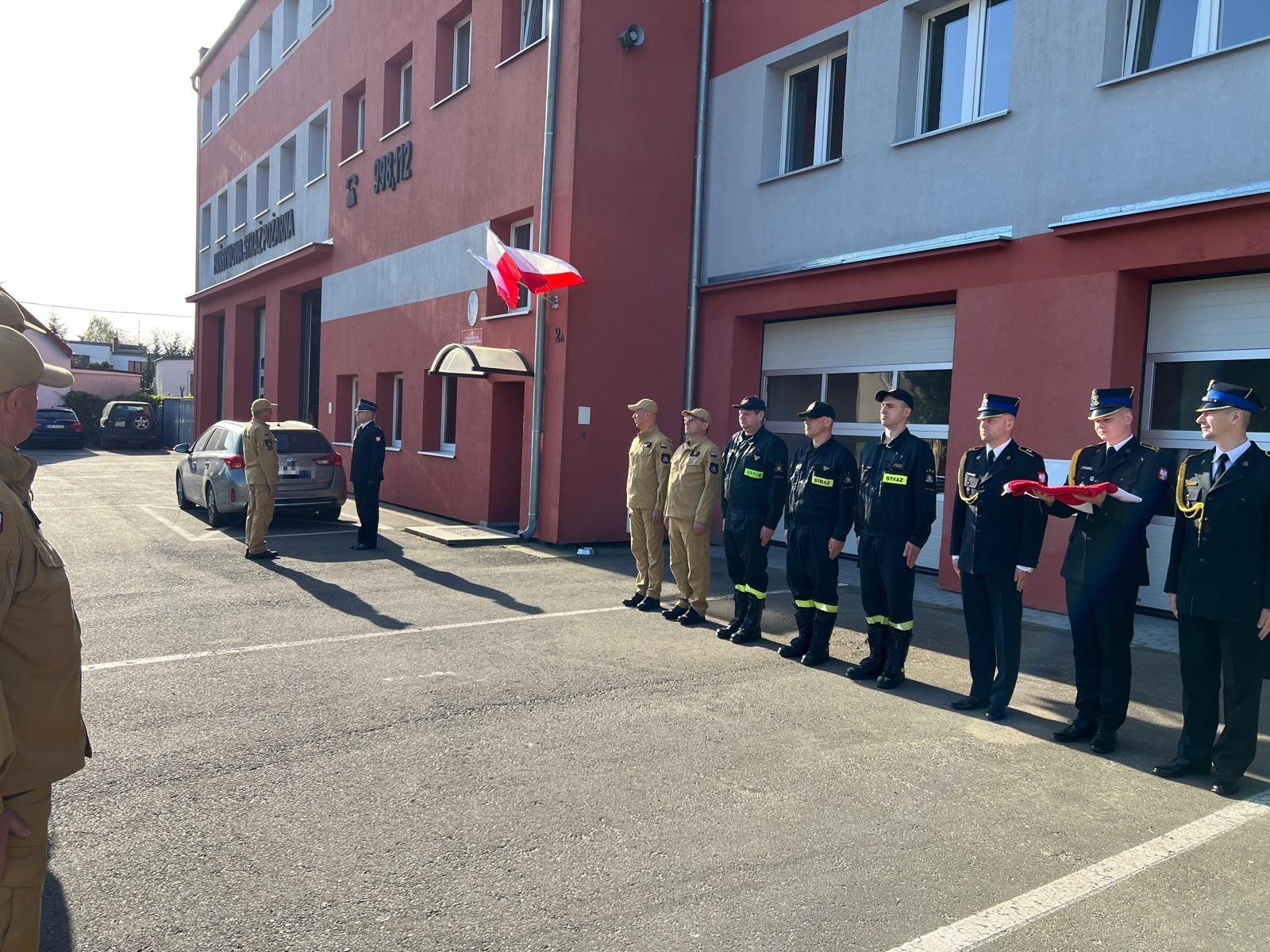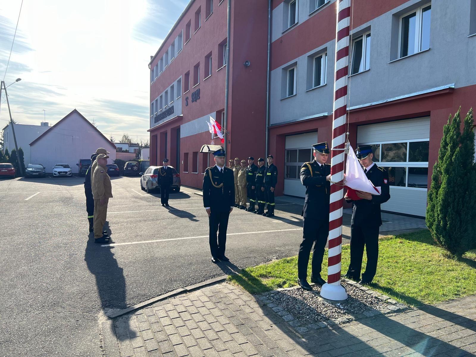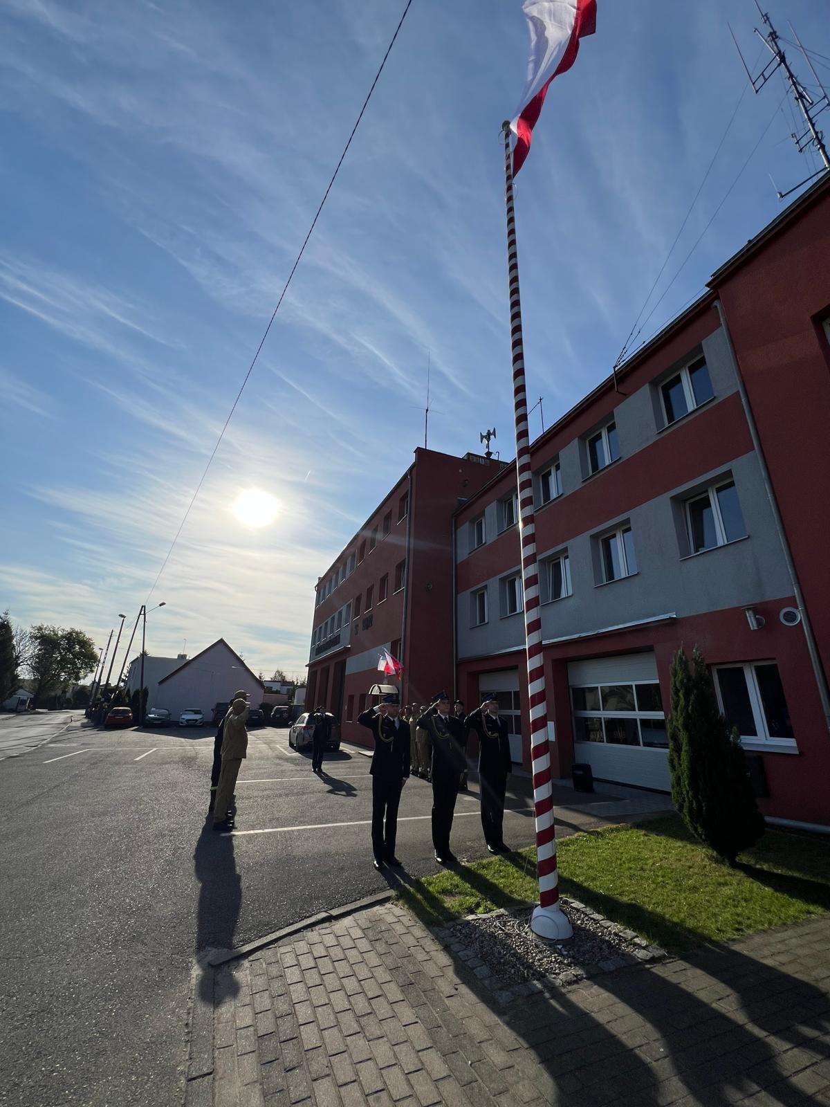 st. kpt. Jakub Kłosowski. Przy dźwiękach Mazurka Dąbrowskiego poczet flagowy dokonał uroczystego wciągnięcia flagi państwowej na maszt przed budynkiem komendy.