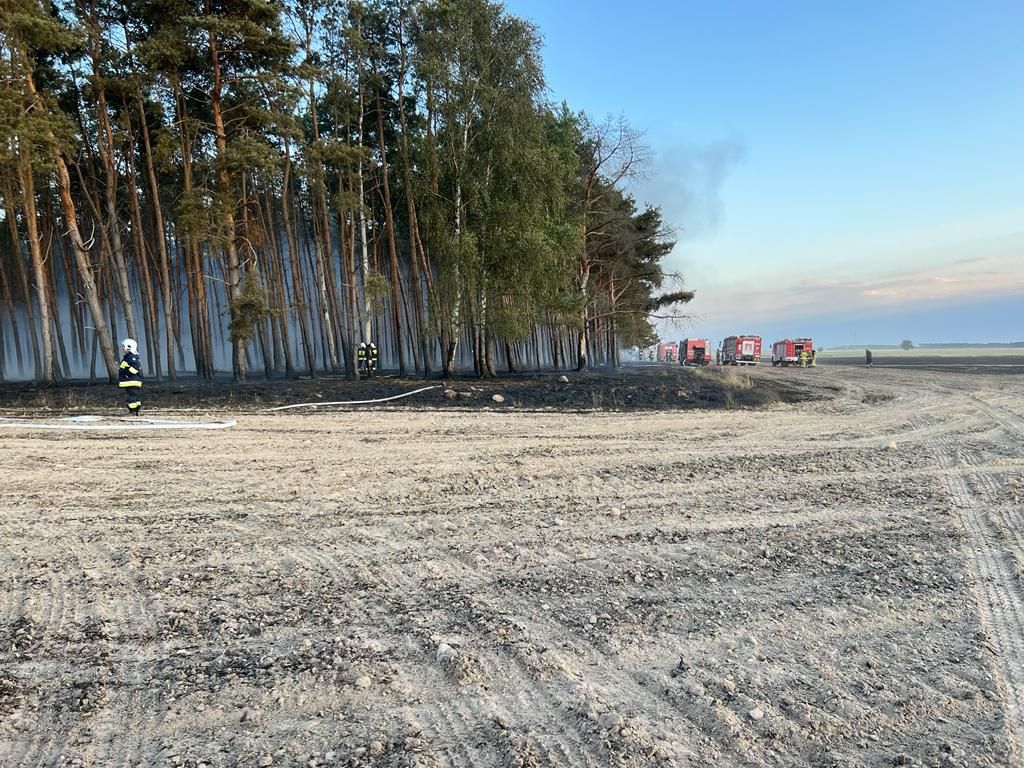 Podczas wykonywania ciągnikiem rolniczym pasów ograniczających rozwój pożaru doszło do zapalenia się słomy przyczepionej do maszyny. Ten pożar udało się w porę ugasić, mniej szczęścia miał drugi z rolników, który niosąc sąsiedzką pomoc wjechał w gęsty dym, traktor zgasł i niestety uległ spaleniu. Na szczęście operator traktora bezpiecznie opuścił pojazd. Po zakończonych działaniach gaśniczych, na miejscu poza pracownikami Nadleśnictwa Babimost wyposażonymi w łopaty i hydronetki, na miejscu pozostawiono dwa zastępy gaśnicze, które dozorowały las do godzin porannych, a nowo powstałe zarzewia ognia sukcesywnie zlewano wodą.
