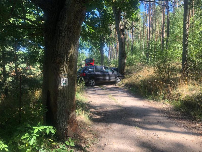 3. Jednak to nie koniec – po przyjeździe ZRM strażacy zostali przedysponowani do kolejnego wypadku na bezdrożach Silnej Nowej gm. Miedzichowo. Do tego zdarzenia zostały również zadysponowane zastępy z OSP Miedzichowo oraz OSP Jabłonka Stara. Zgłoszenie dotyczyło samochodu osobowego, który uderzył w drzewo, dwie osoby poszkodowane. Z uwagi na jazdę leśnymi drogami gruntowymi, dojazd był utrudniony, a miejsce nie było dokładnie określone. Na miejsce zdarzenia pierwszy przyleciał śmigłowiec Lotniczego Pogotowia Ratunkowego i zastał dwóch uczestników zdarzenia, którzy samodzielnie opuścili pojazd. Po dotarciu na miejsce straży pożarnej, zastano samochód osobowy, który otarł się o jedno drzewo i uderzył czołowo w drugie, osoby poszkodowane miały już udzielaną pomoc medyczną przez LPR. Działania straży pożarnej polegały na zabezpieczeniu miejsca zdarzenia, rozłączeniu akumulatora oraz usunięciu pozostałości powypadkowych z drogi gruntowej.