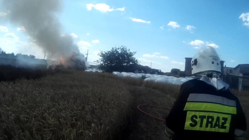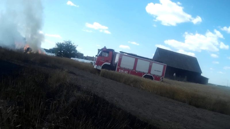 Wtorek, 14 lipca 2020r., o godz. 10:44 do Stanowiska Kierowania Komendanta Powiatowego w Nowym Tomyślu wpłynęło zgłoszenie o pożarze zboża na pniu w bezpośrednim sąsiedztwie zabudowań gospodarczych w Wojnowicach. Z uwagi na posiadane informacje na temat rozmiarów pożaru oraz towarzyszącym wietrze do zdarzenia zadysponowane zostały siły i środki z terenu powiatu nowotomyskiego, grodziskiego i poznańskiego. Po dojeździe na miejsce pierwszych zastępów straży pożarnej oraz zauważeniu, że pożarem objęty jest również stóg oddalony o ok. 20m od budynków w pierwszej kolejności podano jeden prąd wody w obronie na zabudowania oraz jeden w natarciu na palący się stóg słomy. Kolejno przybywające zastępy zajęły się gaszeniem palącego się zboża. Bardzo dobra współpraca między rolnikami spowodowała szybki przyjazd na miejsce dwóch ciągników rolniczych i oboranie palącego się zboża celem uniknięcia dalszego rozprzestrzeniania pożaru. Dalsze działania polegały na rozciągnięciu i dogaszeniu stogu przy użyciu ciągników z ładowaczami czołowymi. Spaleniu uległo ok. 4ha pszenicy na pniu oraz 100 balotów słomy pszennej. Przybyłe na miejsce pogotowie energetyczne ustaliło, że przyczyną powstania pożaru było zwarcie transformatora znajdującego się na polu, a patrol Policji wykluczył udział osób trzecich.