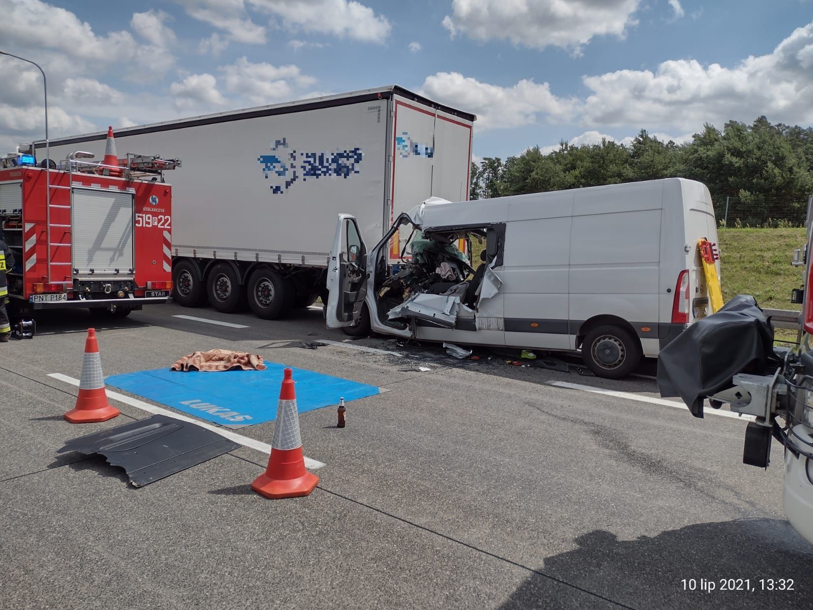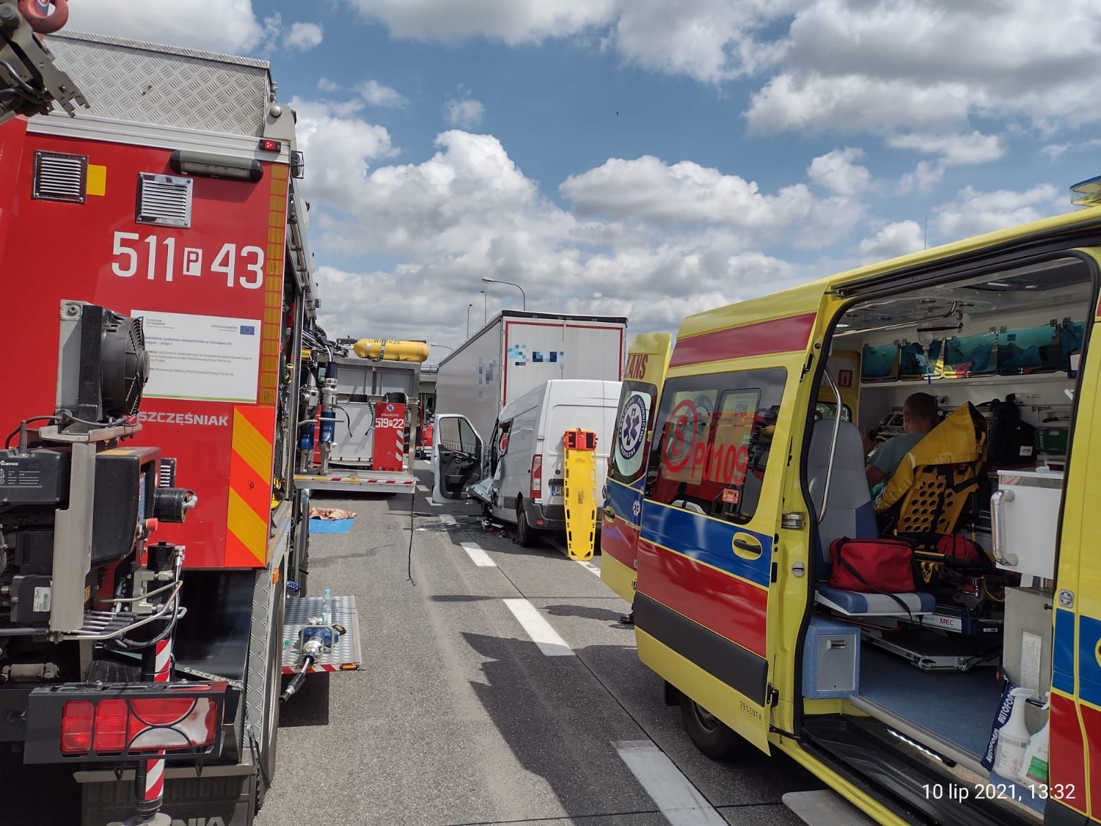 W dniu 10 lipca 2021 roku o godz. 12:35 do Stanowiska Kierowania Komendanta Powiatowego PSP w Nowym Tomyślu wpłynęło zgłoszenie o zderzeniu samochodu typu bus z ciężarówką w okolicach węzła autostradowego w Bolewicku – kierunek Warszawa. Dyżurny SKKP do działań zadysponował dwa zastępy ratownictwa technicznego z JRG Nowy Tomyśl, jednostkę OSP Chrośnica i Miedzichowo oraz oficera pełniącego dyżur w dyspozycji komendanta. Po przyjeździe pierwszych zastępów straży pożarnej na miejsca zdarzenia zastano samochód Opel Movano, który uderzył w tył samochodu ciężarowego DAF z naczepą. Oba pojazdy znajdowały się na pasie przeznaczonym do zjazdu w kierunku Nowego Tomyśla. Kierowca samochodu ciężarowego bez obrażeń opuścił pojazd o własnych siłach, natomiast kierowca i pasażer busa zostali uwięzieni w pojeździe. Zespół Ratownictwa Medycznego oraz służby autostradowe znajdowały się już na miejscu zdarzenia. Działania strażaków polegały na zabezpieczeniu miejsca zdarzenia poprzez zatrzymanie ruchu na wszystkich pasach autostrady w kierunku Warszawy. Wykonano stabilizację pojazdu, a przy pomocy narzędzi hydraulicznych usunięto drzwi kierowcy i pasażera oraz drzwi przesuwne za pasażerem. Usunięto również ścianę boczną za kierowcą i wycięto fotel pasażera celem ewakuacji poszkodowanego na deskę ortopedyczną. Przy pomocy rozpieraczy cylindrycznych wykonano dostęp do nóg kierowcy odginając kolumnę kierowniczą. Następnie kierowcę ewakuowano na deskę ortopedyczną i przekazano Zespołowi Ratownictwa Medycznego. Równocześnie wraz z wykonywaniem dostępu do poszkodowanych, w miarę możliwości udzielano poszkodowanym kwalifikowanej pierwszej pomocy (wsparcie psychiczne, opatrywanie ran). Kolejne działania polegały na odłączeniu akumulatora w rozbitym pojeździe, a przywróceniem odpowiedniego stanu nawierzchni jezdni zajęły się służby autostradowe.