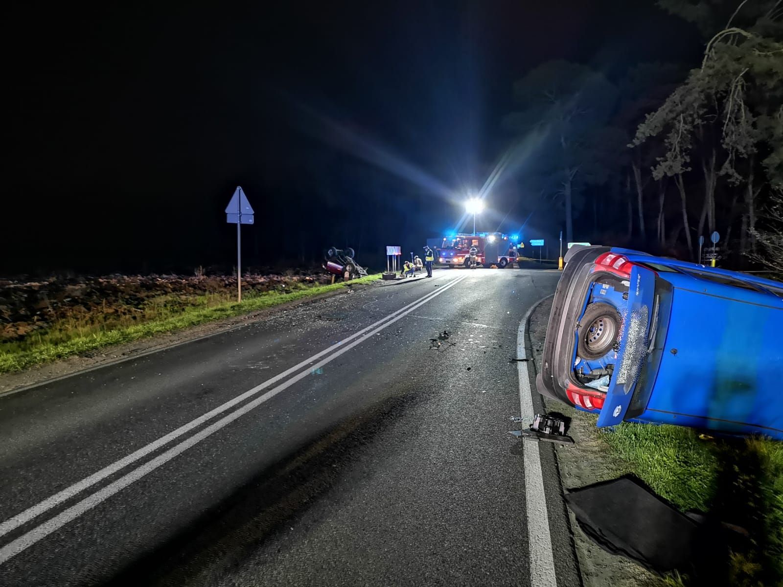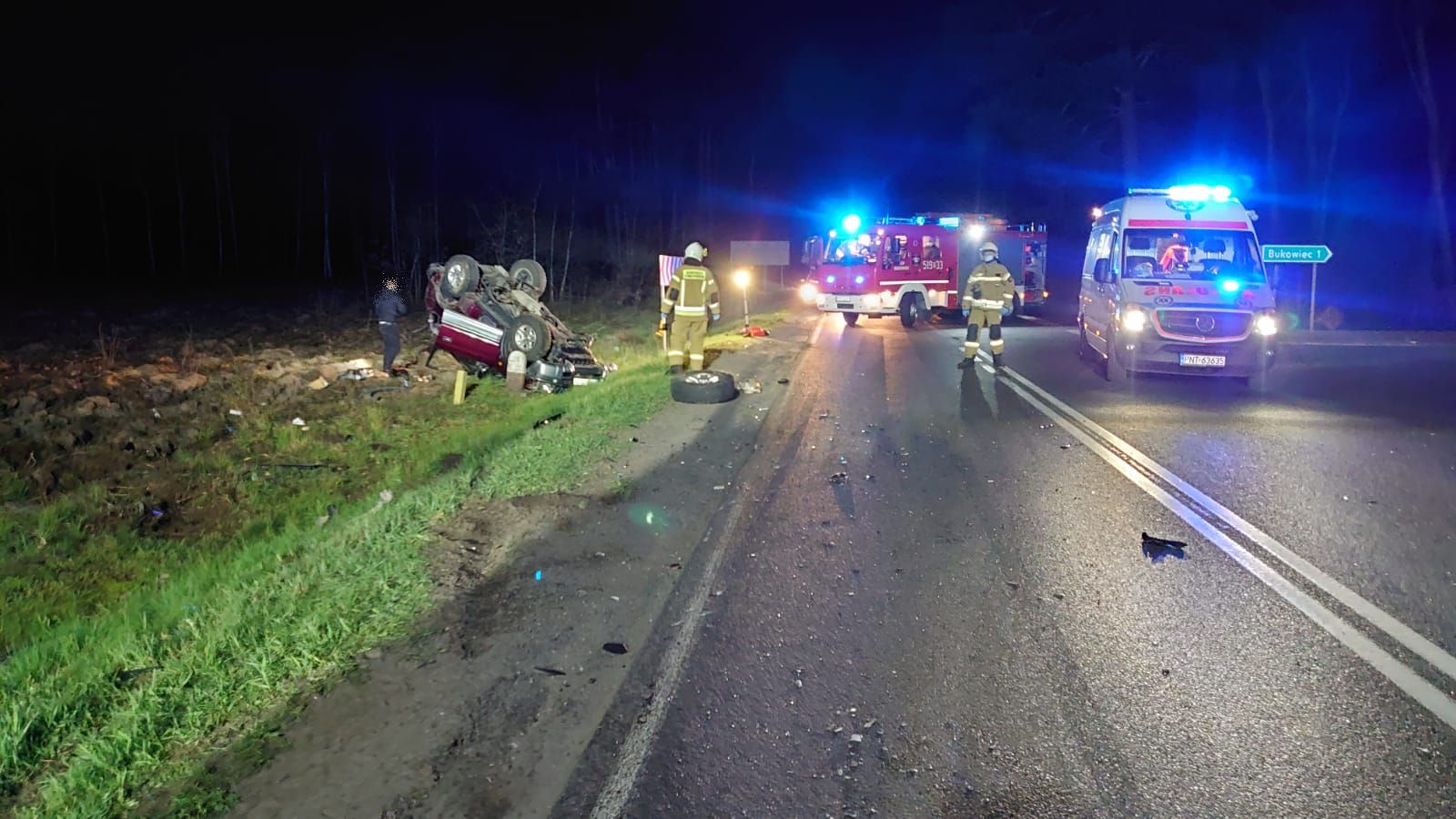 W dniu 25 kwietnia 2021 roku o godz. 20:26 do Stanowiska Kierowania Komendanta Powiatowego PSP w Nowym Tomyślu wpłynęło zgłoszenie o zderzenia dwóch samochodów osobowych na drodze wojewódzkiej 308 w okolicach skrzyżowania w Bukowcu. Na miejsce zadysponowano dwa zastępy z Jednostki Ratowniczo – Gaśniczej oraz dwa zastępy Ochotniczej Straży Pożarnej z Bukowca. Po przybyciu na miejsce pierwszego zastępu straży pożarnej zastano dwa rozbite samochody osobowe Fiat Panda oraz Toyota Land Cruiser – pierwszy znajdował się na prawym boku, drugi na dachu. Samochodami podróżowały łącznie trzy osoby, które opuściły pojazdy przed przybyciem straży pożarnej. Działania strażaków polegały na zabezpieczeniu miejsca zdarzenia, udzieleniu kwalifikowanej pierwszej pomocy trzem osobom poszkodowanym (kontrola ABC, stabilizacja odcinka szyjnego, wsparcie psychiczne, termoizolacja), odłączeniu akumulatorów w uszkodzonych pojazdach oraz oświetleniu terenu akcji. Po przybyciu na miejsce zdarzenia zespołu ratownictwa medycznego lekarz zadecydował o przetransportowaniu osób poszkodowanych do szpitala w Nowym Tomyślu. Dalsze działania polegały na oświetleniu terenu akcji oraz usunięciu pozostałości powypadkowych z jezdni. Dochodzenie w sprawie przyczyny i okoliczności powstania zdarzenia prowadzi nowotomyska Policja.
