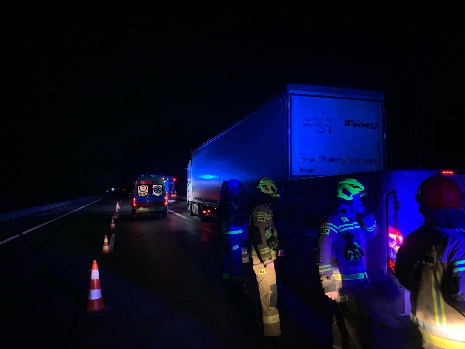 Po przybyciu straży pożarnej na miejsce zastano samochód ciężarowy oraz bus na pasie awaryjnym, a osoby biorące udział w zdarzeniu opuściły pojazdy przed przyjazdem zastępów ratowniczych.
