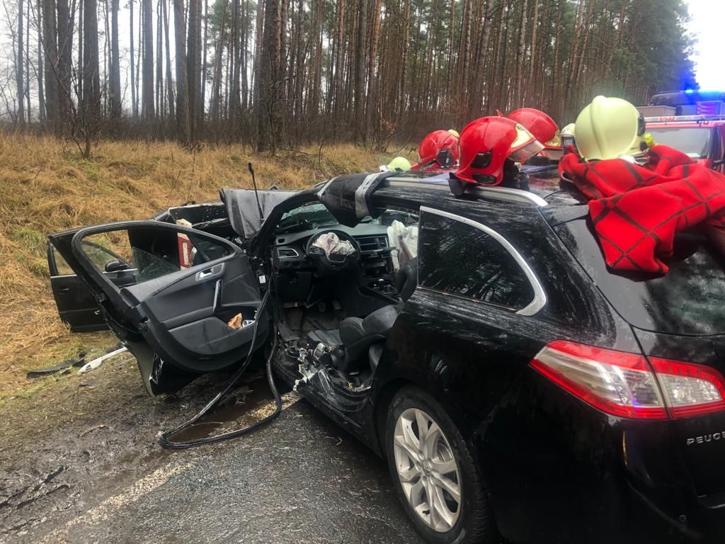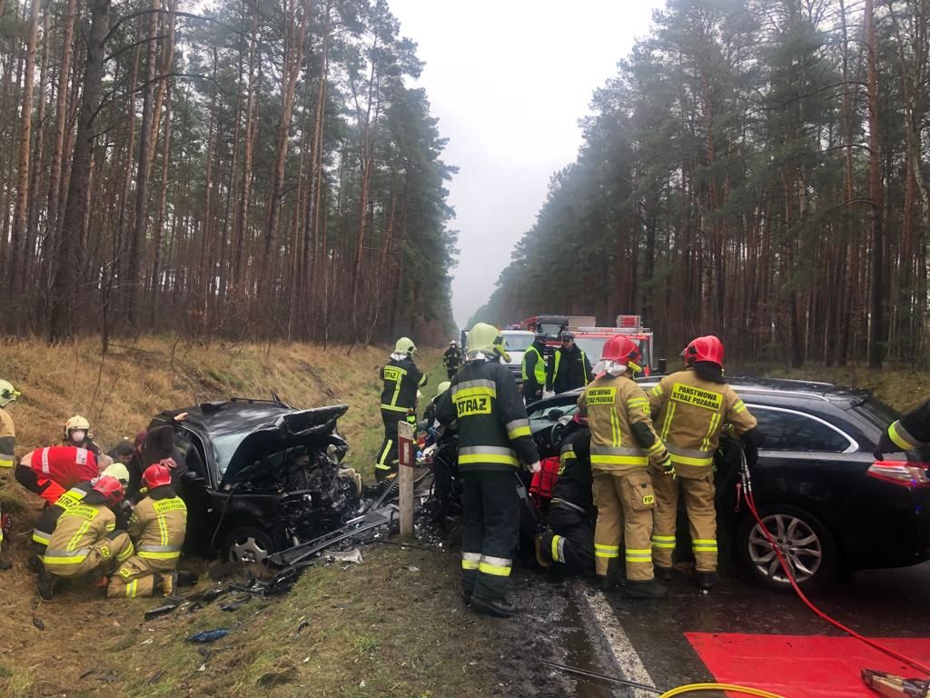 W dniu 11 lutego 2022 roku o godz. 10:47 do Stanowiska Kierowania Komendanta Powiatowego PSP w Nowym Tomyślu wpłynęło zgłoszenie o czołowym zderzeniu dwóch samochodów osobowych na prostym odcinku drogi wojewódzkiej 302. Dyżurny SKKP do działań zadysponował dwa zastępy ratownictwa technicznego i samochód rozpoznawczo – ratowniczy z JRG w Nowym Tomyślu oraz zastęp z jednostki Ochotniczej Straży Pożarnej z Chrośnicy i Zbąszynia. Po przybyciu pierwszych zastępów na miejsce zdarzenia zastano dwa samochody osobowe po czołowym zderzeniu, jedno znajdowało się w przydrożnym rowie, drugi pojazd na pasie jezdni. W zdarzeniu łącznie udział brały trzy osoby. Dwie osoby podróżujące samochodem VW Passat znajdowały się poza pojazdem, natomiast kierujący Peugeot 508 znajdował się wewnątrz pojazdu. Poszkodowani byli przytomni, kontaktowi, lecz wymagali pomocy medycznej. Droga była całkowicie zablokowana. Działania strażaków polegały na zabezpieczeniu miejsca zdarzenia, udzieleniu kwalifikowanej pierwszej pomocy poszkodowanym (stabilizacja odcinka szyjnego kręgosłupa, wsparcie psychiczne, ewakuacja z pojazdu na nosze, stabilizacja prawej nogi, tlenoterapia, opatrunek osłaniający prawej nogi, termoizolacja, stabilizacja miednicy oraz klatki piersiowej, unieruchomienie złamania prawej nogi). W chwili przybycia na miejsce zdarzenia pierwszego Zastępu Ratownictwa Medycznego, ratownik przeprowadził rozpoznanie medyczne i w konsultacji z Kierującym Działaniem Ratowniczym wyznaczył priorytety działań medycznych. Dodatkowo na miejsce zadysponowana została kolejna karetka oraz śmigłowiec Lotniczego Pogotowia Ratunkowego. Przybyły na miejsce zdarzenia lekarz LPR, po konsultacji z ratownikiem medycznym podjął decyzję o kolejności transportu osób poszkodowanych. Dwie osoby trafiły do szpitala w Nowym Tomyślu, natomiast jeden poszkodowany został zabrany przez LPR do szpitala w Puszczykowie. Równolegle z prowadzonymi działaniami medycznymi wykonano dostęp do poszkodowanego kierowcy Peugeota, odłączono akumulatory w rozbitych pojazdach, a po zakończeniu działań prowadzonych przez Policję usunięto z jezdni plamy płynów eksploatacyjnych.