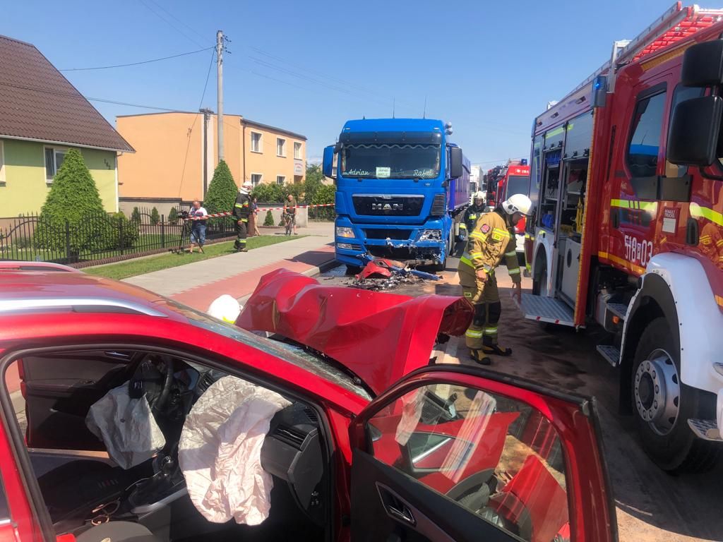 W dniu 6 lipca 2022 roku o godz. 10:54 do Stanowiska Kierowania Komendanta Powiatowego PSP w Nowym Tomyślu wpłynęło zgłoszenie o czołowym zderzeniu samochodu osobowego z ciężarowym w miejscowości Przyprostynia – dwie osoby poszkodowane. Dyżurny SKKP do działań zadysponował dwa zastępy ratownictwa technicznego i samochód rozpoznawczo – ratowniczy z Jednostki Ratowniczo Gaśniczej w Nowym Tomyślu oraz zastęp Ochotniczej Straży Pożarnej z Przyprostyni i Zbąszynia. Po przybyciu pierwszego zastępu straży pożarnej na miejsce zdarzenia zastano samochód osobowy z całkowicie rozbitym przodem, który znajdował się na środku jezdni. W środku pojazdu znajdowała się kierująca oraz pasażerka, które były przytomne i nie były uwięzione. Samochód ciężarowy, który brał udział w zdarzeniu drogowym oddalony był od samochodu osobowego około 5 metrów. Kierowca ciężarówki bez obrażeń samodzielnie opuścił pojazd i odmówił przyjęcia pomocy medycznej. Droga podczas dojazdu służb ratunkowych i prowadzonych działań była całkowicie zablokowana. Działania strażaków polegały na zabezpieczeniu miejsca zdarzenia, odłączeniu akumulatora, udzieleniu kwalifikowanej pierwszej pomocy poszkodowanym (przeprowadzenie wywiadu, kontrola ABC, wsparcie psychiczne, ręczna stabilizacja odcinka szyjnego kręgosłupa, termoizolacja). Przybyły na miejsce ratownik medyczny, który koordynował działania medyczne podjął decyzję o zadysponowaniu śmigłowca lotniczego pogotowia ratunkowego. Przybyły na miejsce lekarz LPR podjął decyzję o transporcie jednej osoby do szpitala w Nowym Tomyślu oraz drugiej do szpitala w Zielonej Górze śmigłowcem LPR. Dalsze działania polegały na usunięciu z jezdni pozostałości powypadkowych oraz plam płynów eksploatacyjnych.
