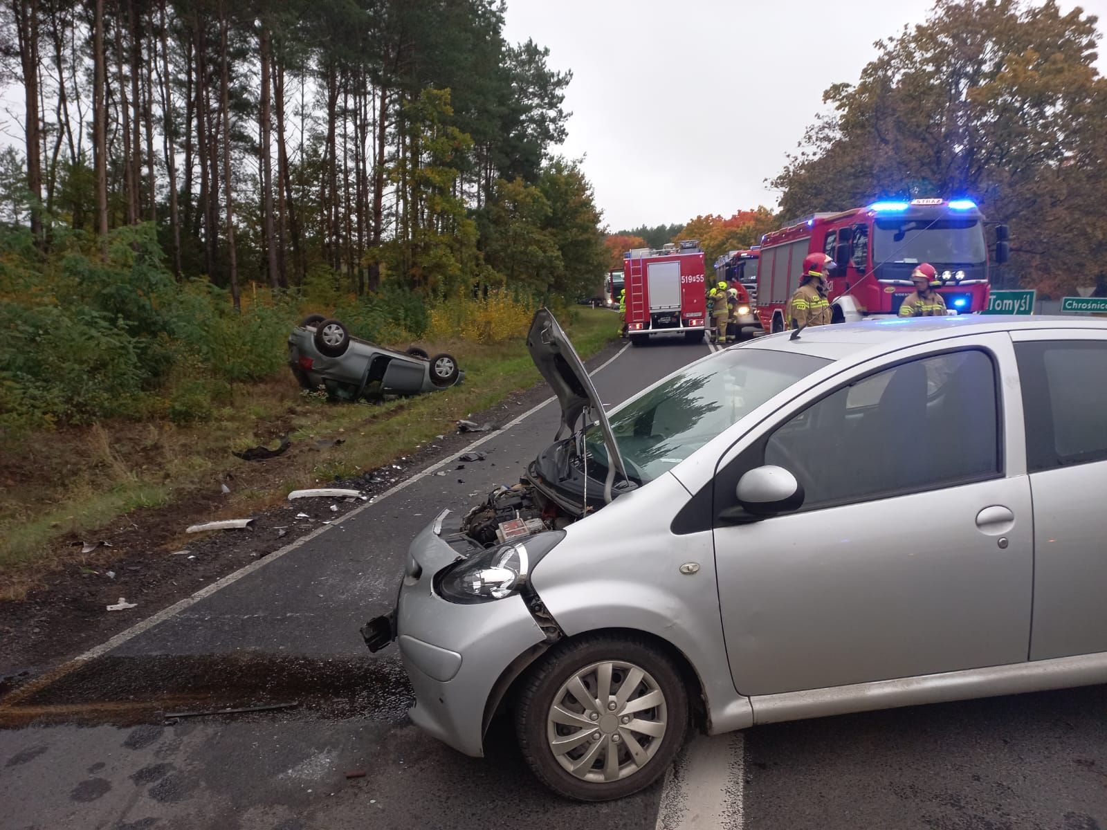 Po przybyciu pierwszych zastępów na miejsce zdarzenia zastano 2 samochody osobowe, jeden z nich Toyota Aygo na środku drogi prostopadle do osi jezdni, drugi samochód Toyota Yaris na dachu w przydrożnym rowie. Z obu pojazdów osoby kierujące wyszły przed przybyciem zastępów straży na miejsce zdarzenia.