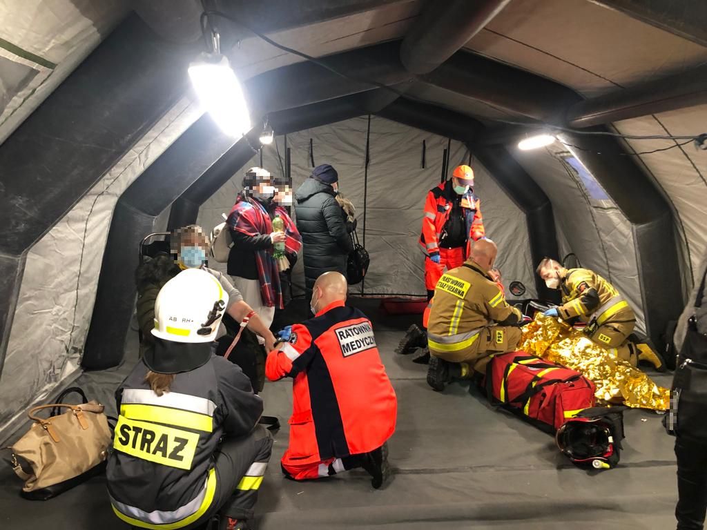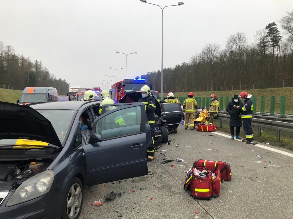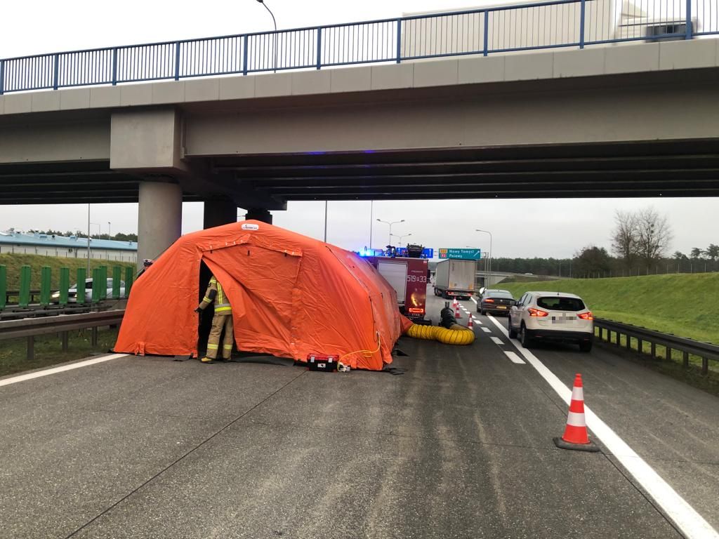 W dniu 18 grudnia 2021 roku o godz. 13:12 do Stanowiska Kierowania Komendanta Powiatowego PSP w Nowym Tomyślu wpłynęło zgłoszenie o wypadku trzech samochodów osobowych na 107km autostrady A2 w kierunku Warszawy. Dyżurny SKKP do działań zadysponował dwa zastępy ratownictwa technicznego z nowotomyskiej Jednostki Ratowniczo - Gaśniczej oraz zastępy OSP Miedzichowo i OSP Chrośnica. Po przyjeździe pierwszych zastępów na miejsca zdarzenia zastano trzy samochody osobowe znajdujące się na dwóch pasach jezdni autostrady. Dwunastu uczestników zdarzenia (obywatele Polski, Ukrainy i Gruzji) opuściło pojazdy przed przybyciem strażaków. Ruch odbywał się pasem awaryjnym. Działania straży pożarnej polegały na zabezpieczeniu miejsca zdarzenia, udzieleniu kwalifikowanej pierwszej pomocy czterem poszkodowanym osobom (kontrola ABC, wsparcie psychiczne, stabilizacja odcinka szyjnego kręgosłupa, opatrzenie ran, termoizolacja), odłączeniu akumulatorów w uszkodzonych pojazdach, oświetleniu terenu akcji, kierowaniu ruchem, neutralizacji płynów eksploatacyjnych oraz usunięciu pozostałości powypadkowych. Ze względu na wydłużające się działania i niską temperaturę na miejsce zdarzenia zadysponowano zastęp OSP Bukowiec z ogrzewanym namiotem pneumatycznym. Namiot posłużył jako punkt medyczny oraz miejsce na ogrzanie się i wypicie ciepłej herbaty dla pozostałych uczestników zdarzenia. Po przebadaniu poszkodowanych lekarz zdecydował o przewiezieniu dwóch osób do szpitala w Nowym Tomyślu, a jednej do szpitala w Poznaniu. Kolejna z poszkodowanych odmówiła transportu do szpitala.