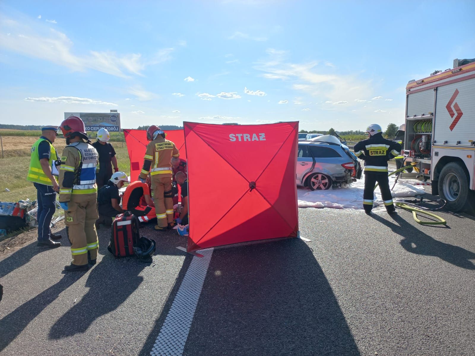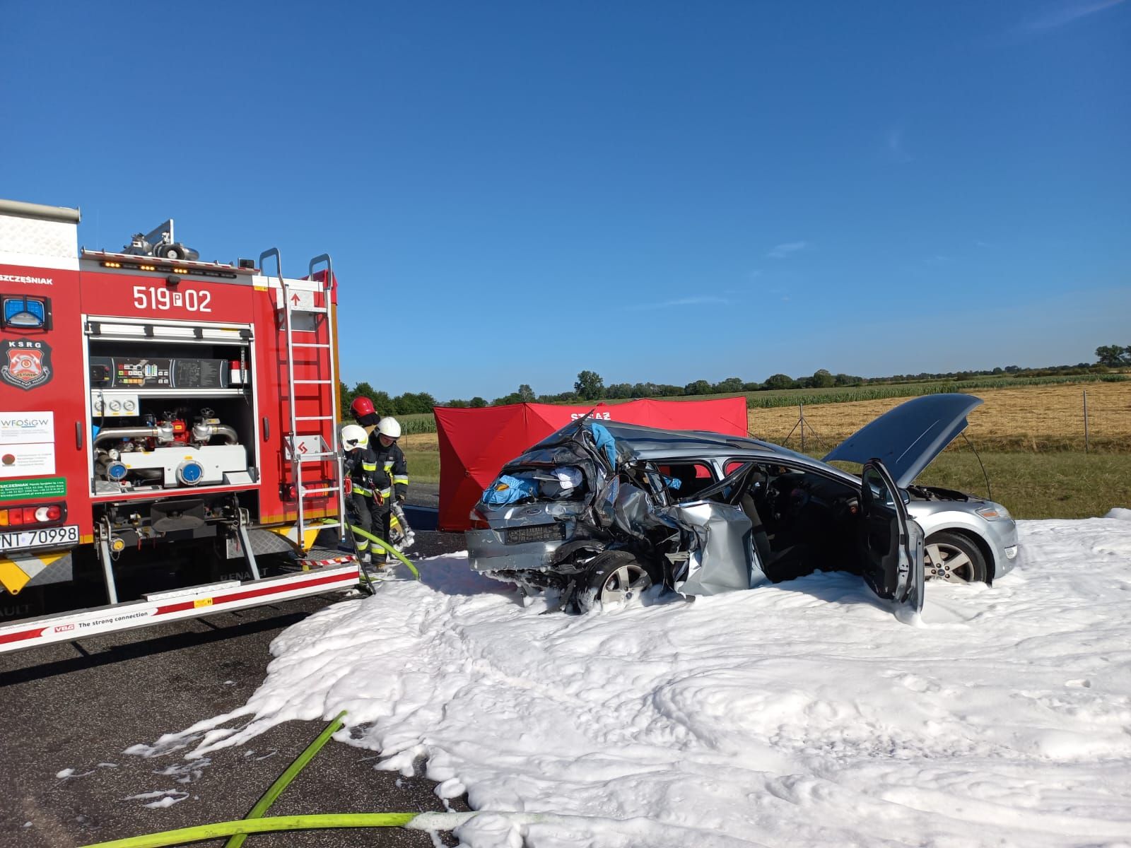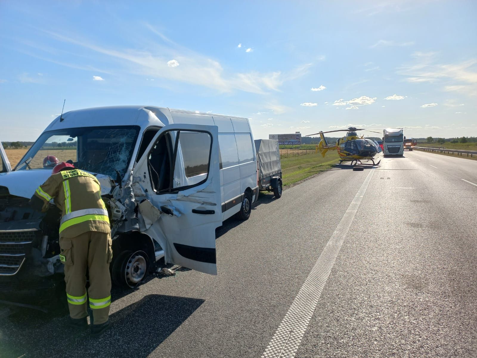 W dniu 28 lipca 2022 roku o godz. 16:54 do Stanowiska Kierowania Komendanta Powiatowego PSP w Nowym Tomyślu wpłynęło zgłoszenie z CPR Poznań: a2 - 122 i 6 słupek kierunek na Warszawę, rozbita osobówka, zderzenie z busem, zgłaszający świadek idzie na msc. zdarzenia, wszystko rozbite, 1 osoba zakleszczona. Dyżurny SKKP do zdarzenia zadysponował dwa zastępy ratownictwa technicznego z nowotomyskiej Jednostki Ratowniczo – Gaśniczej oraz zastęp Ochotniczej Straży Pożarnej z Kuślina. Po przyjeździe pierwszych zastępów na miejsca zdarzenia zastano samochód osobowy stojący w poprzek jezdni na prawym pasie, 50 metrów dalej na prawym pasie znajdował się samochód ciężarowy z naczepą, kolejne 100 metrów dalej na pasie awaryjnym stał bus z przyczepką. Busem i samochodem ciężarowym podróżowali tylko kierowcy, a osobówką podróżowały 3 osoby. Wszyscy uczestnicy zdarzenia opuścili pojazdy przed przybyciem strażaków. W zdarzeniu poszkodowany został pasażer samochodu osobowego (przytomny, pod wpływem zdarzenia, uskarżał się na bóle pleców i brzucha). Samochód ciężarowy przewoził pomoc humanitarną na Ukrainę, bus nie przewoził towaru. Z samochodu osobowego z uszkodzonego zbiornika paliwa wyciekła benzyna. Ruch na nitce południowej w kierunku Warszawy był całkowicie wstrzymany. Działania strażaków polegały na zabezpieczeniu miejsca zdarzenia, wstrzymaniu ruchu na nitce północnej na czas lądowania i startu śmigłowca Lotniczego Pogotowia Ratunkowego, podaniu jednego prądu piany średniej i jednego prądu piany ciężkiej na plamę paliwa, odłączeniu akumulatorów w samochodzie osobowym i busie, zakręceniu zaworu zbiornika gazu w samochodzie osobowym, udzieleniu kwalifikowanej pierwszej pomocy poszkodowanemu (wsparcie psychiczne, kontrola ABC, postępowanie przeciwwstrząsowe, stabilizacja odcinka szyjnego kręgosłupa, tlenoterapia bierna). Poszkodowany przekazany LPR, po przeprowadzonym badaniu decyzją lekarza poszkodowany został przetransportowany śmigłowcem do szpitala w Poznaniu. Po zakończonych czynnościach prowadzonych przez Policję zneutralizowano oraz zmyto jezdnię prądem wody.