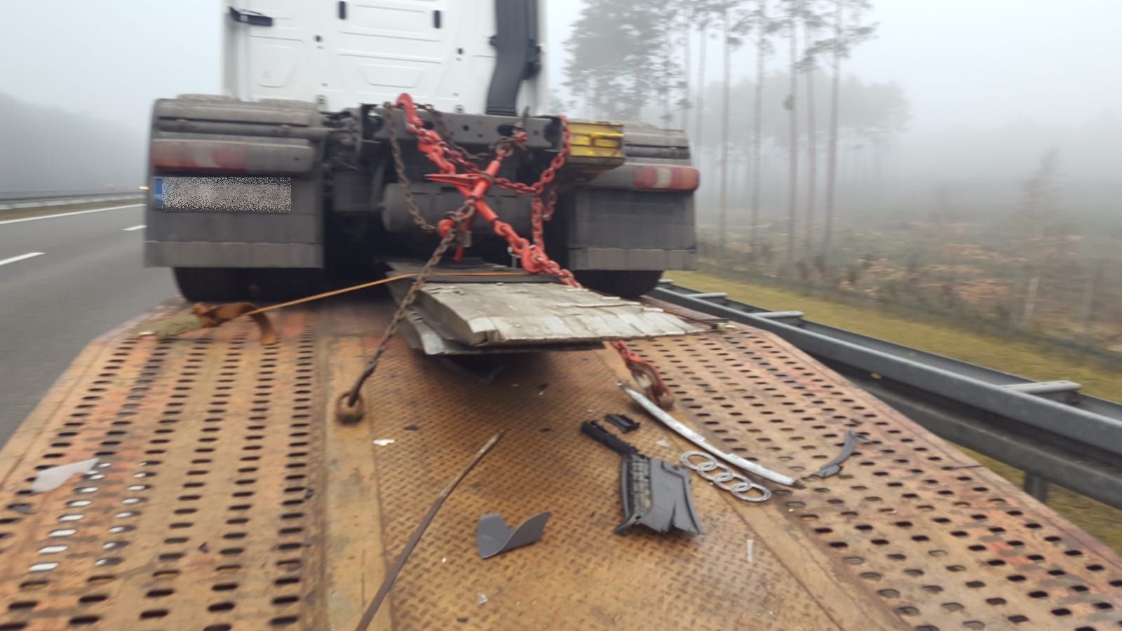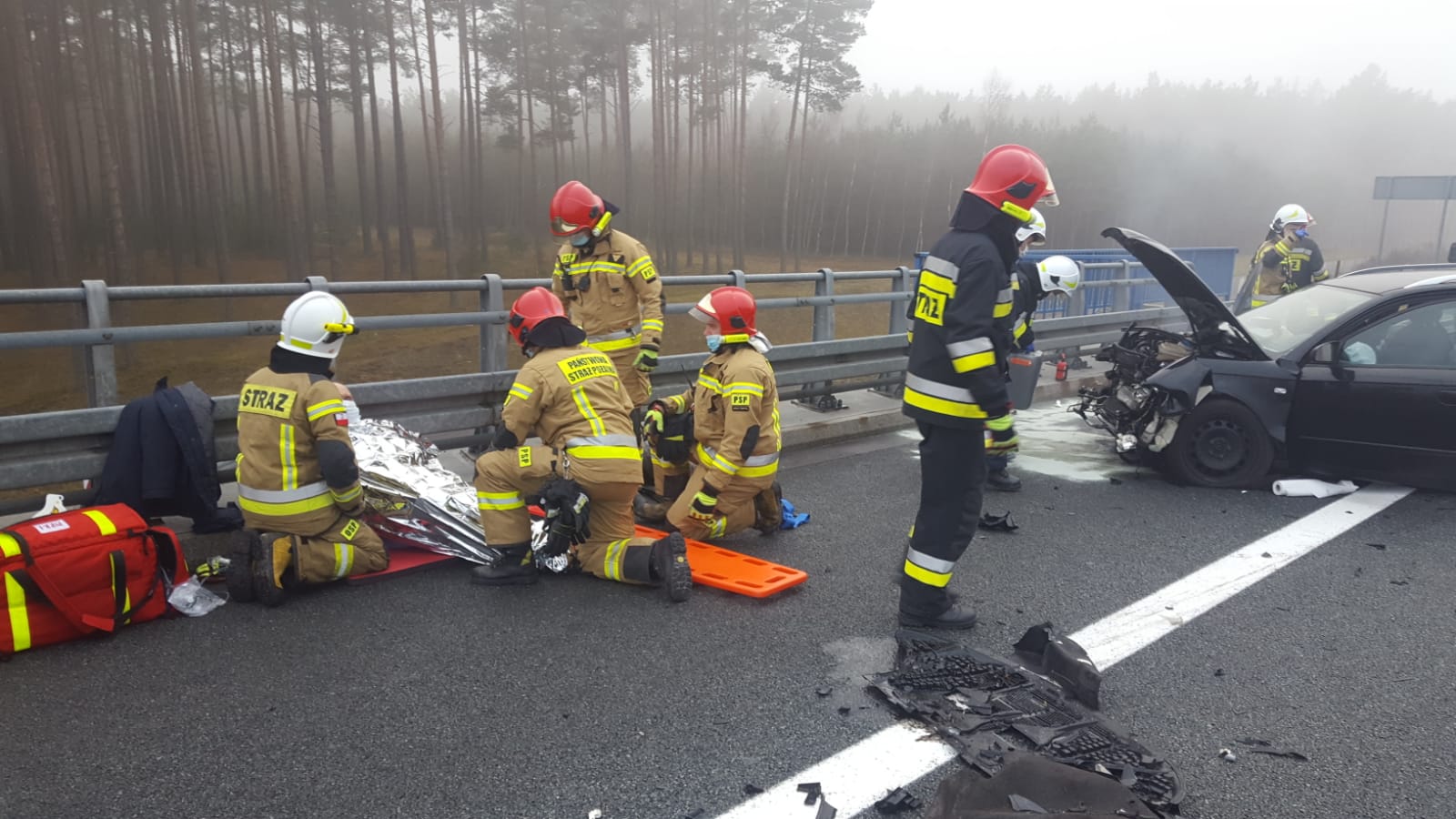 Po dojeździe zastępów straży pożarnej na miejsce zdarzenia zastano samochód osobowy stojący przodem na pasie awaryjnym, natomiast tył pojazdu wystawał na pas „wolny” południowej nitki autostrady. Samochodem osobowym podróżowało dwóch mężczyzn, którzy samodzielnie opuścili uszkodzony pojazd przed przyjazdem strażaków. Poszkodowani uskarżali się na ból w klatce piersiowej, dlatego strażacy natychmiastowo udzielili im kwalifikowanej pomocy medycznej (założenie kołnierzy ortopedycznych, stabilizacja poszkodowanych w pozycji zastanej z uwagi na podejrzenie urazów klatki piersiowej i brzucha, termoizolacja, tlenoterapia u jednej osoby oraz wsparcie psychiczne do czasu przekazania Zespołowi Ratownictwa Medycznego. Na pasie awaryjnym autostrady w odległości ok. 400 m dalej znajdował się samochód ciężarowy z naczepą typu laweta, który również brał udział w zdarzeniu - kierujący tym pojazdem nie odniósł obrażeń, odmówił udzielenia pomocy medycznej przez strażaków podpisując stosowne oświadczenie. Przynyły na miejsce lekarz Zespołu Ratownictwa Medycznego po zbadaniu poszkodowanych zdecydował o przetransportowaniu obu mężczyzn do nowotomyskiego szpitala.