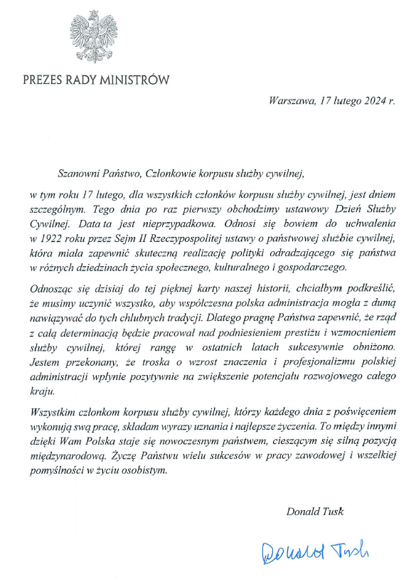 List Prezesa Rady Ministrów z okazji Dnia Służby Cywilnej
