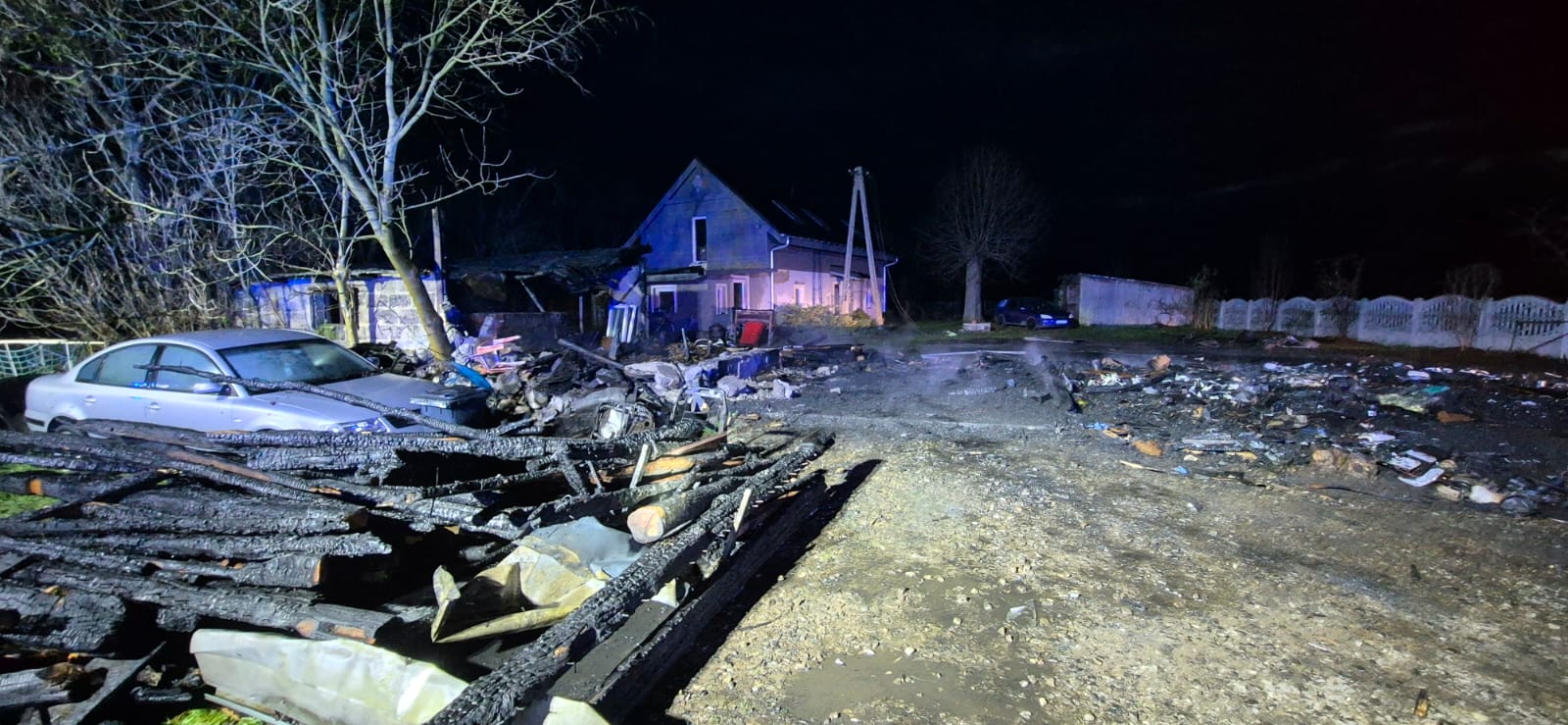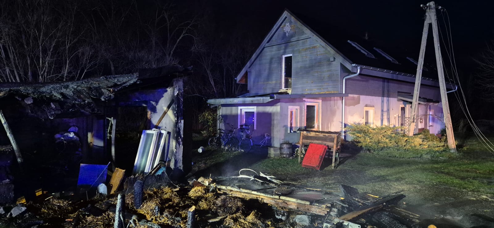 Po dojeździe na miejsce zdarzenia stwierdzono rozwinięty pożar budynku gospodarczego. W odległości około 5 metrów znajdował się budynek mieszkalny, w którym w chwili powstania pożaru przebywało sześć osób, w tym troje dzieci. W trakcie dojazdu zastępów straży pożarnej patrol policji, obecny już na miejscu, rozpoczął ewakuację mieszkańców.