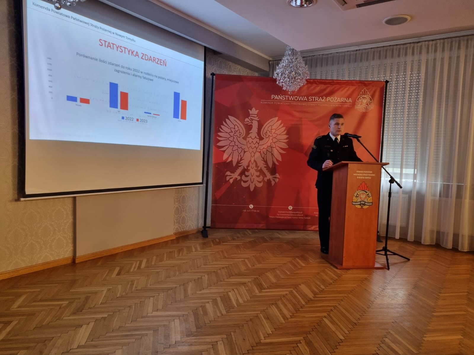 Naradę rozpoczął p.o. Komendant Powiatowy Państwowej Straży Pożarnej w Nowym Tomyślu st. kpt. Jakub Kłosowski przywitaniem zgromadzonych gości oraz przedstawieniem zagadnień z zakresu statystyki zdarzeń, gospodarki finansowej oraz kwatermistrzowskiej komendy oraz charakterystyczne zdarzenia minionego roku.