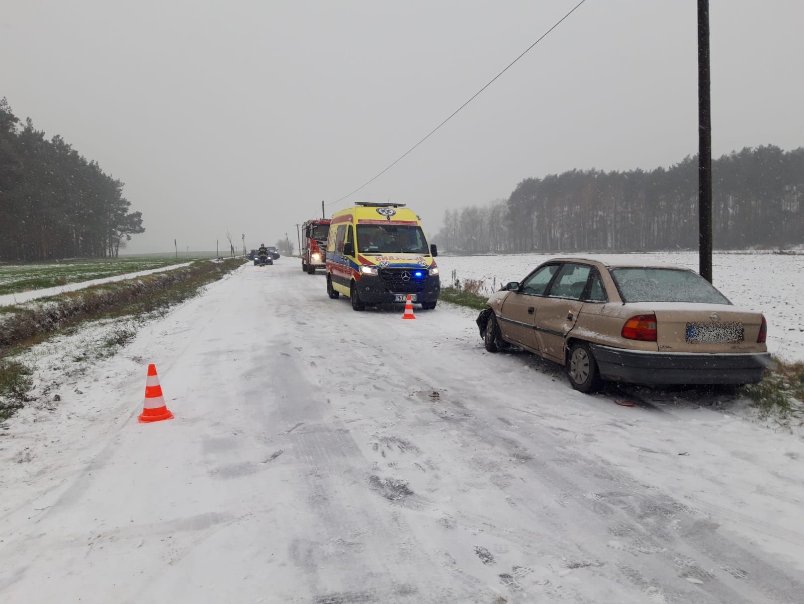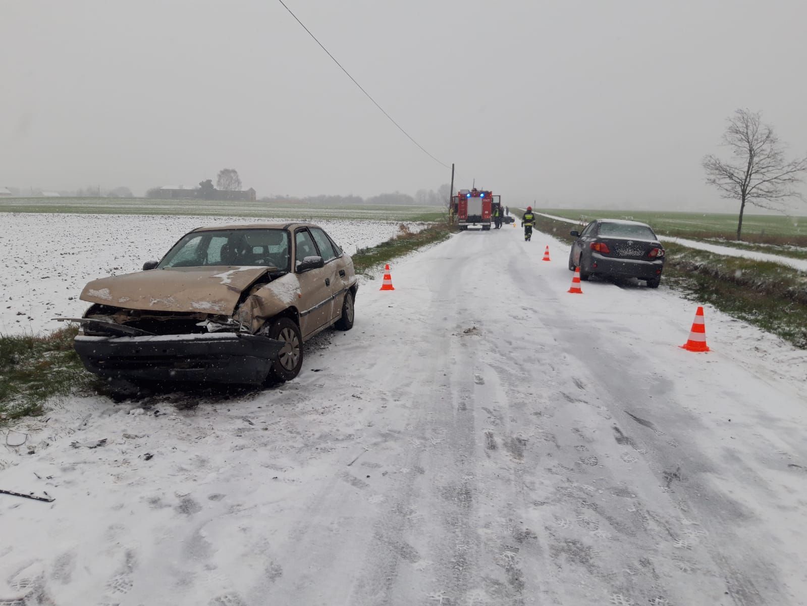 O godzinie 11:05 do Stanowiska Kierowania Komendanta Powiatowego PSP w Nowym Tomyślu wpłynęło z Centrum Powiadamiania Ratunkowego zgłoszenie o wypadku do jakiego doszło między miejscowościami Michorzewo – Buk. Z treści formatki wynikało, że samochód znajduje się w przydrożnym rowie, a osoba poszkodowana znajduje się w pojeździe. Do zdarzenia zadysponowane zostały trzy zastępy z JRG Nowy Tomyśl oraz zastęp OSP Kuślin. Podczas jazdy alarmowej do powyższego zgłoszenia strażacy najechali na inne zdarzenie między Różą, a Wąsowem. Brały w nim udział dwa samochody osobowe, którymi podróżowały cztery osoby. W wyniku trudnych warunków pogodowych oraz śliskiej nawierzchni jezdni doszło do zderzania. Kierowca Opla uskarżał się na ból w klatce piersiowej, w skutek czego przybyły na miejsce Zespół Ratownictwa Medycznego po przebadaniu zadecydował o przewiezieniu poszkodowanego do nowotomyskiego szpitala. Działania strażaków polegały na udzieleniu Kwalifikowanej Pierwszej Pomocy do czasy przybycia ZRM, odłączeniu akumulatorów w uszkodzonych pojazdach oraz usunięciu z jezdni pozostałości powypadkowych.