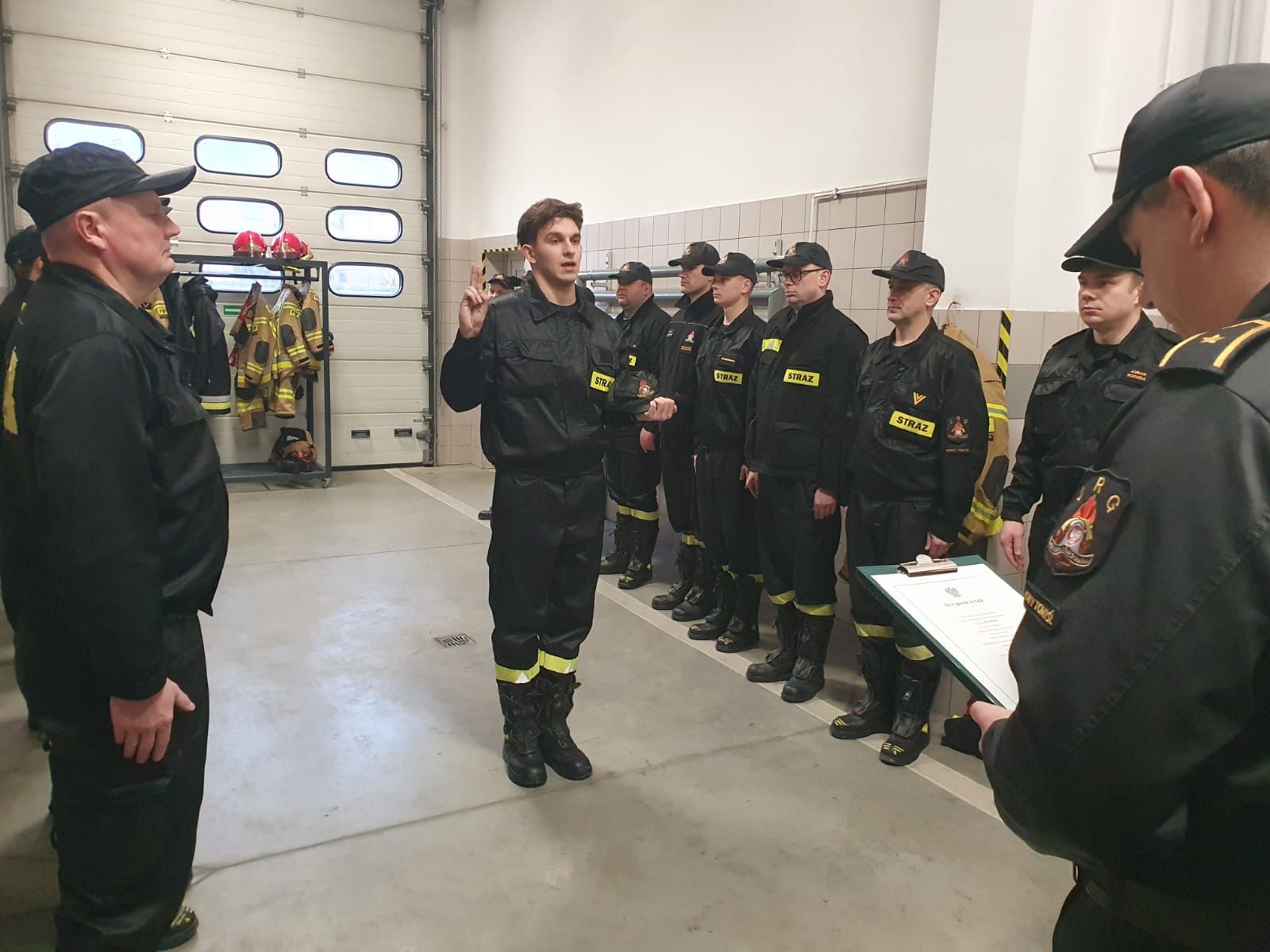 Ślubowanie przyjął Zastępca Komendanta Powiatowego PSP st. kpt. Jakub Kłosowski w obecności zastępcy dowódcy JRG oraz dwóch zmian służbowych.