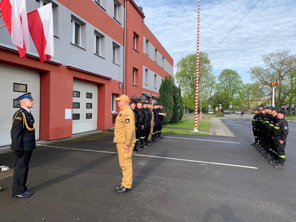 W uroczystej zmianie służby połączonej z apelem z okazji Dnia Flagi Rzeczypospolitej Polskiej udział wzięły dwie zmiany służbowe nowotomyskiej Jednostki Ratowniczo-Gaśniczej w obecności Zastępcy Komendanta Powiatowego PSP oraz d-cy JRG.