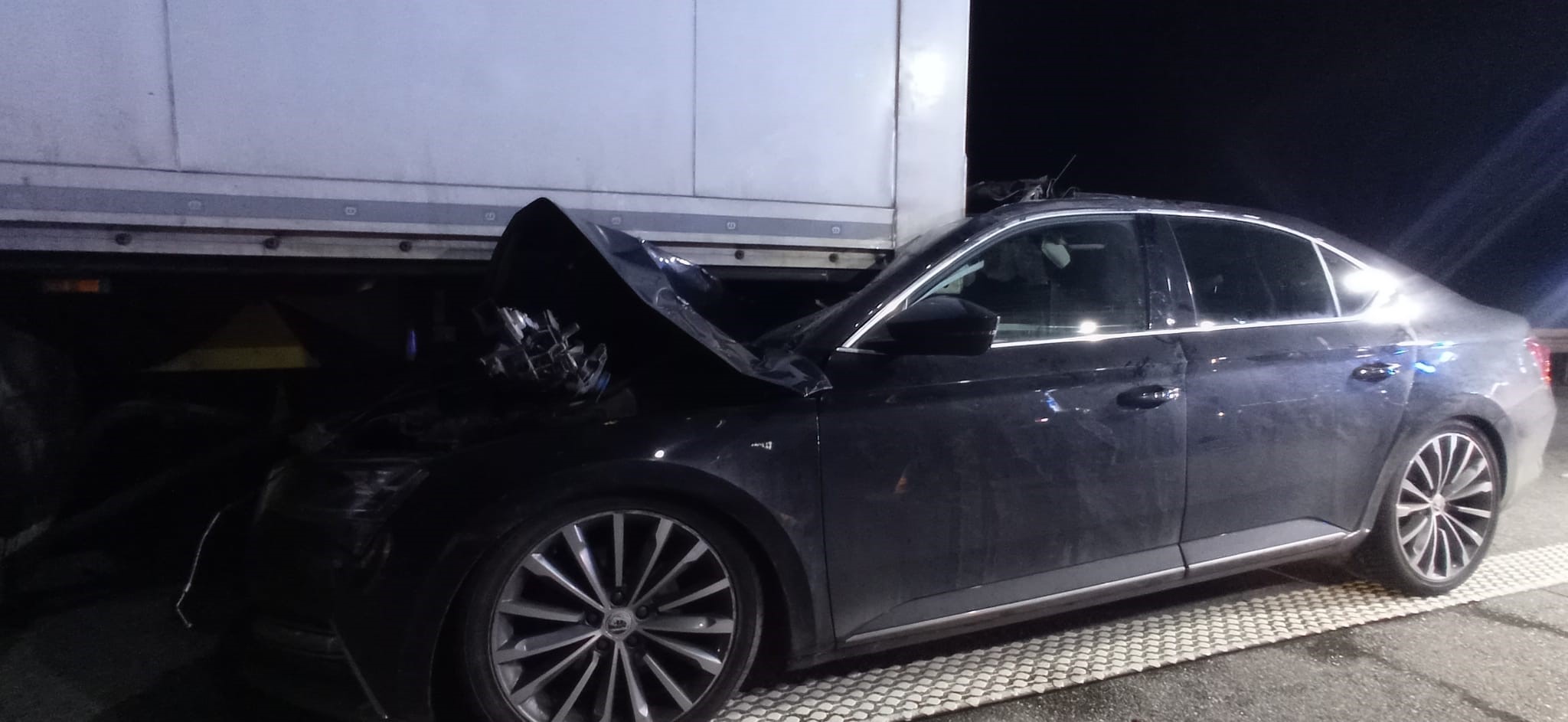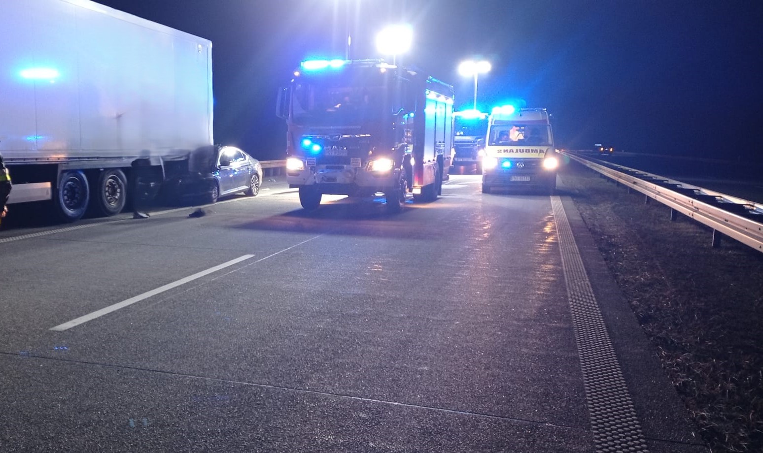 30 stycznia 2025 r. o godzinie 19:24 do Stanowiska Kierowania Komendanta Powiatowego w Nowym Tomyślu wpłynęło zgłoszenie o wypadku samochodu osobowego z samochodem ciężarowym na autostradzie A2 – 102,5 km, kierunek Warszawa.