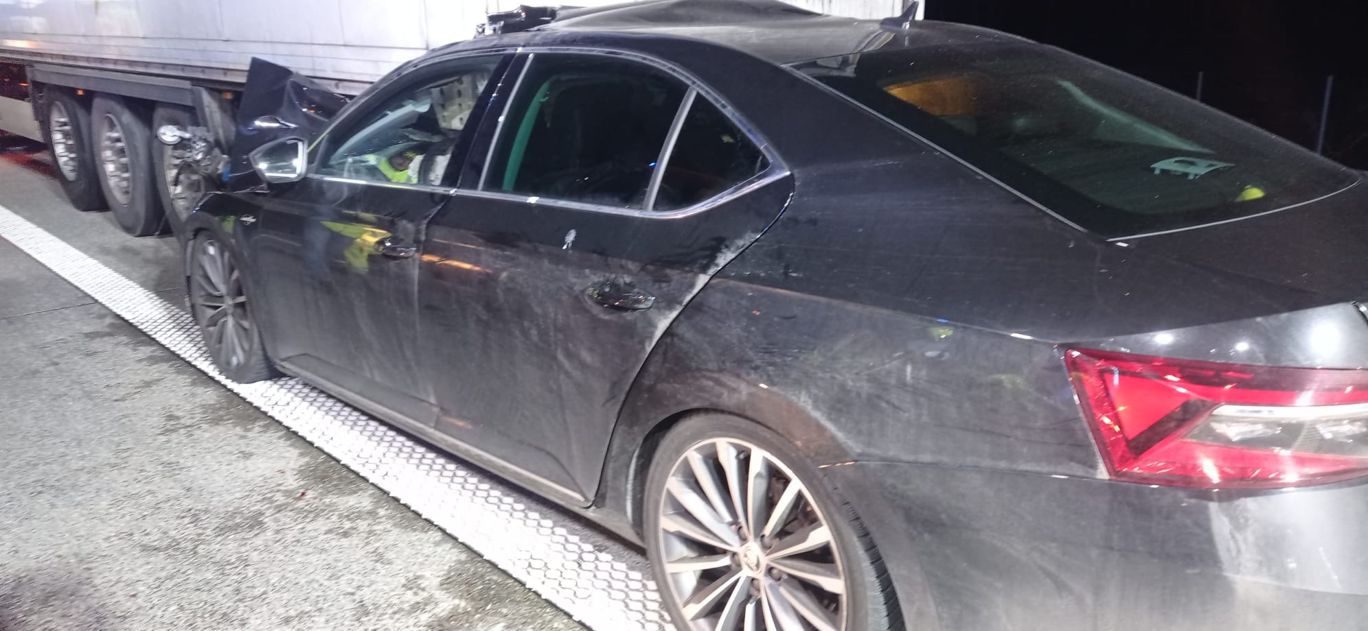 Po przybyciu zastępów straży pożarnej na miejsce zdarzenia zastano samochód osobowy który uderzył w naczepę tira. Obydwa pojazdy znajdowały się na pasie awaryjnym. Pojazdem osobowym podróżowało pięć osób, cztery z nich opuściły pojazd przed przebyciem służb, natomiast kierowca został ewakuowany i przekazany zespołowi medycznemu. Kierowca samochodu ciężarowego nie wymagał udzielenia pomocy.