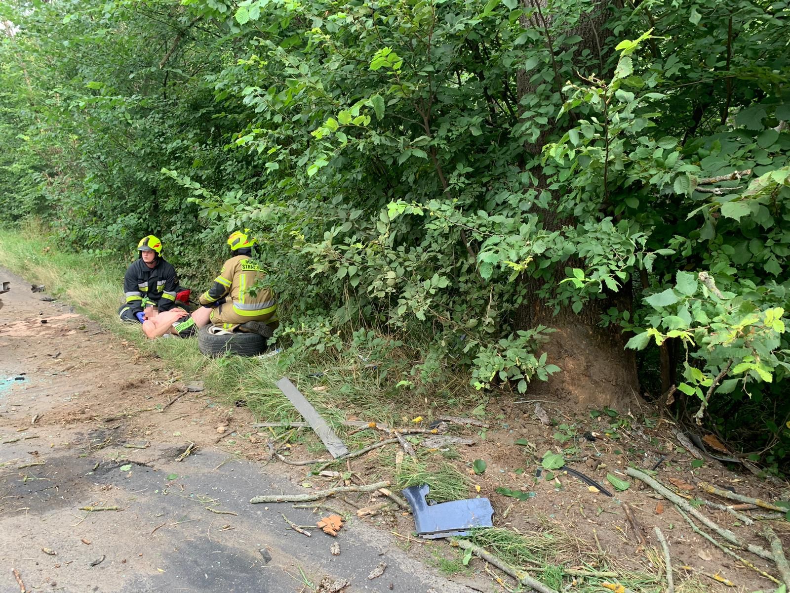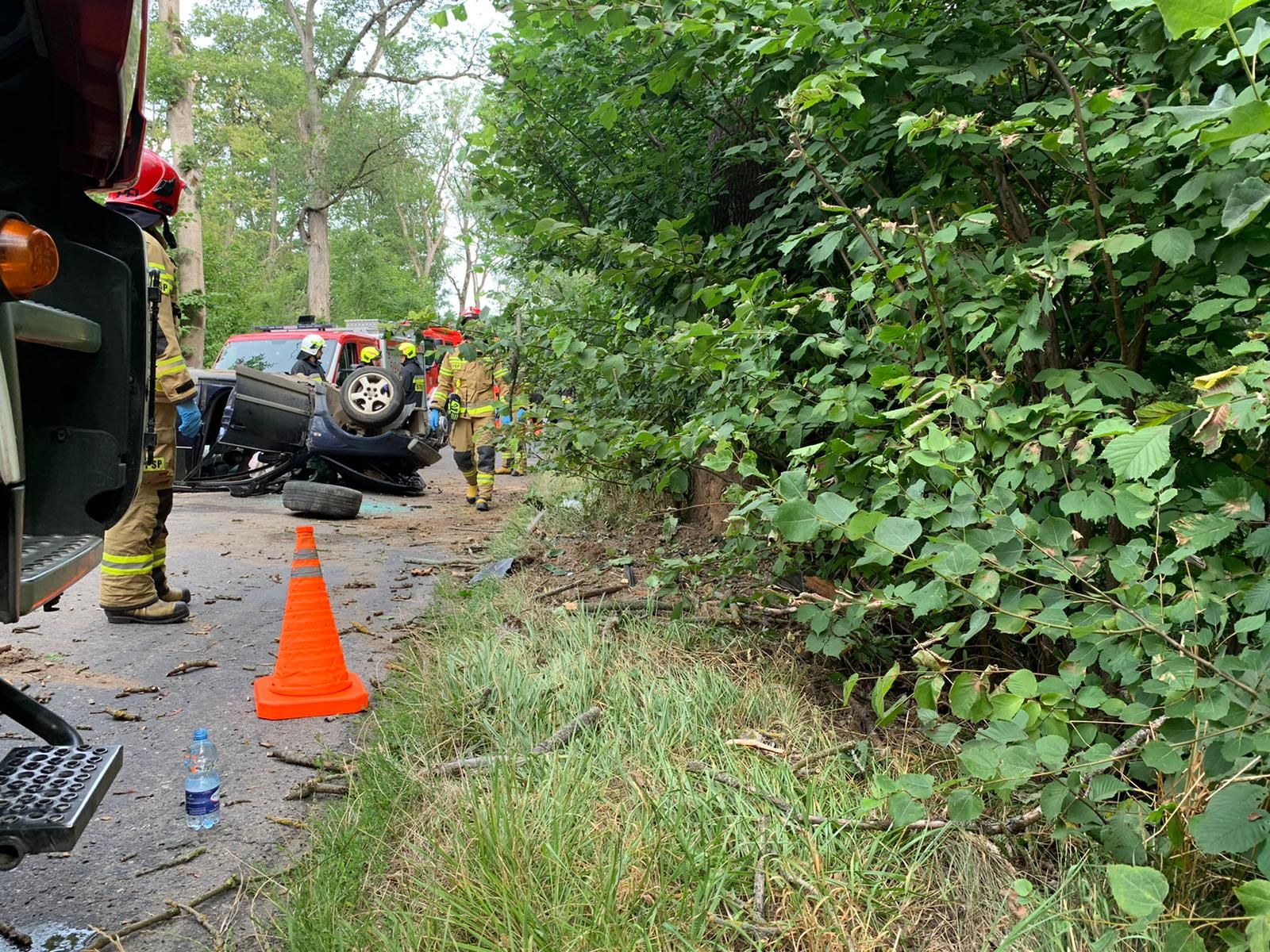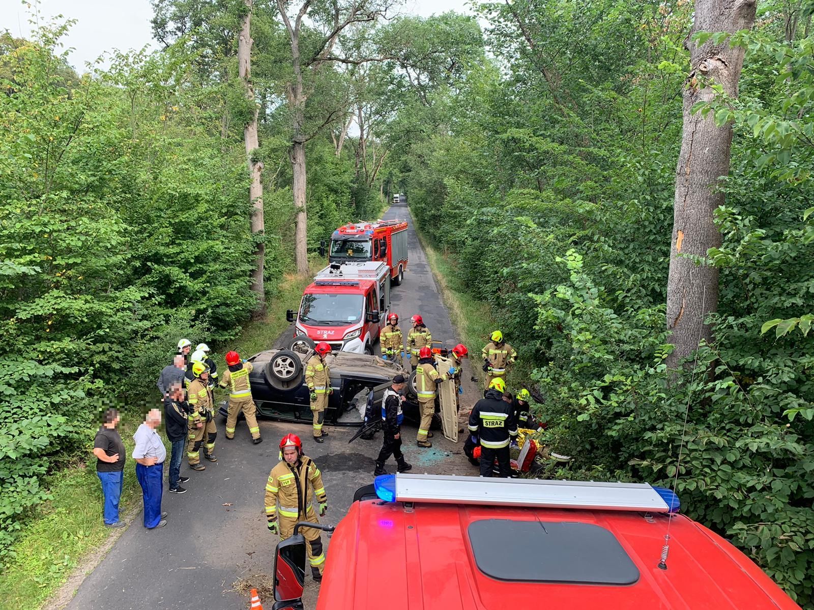 W dniu 26 lipca 2022 roku o godz. 8:41 do Stanowiska Kierowania Komendanta Powiatowego PSP w Nowym Tomyślu wpłynęło zgłoszenie: za Pakosławiem w kierunku Kuślin droga przez las auto dachowało, leży na dachu, jedna osoba w aucie przytomna zablokowany nie może wyjść aucie butla z gazem do kuchenki. Dyżurny SKKP do działań zadysponował dwa zastępy ratownictwa technicznego oraz samochód rozpoznawczo ratowniczy z Jednostki Ratowniczo-Gaśniczej w Nowym Tomyślu oraz dwa zastępy Ochotniczej Straży Pożarnej z Lwówka. Przed przyjazdem strażaków na miejsce zdarzenia, dyżurny SKKP skontaktował się z osobą zgłaszającą, od której uzyskał dokładne informacje co do miejsca zdarzenia oraz stanu osoby poszkodowanej. Po przybyciu zastępów straży pożarnej na miejsce zdarzenia zastano samochód osobowy leżący na dachu w poprzek drogi, pojazdem podróżowała jedna osoba, która w chwili przybycia na miejsce zastępów straży pożarnej znajdowała się poza pojazdem. Była przytomna i kontaktowa, jednak uskarżająca się na ból biodra. Działania strażaków polegały na zabezpieczeniu miejsca zdarzenia, odłączeniu akumulatora oraz zakręceniu zaworu butli instalacji LPG, wyjęto z pojazdu nieuszkodzoną butlę z gazem propan-butan, udzieleniu kwalifikowanej pierwszej pomocy osobie poszkodowanej: unieruchomienie w pozycji zastanej, wsparciu psychicznym oraz termoizolacji. Dalsze działania polegały na postawieniu pojazdu na koła oraz usunięciu zanieczyszczeń powypadkowych z drogi. Przybyły na miejsce Zespół Ratownictwa Medycznego podjął decyzję o przewiezieniu osoby poszkodowanej do szpitala w Nowym Tomyślu.