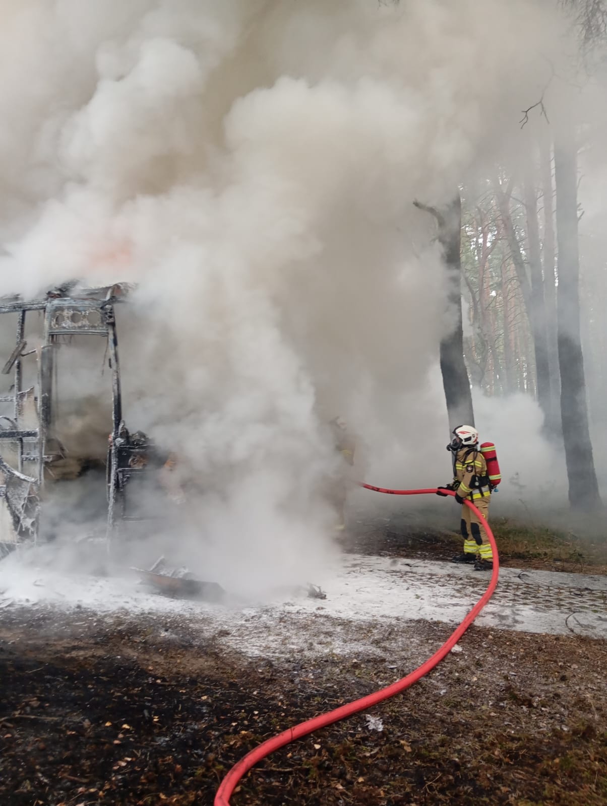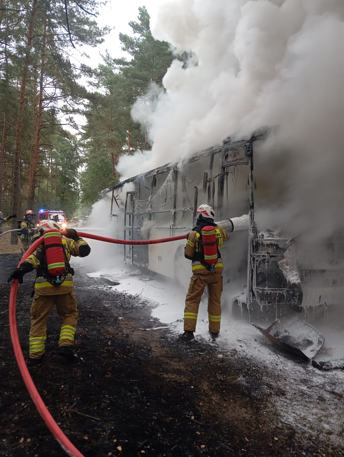 Po przybyciu na miejsce zdarzenia zastano w pełni rozwinięty pożar autobusu szkolnego. Pojazdem podróżowały dwie grupy dzieci przedszkolnych wraz z opiekunami. Wszystkie osoby opuściły pojazd przed przybyciem zastępów straży pożarnej i znajdowały się w odległości około 150 m od palącego się autobusu. Wycieczka zmierzała do gospodarstwa agroturystycznego, oddalonego o około 350 m od miejsca zdarzenia, gdzie zaplanowano były zajęcia edukacyjne. Ogień rozprzestrzenił się również na pobliskie drzewa oraz ściółkę.