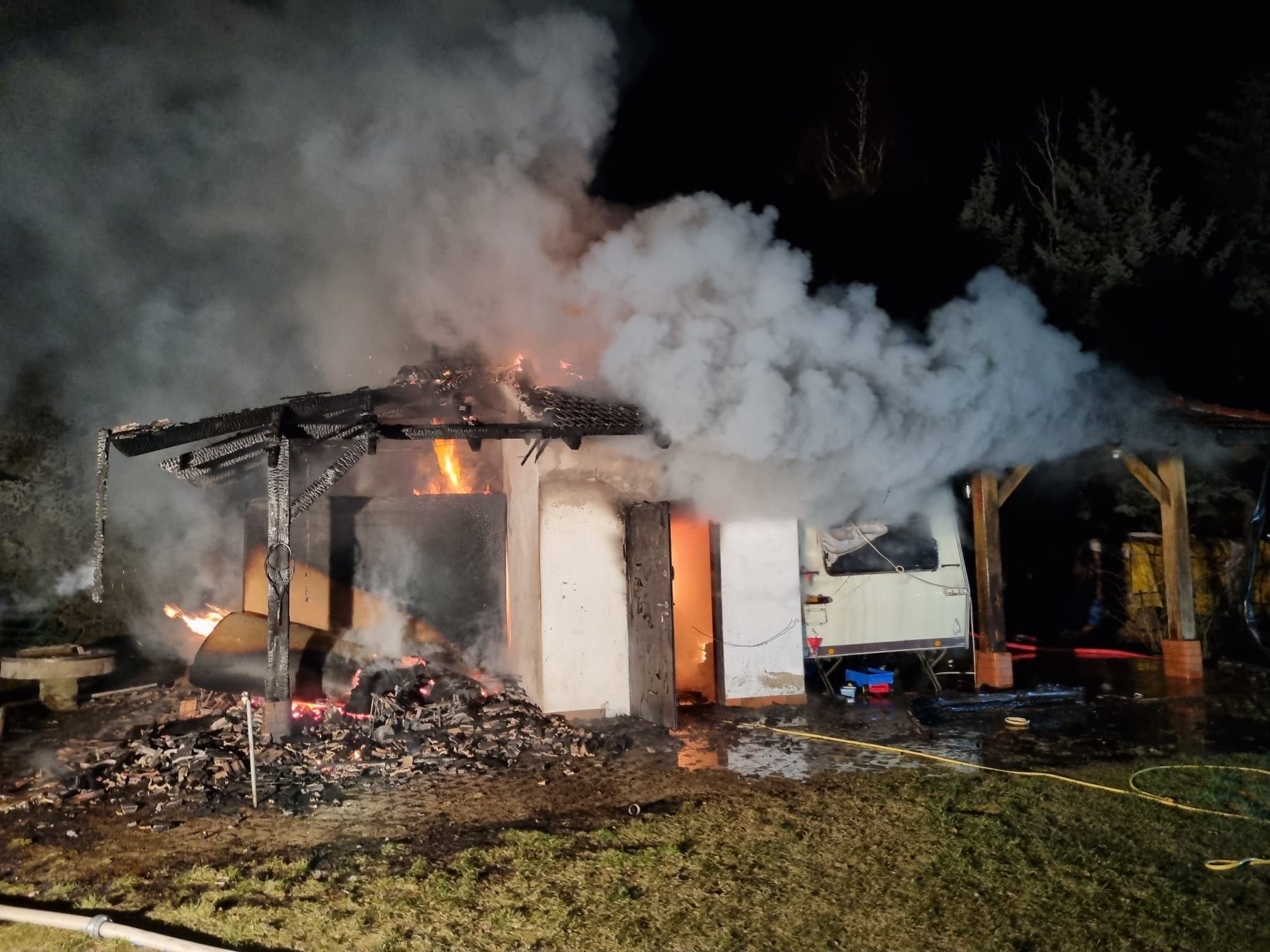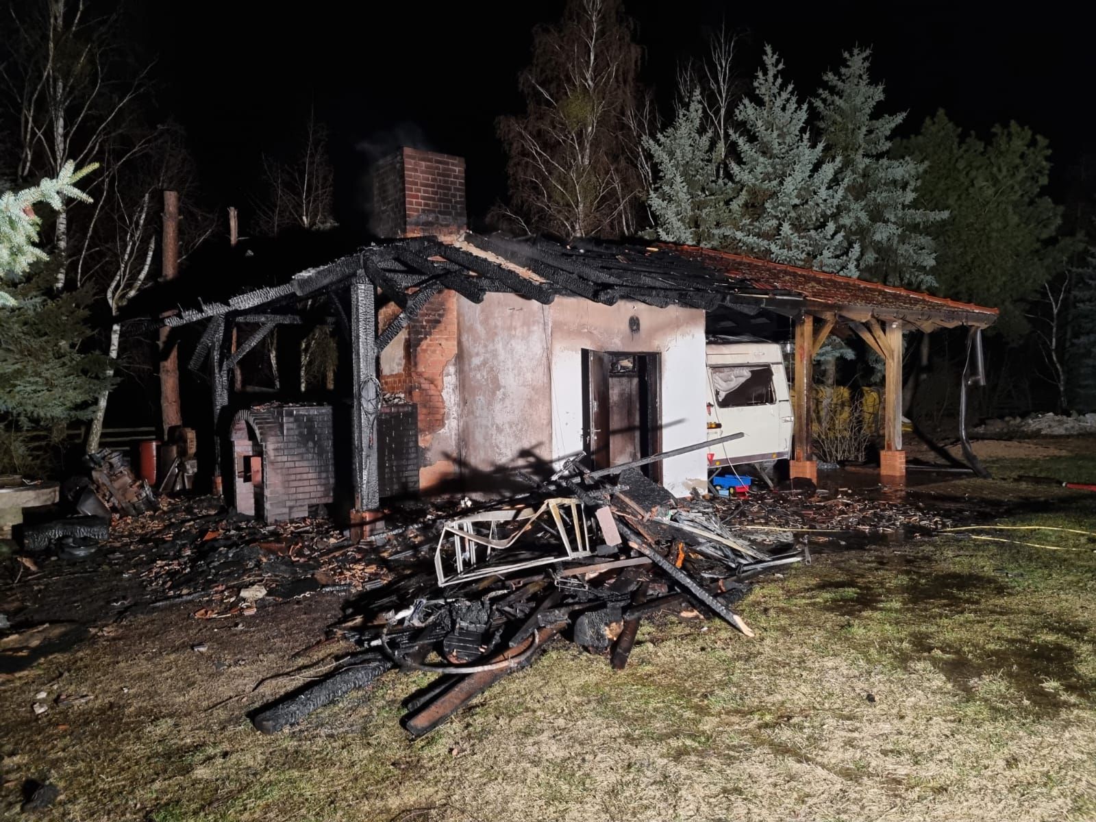 W dniu 10 marca 2022 roku o godz. 20:30 do Stanowiska Kierowania Komendanta Powiatowego PSP w Nowym Tomyślu wpłynęło zgłoszenie o pożarze budynku gospodarczego w miejscowości Piotry gm. Miedzichowo. Z informacji od osoby zgłaszającej wynikało, że w obiekcie nie ma zwierząt oraz osób poszkodowanych. Dyżurny SKKP do działań zadysponował zastęp gaśniczy z Jednostki Ratowniczo Gaśniczej w Nowym Tomyślu oraz zastępy z jednostek Ochotniczej Straży Pożarnej z Miedzichowa, Bolewic i Jabłonki Starej. Po przybyciu pierwszych zastępów na miejsce zdarzenia zastano budynek gospodarczy wysoki na ok. 5m objęty w całości ogniem. Wewnątrz budynku znajdowała się przyczepa kempingowa. Działania strażaków polegały na zabezpieczeniu miejsca zdarzenia oraz podaniu trzech prądów wody w natarciu na palący się budynek. Po stłumieniu ognia przystąpiono do rozbiórki budynku i dogaszania tlących się elementów. Po zakończeniu działań gaśniczych pogorzelisko sprawdzono kamerą termowizyjną, która nie wykazała zagrożeń.