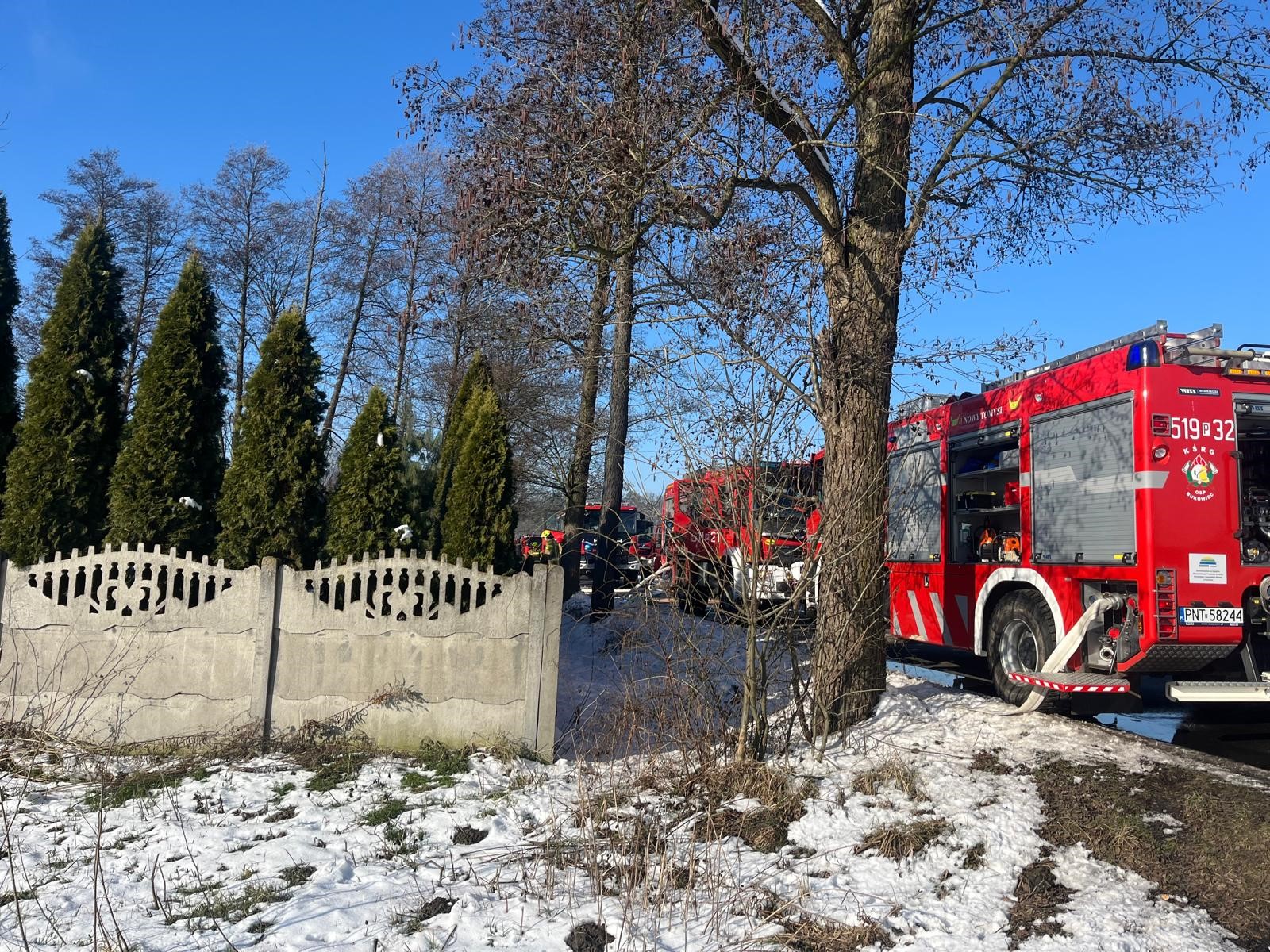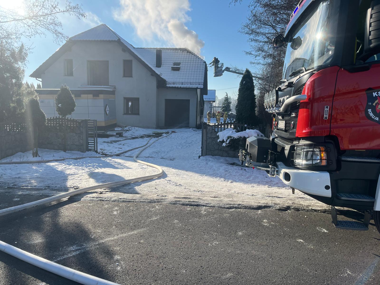 Po przybyciu zastępów straży pożarnej na miejsce zdarzenia zastano pożar elewacji oraz ukryty pożar konstrukcji dachowej w budynku. Na miejscu znajdował się właściciel który podjął próbę gaszenia z drabiny niestety w wyniku upadku wymagał udzielenia kalifikowanej pierwszej pomocy.