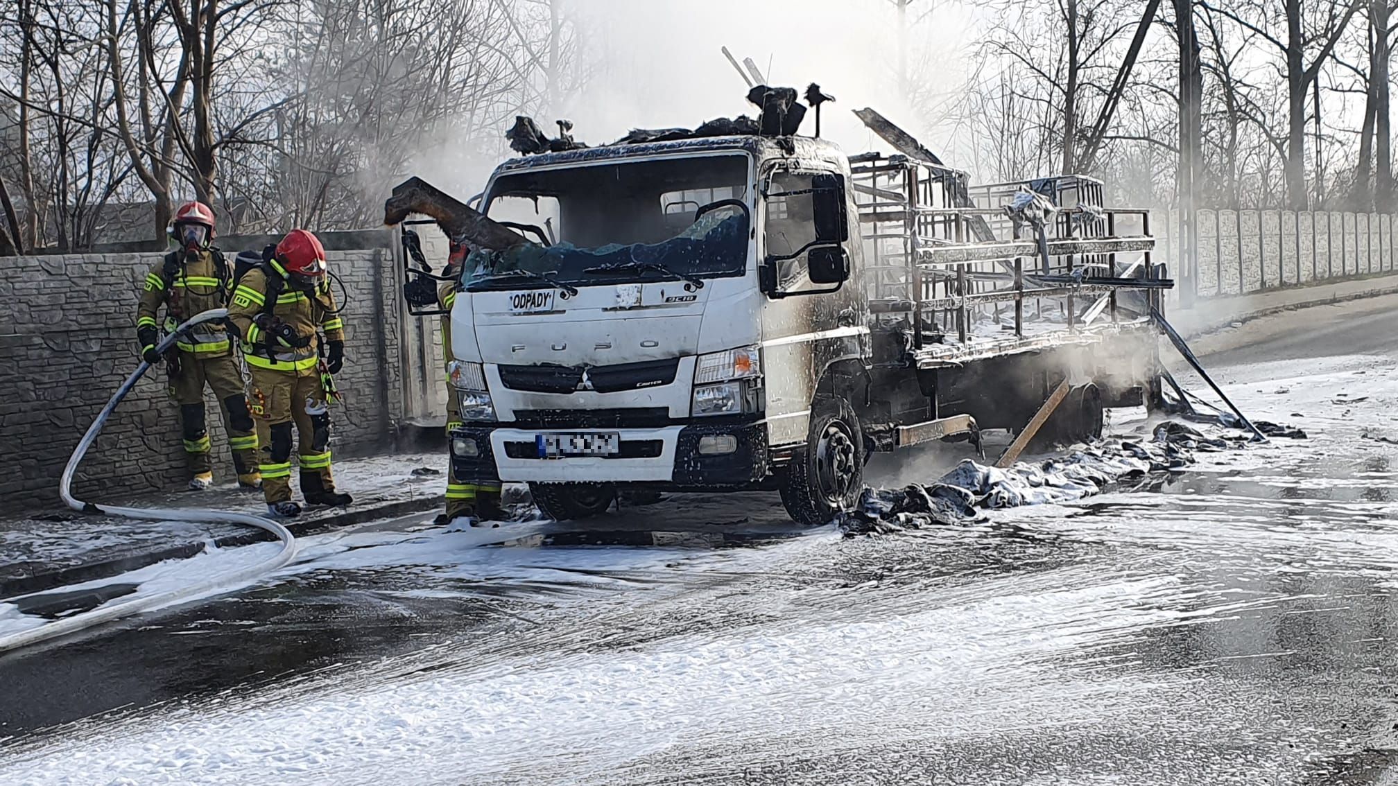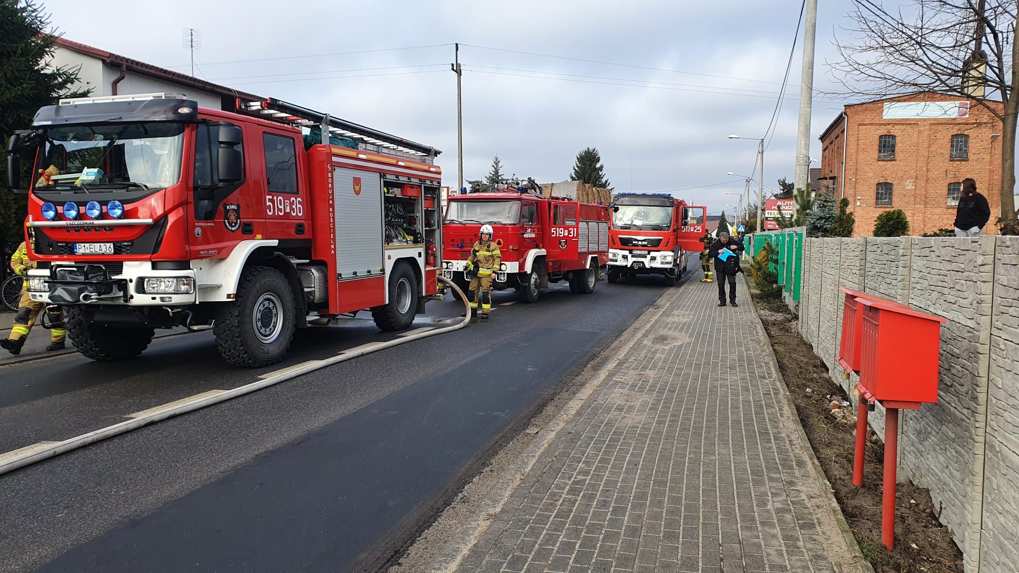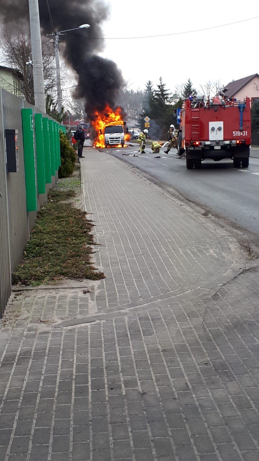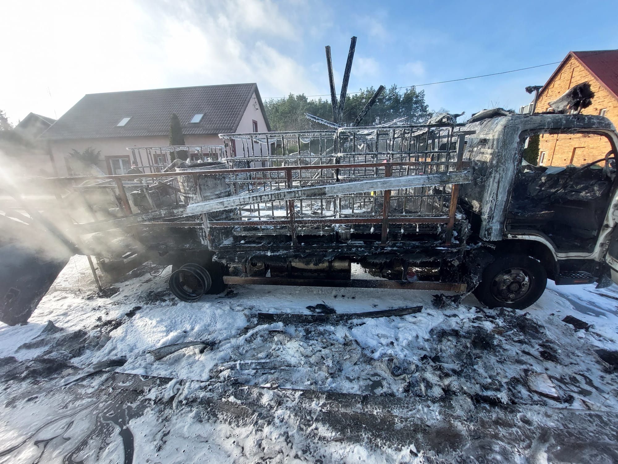 W dniu 19 stycznia 2022 roku o godz. 10:35 do Stanowiska Kierowania Komendanta Powiatowego PSP w Nowym Tomyślu wpłynęło zgłoszenie o pożarze samochodu ciężarowego w centrum Borui Kościelnej. Dyżurny SKKP do działań zadysponował zastęp gaśniczy z Jednostki Ratowniczo – Gaśniczej w Nowym Tomyślu oraz kolejne dwa zastępy gaśnicze z jednostki Ochotniczej Straży Pożarnej w Borui Kościelnej. Po przybyciu straży pożarnej na miejsce zdarzenia zastano samochód dostawczy całkowicie w ogniu, stojący na pasie jezdni. Kierowca znajdował się poza pojazdem i nie wymagał pomocy medycznej. W części transportowej samochód przewoził trzy puste pojemniki typu MAUSER oraz pompę do substancji ciekłych. Działania strażaków polegały na zabezpieczeniu miejsca zdarzenia, podaniu w natarciu dwóch prądów piany ciężkiej na palący się samochód. Po ugaszaniu pożaru przystąpiono do dogaszania pojedynczych ognisk pożaru, następnie całe auto sprawdzono kamerą termowizyjną, która nie wykazała dodatkowych zagrożeń. Dalsze działania polegały na przesunięciu samochodu na pobocze przy pomocy ładowarki teleskopowej, którą przyjechał na miejsce jeden z mieszkańców miejscowości. Następnie przy użyciu wody usunięto z jezdni pozostałości po pożarowe.