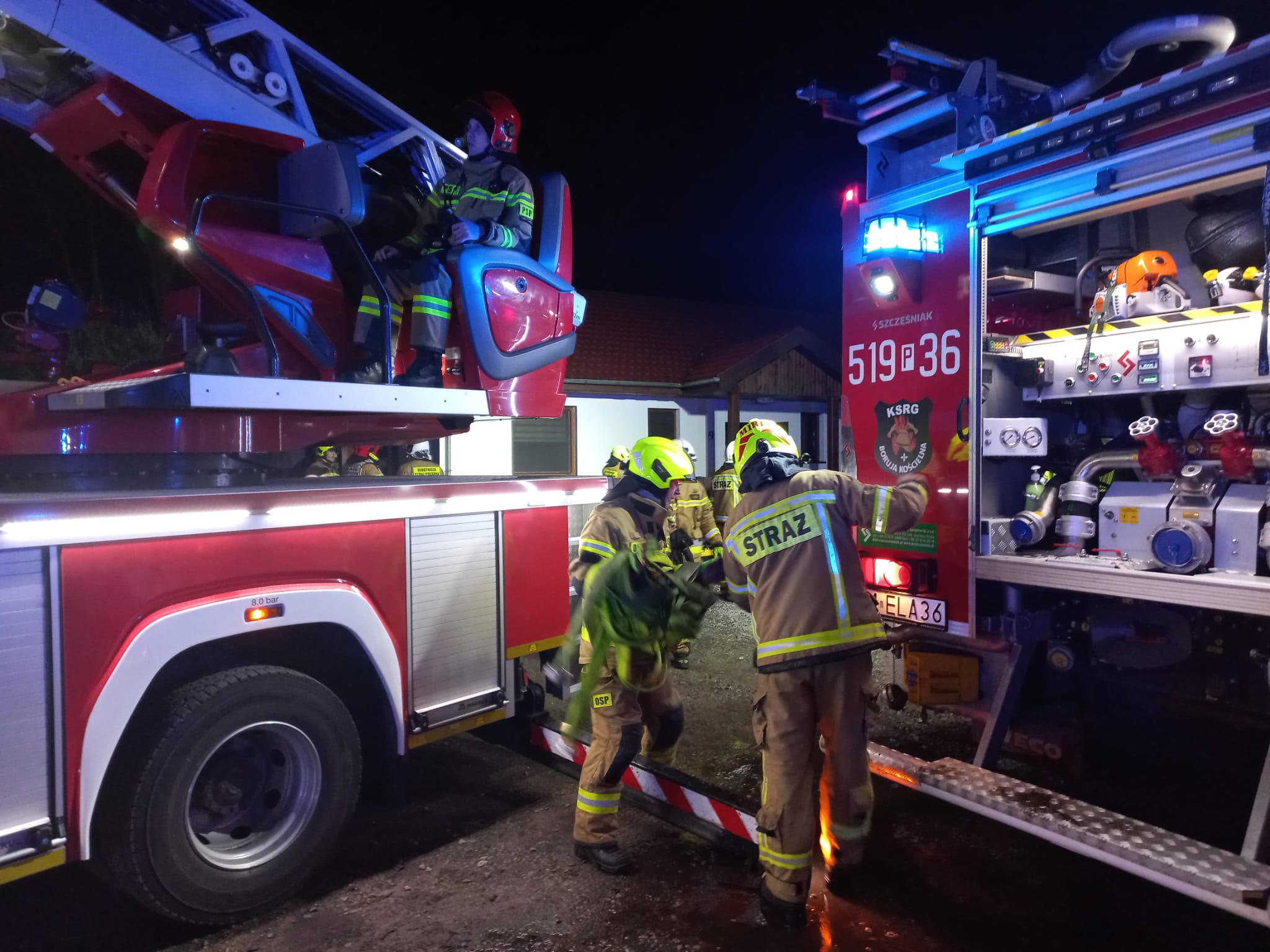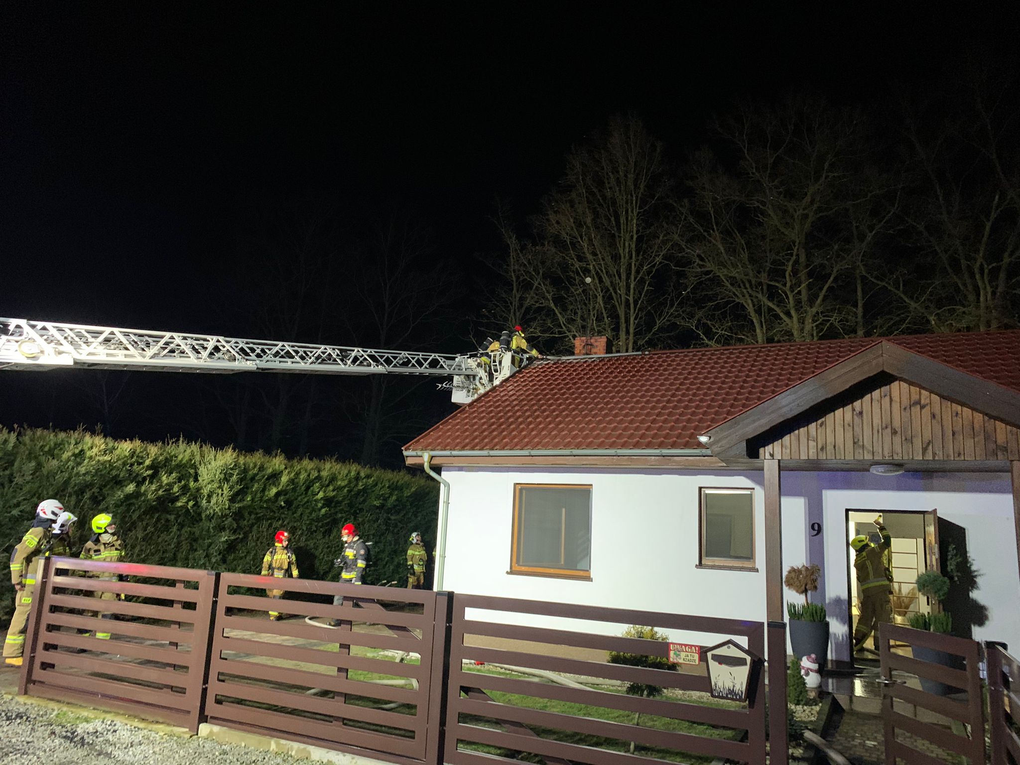 Po przyjeździe pierwszego zastępu na miejsce zdarzenia zastano palącą się elewację ściany szczytowej oraz częściowo więźbę poddasza budynku jednorodzinnego. Mieszkańcy opuścili budynek przed przybyciem Straży Pożarnej.