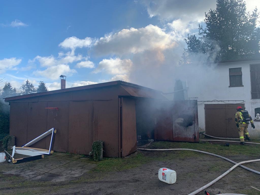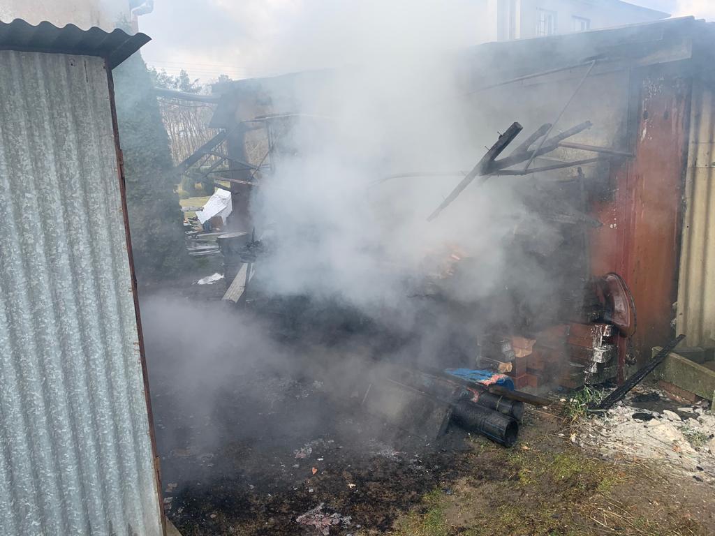 Po przybyciu na miejsce zdarzenia jednostek straży pożarnej zastano pożar blaszanego garażu. Budynek o konstrukcji stalowej z dachem częściowo drewnianym. Działania Straży Pożarnej polegały na zabezpieczeniu miejsca zdarzenia, podaniu 1 prądu wody w natarciu na pożar oraz 1 prądu wody w obronie na sąsiedni garaż blaszany. Po lokalizacji pożaru przystąpiono do wynoszenia spalonych elementów wyposażenia garażu oraz dogaszenia. Na koniec działań obiekt objęty pożarem został sprawdzony kamerą termowizyjną - brak zagrożeń.