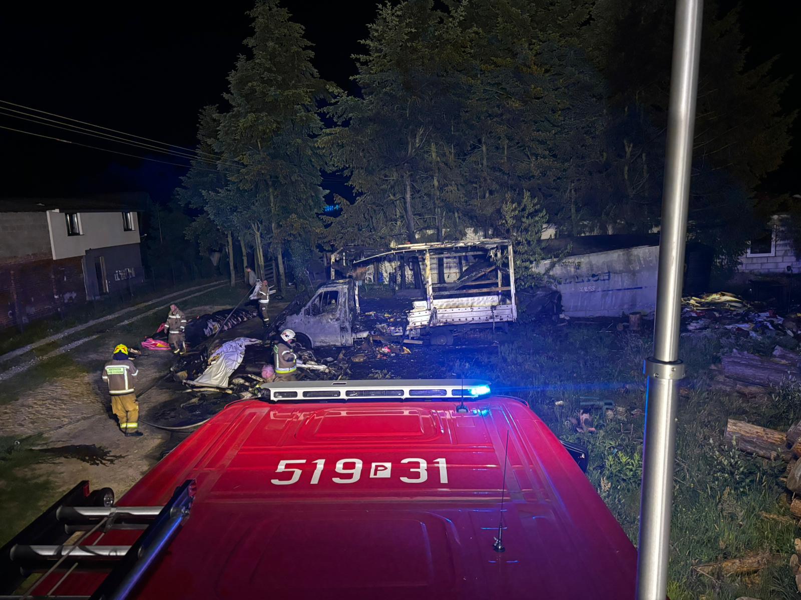 Działania strażaków polegały na zabezpieczeniu miejsca zdarzenia, oświetleniu terenu akcji, podaniu jednego prądu wody w obronie budynku mieszkalnego oraz podaniu jednego prądu wody na palący się kontener i samochód. W dalszej części działań przystąpiono do wyciągania spalonych materiałów z kontenera i dogaszaniu ich. Podczas działań została udzielona kwalifikowana pierwsza pomoc mężczyźnie, który wskutek zdarzenia źle się poczuł. Na miejsce został zadysponowany zespół ratownictwa medycznego, który po przybyciu na miejsce zdarzenia przebadał mężczyznę i decyzją lekarza został zabrany do szpitala. Na koniec działań teren pożaru i budynek mieszkalny sprawdzono kamerą termowizyjną pod kątek wystąpienia sygnatur ciepła, brak zagrożeń. Przyczynę powstania pożaru ustala Policja.